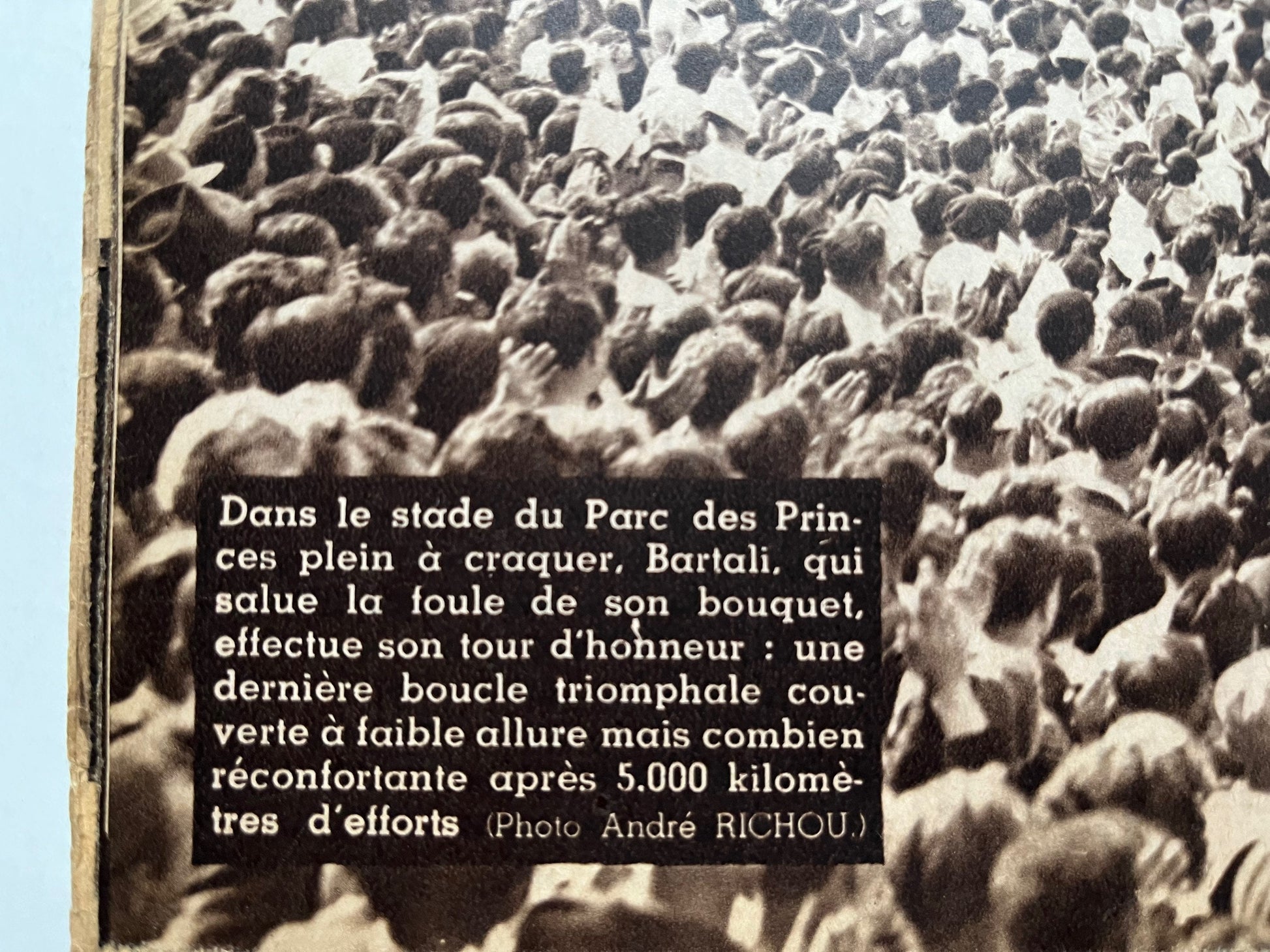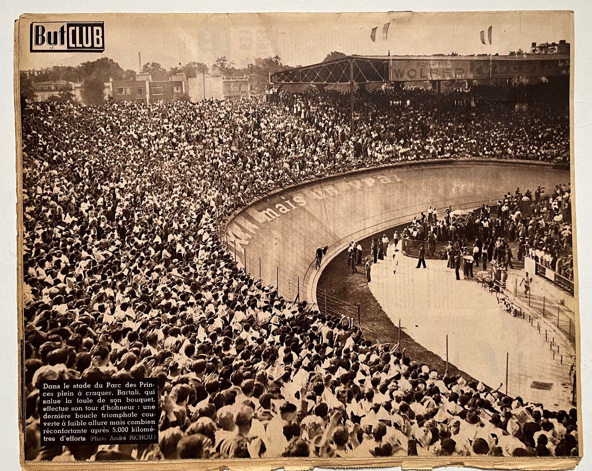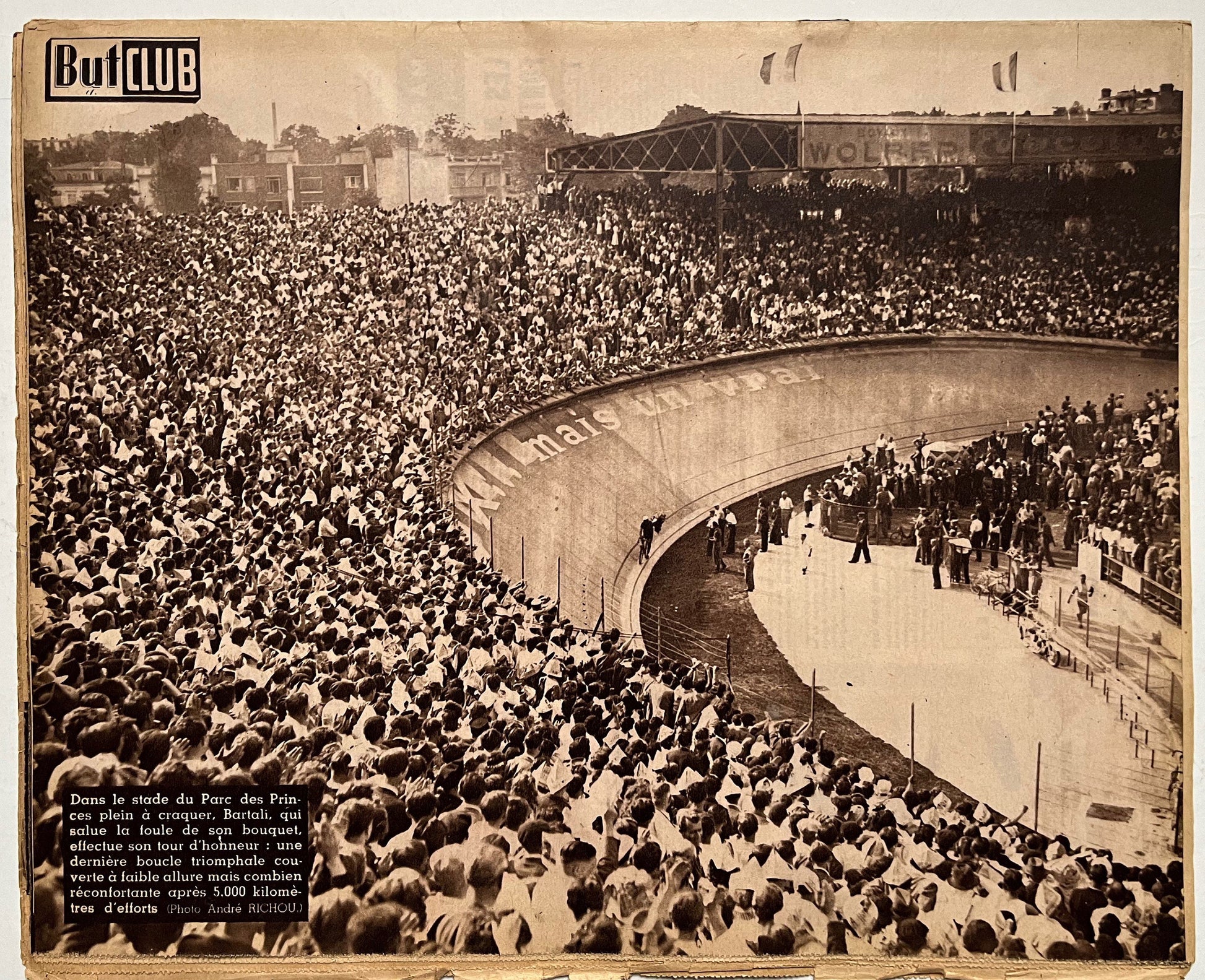 Very rare original 1948 cycling magazine print featuring cycling legend Gino Bartali doing a solo lap of the Parc des princes after his win in the Tour de France that year..  Would look excellent framed.