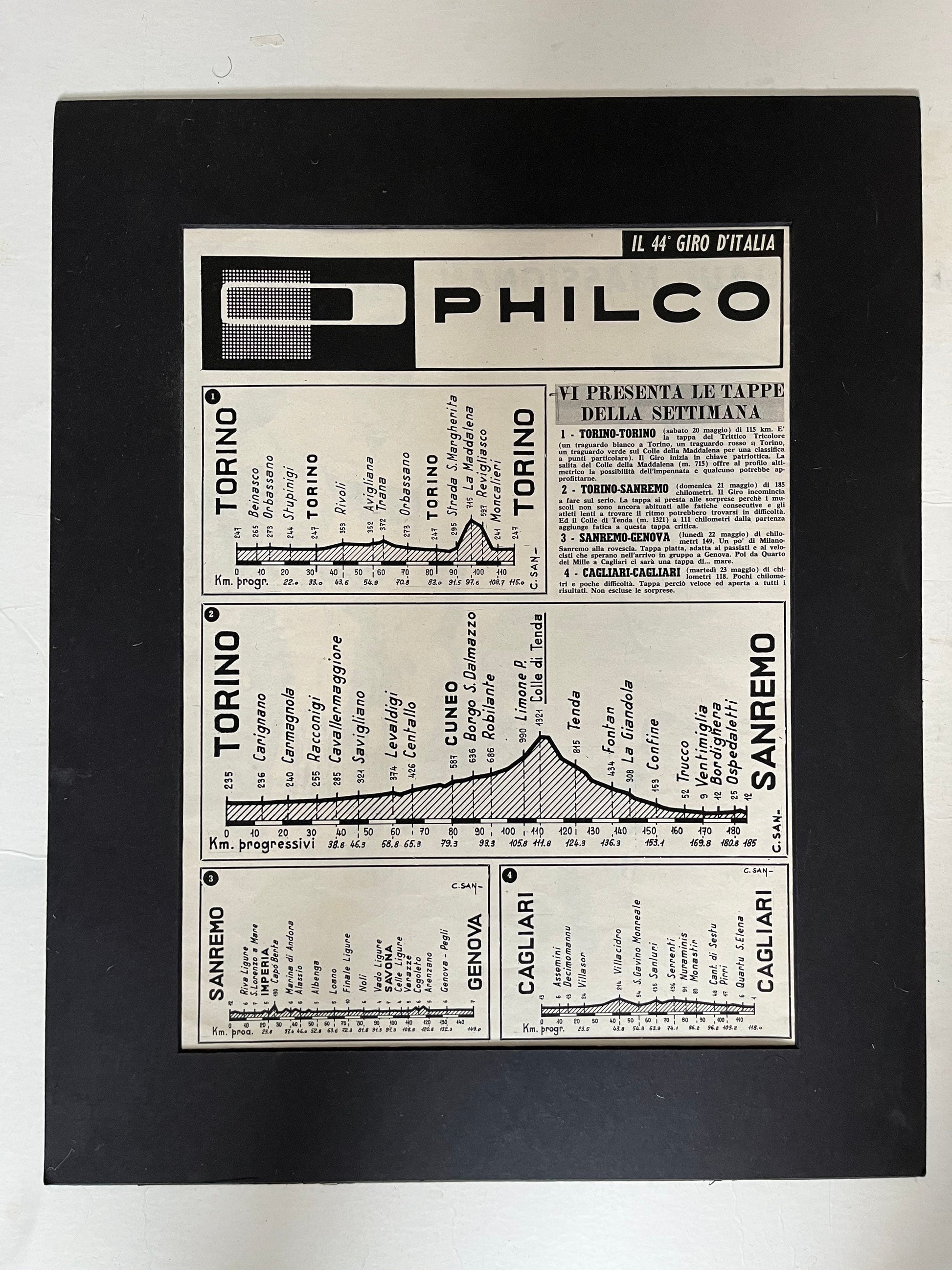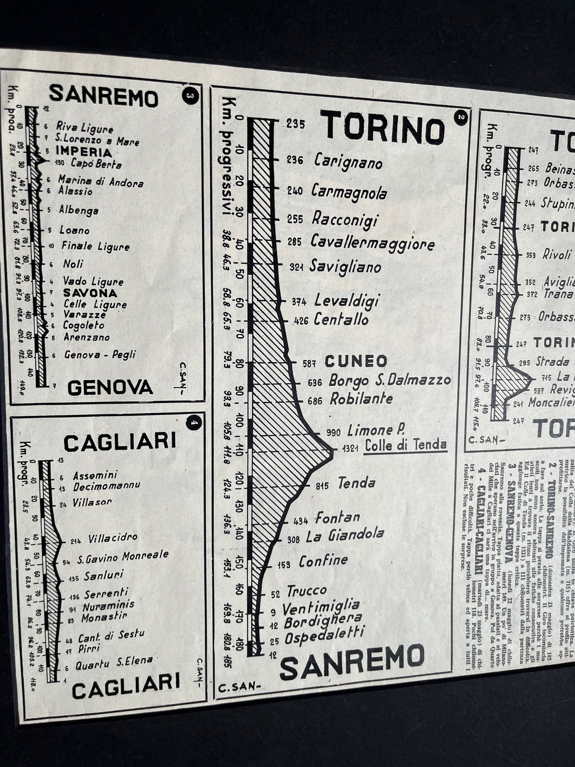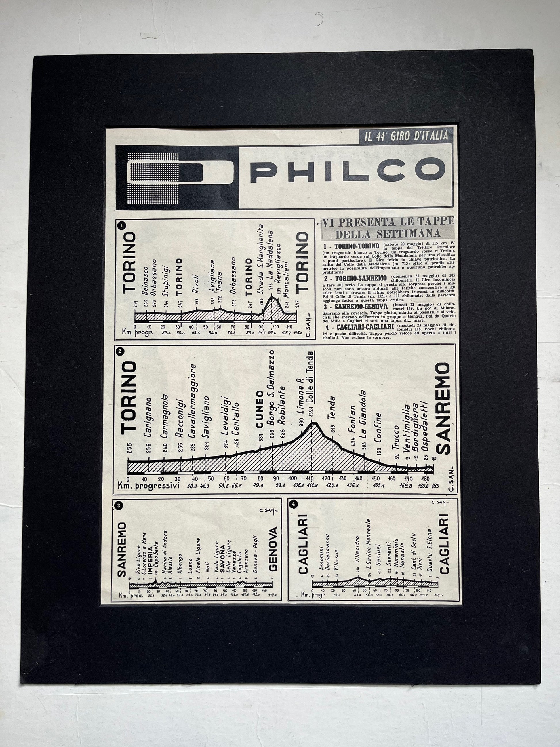 Vintage Cycling Print - Giro d’Italia Stages Map, Turin San Remo, Cagliari, 1961