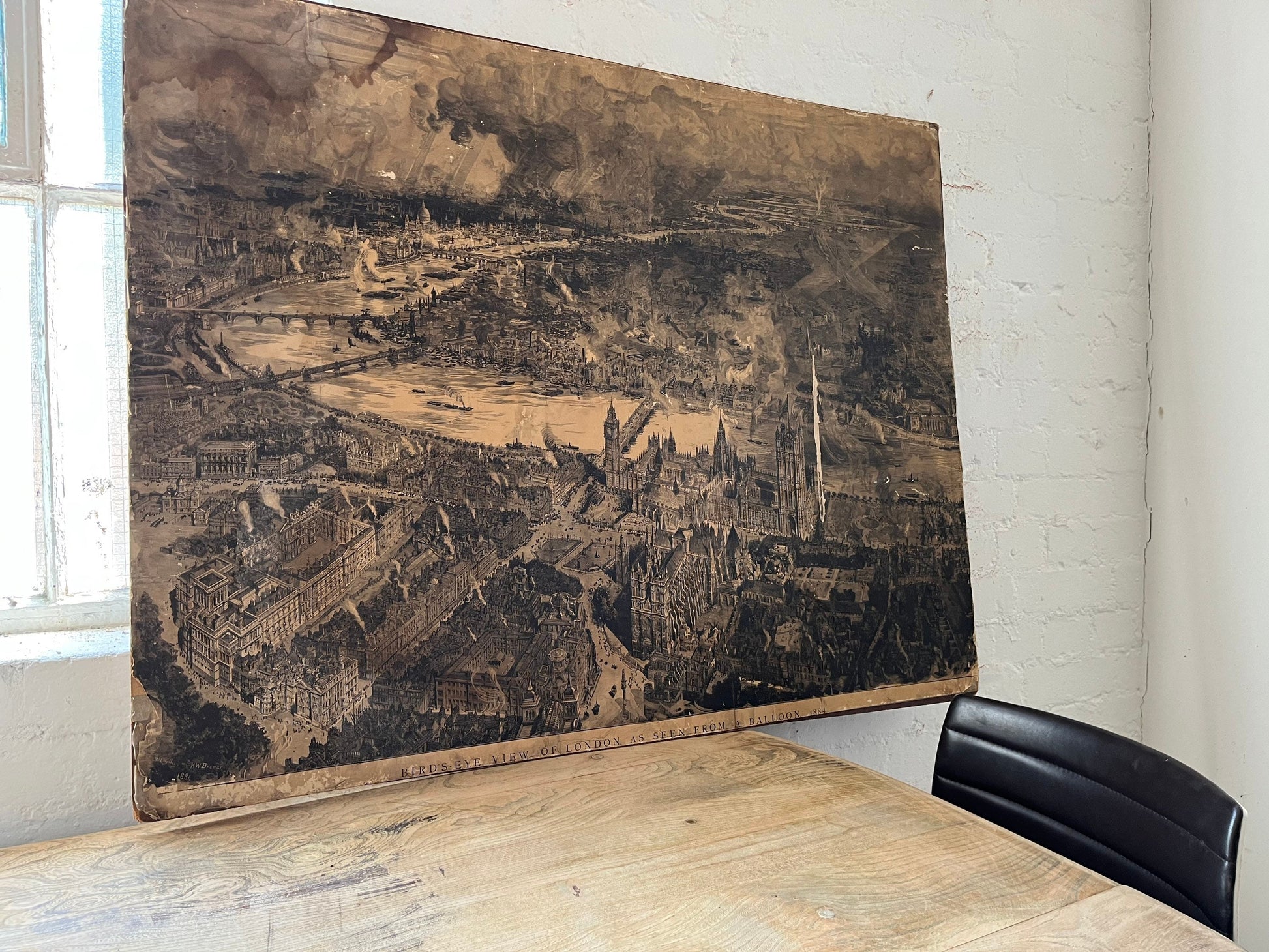 Vintage Victorian Monochrome Print - Exceptionally Rare Hand Drawn Print - Aerial View of London', Signed by Artist, H. Brewer 1884
