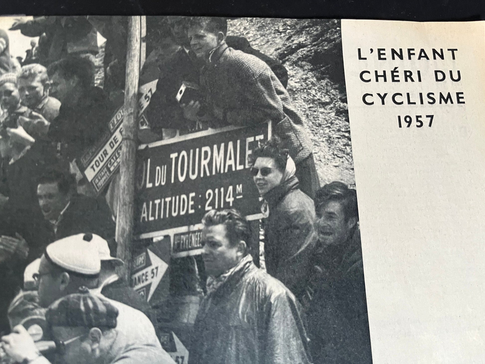 Iconic and very rare Original 1957 French cycling magazine print featuring cycling legend Jacques Anquetil riding in the french alps in the Tour de France.