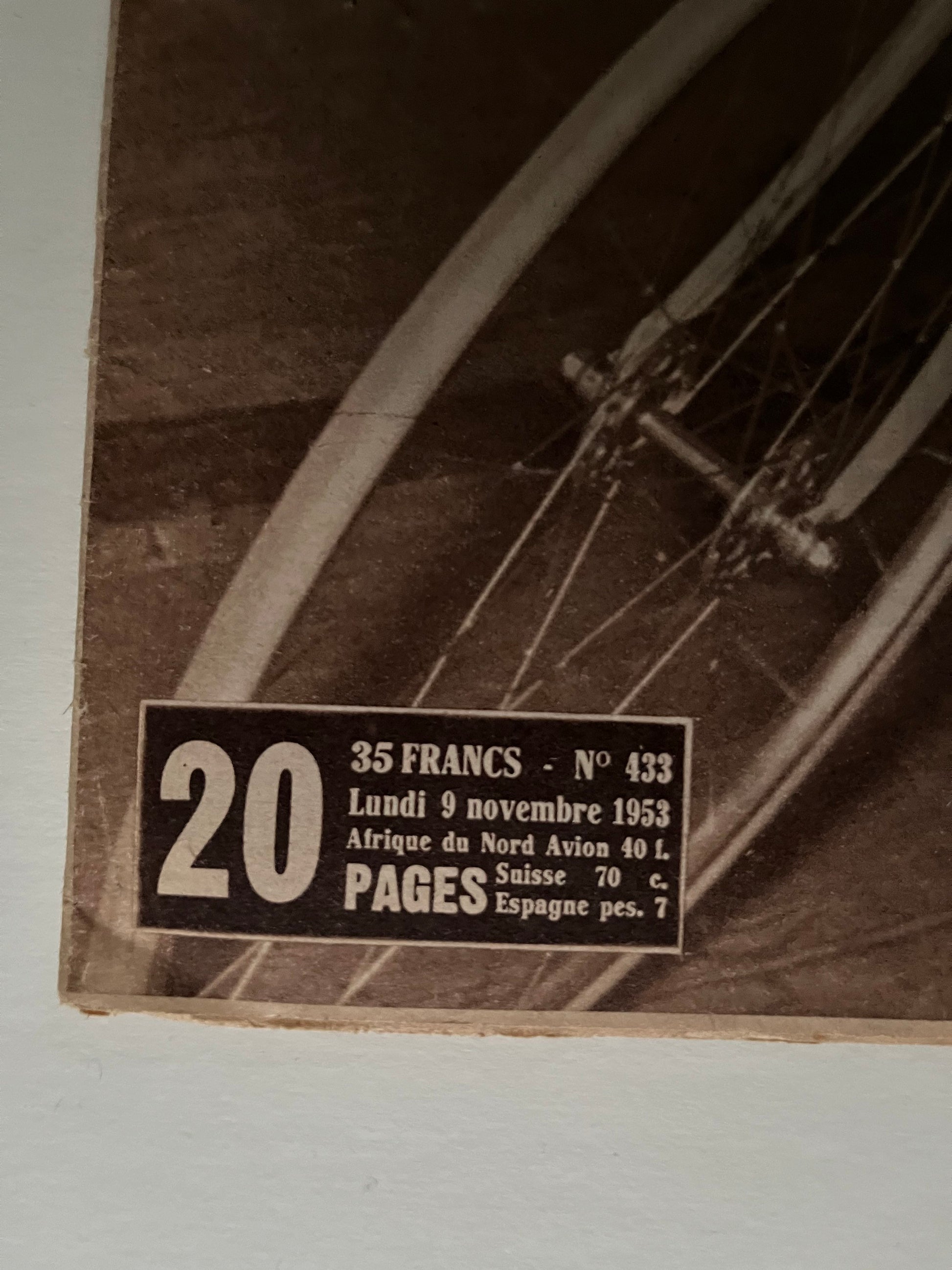 Iconic and very rare Original 1953 French cycling magazine print featuring cycling legend Jacques Anquetil competing against Fausto Coppi on the track.