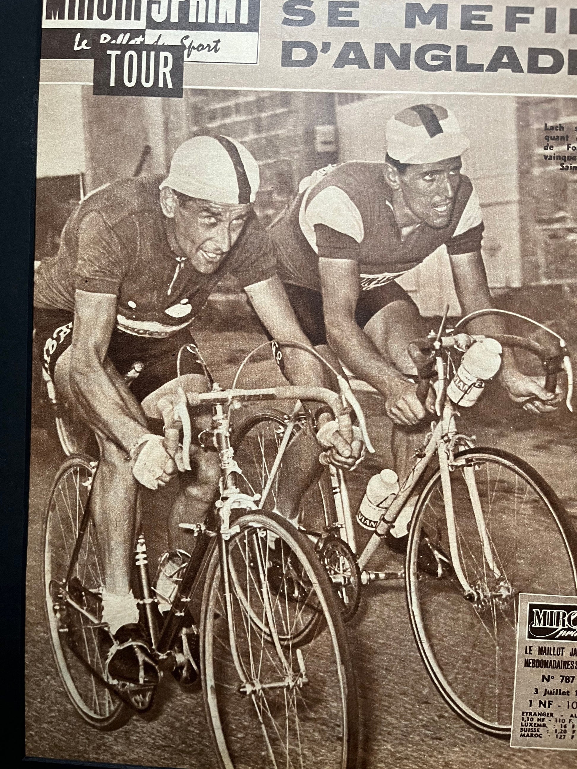 Iconic and very rare Original 1961 French cycling magazine print featuring cycling legend Jacques Anquetil competing in the Tour de France, which he won that year .