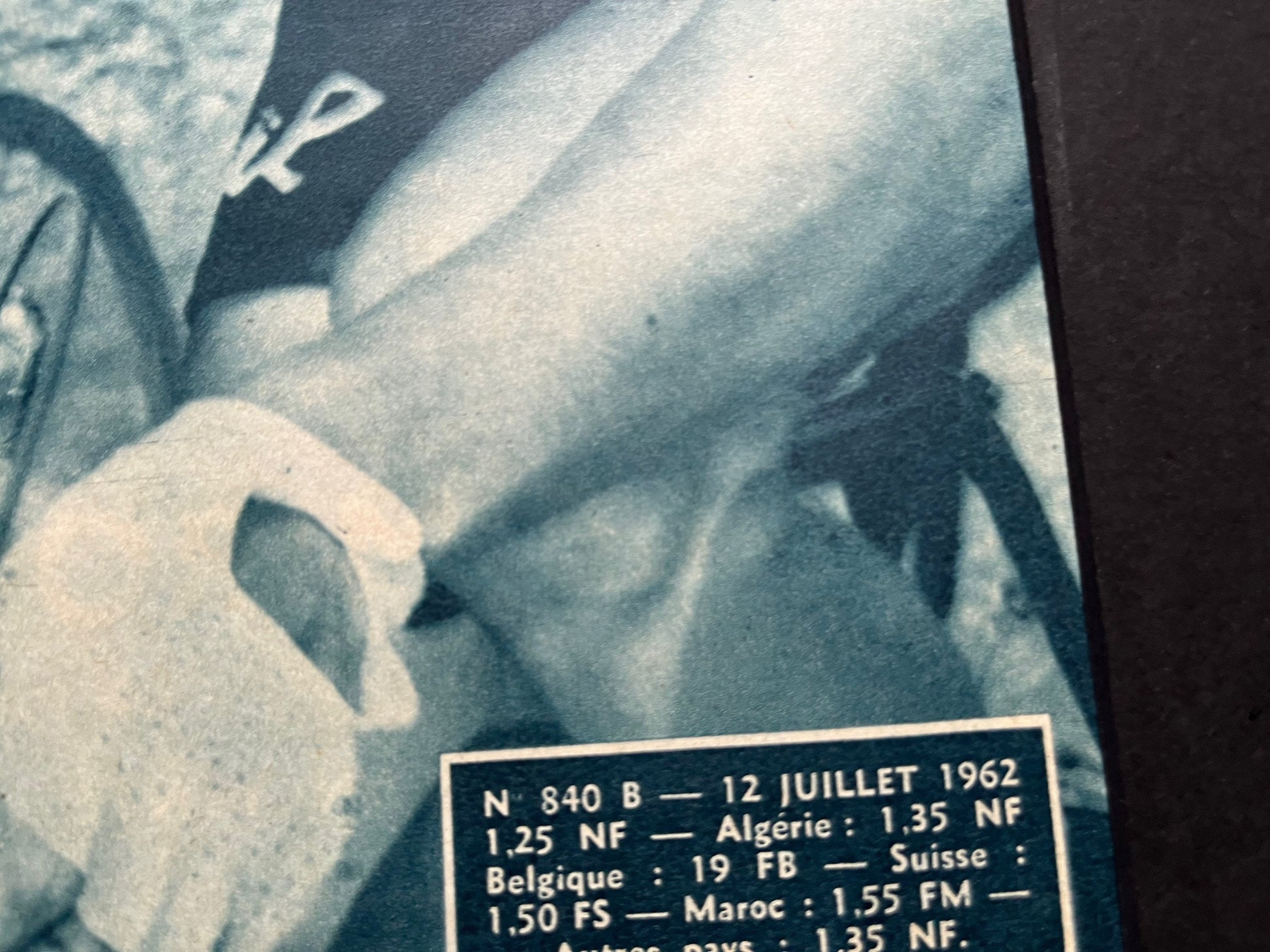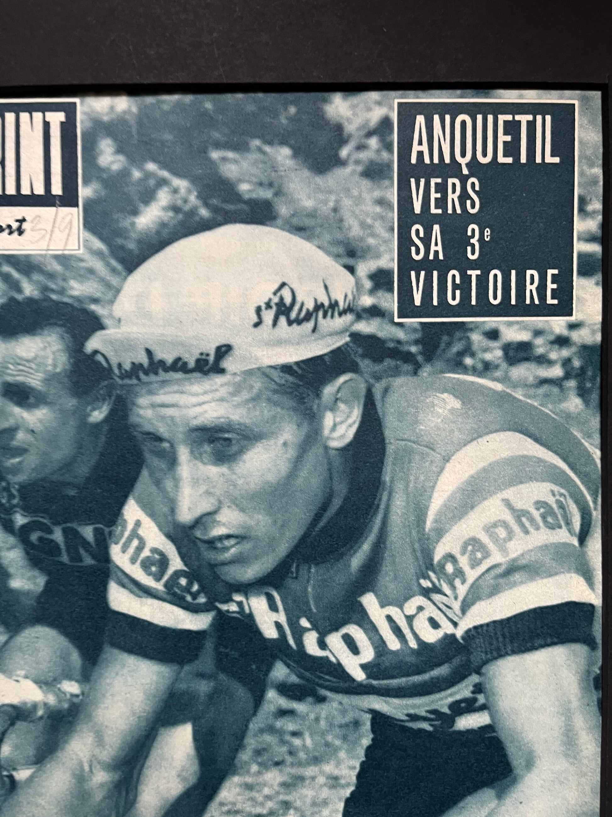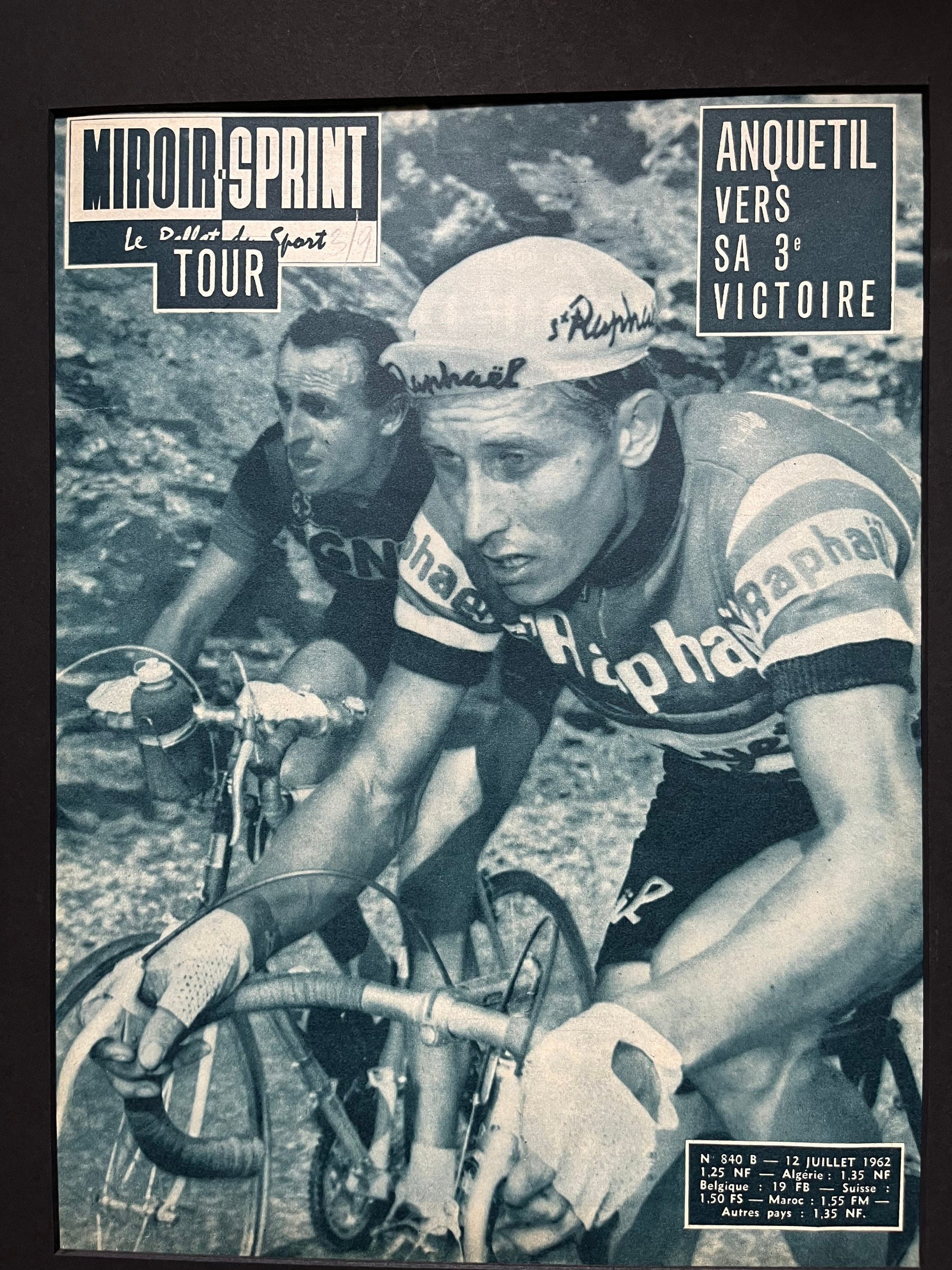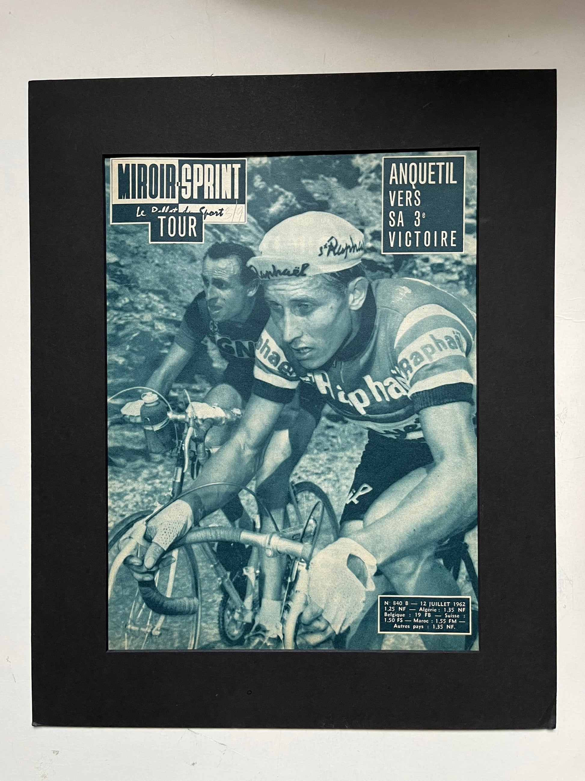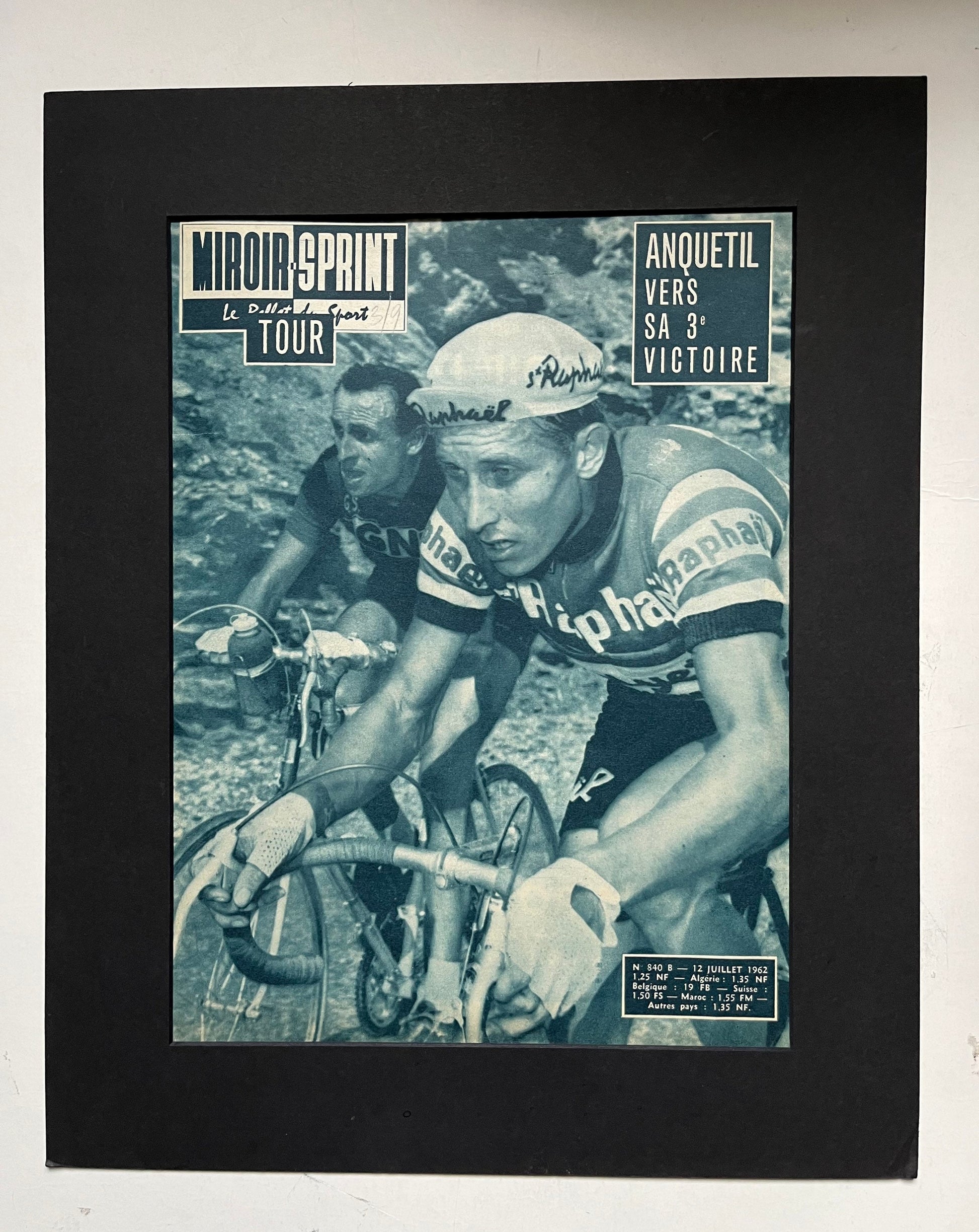 Iconic and very rare Original 1962 French cycling magazine print featuring cycling legend Jacques Anquetil competing in the Tour de France, which he won that year .