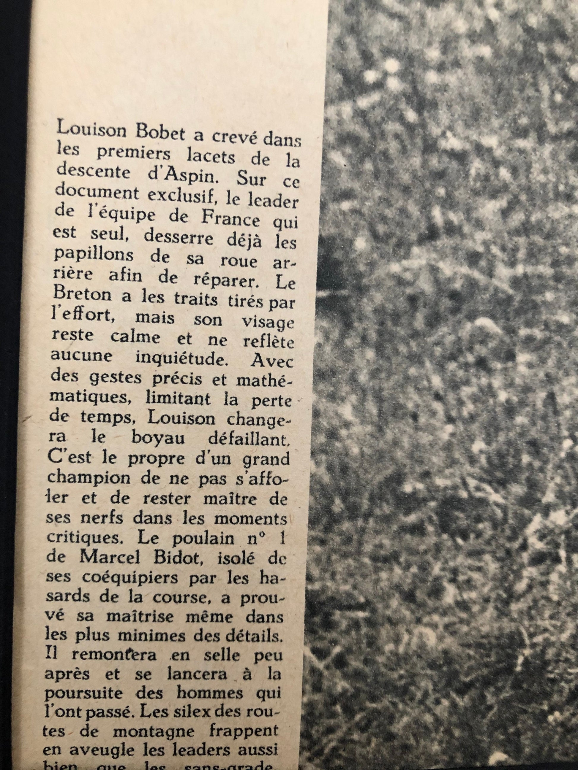 Iconic and very rare Original 1953 French cycling magazine print featuring cycling legend Louison Bobet leaning over his bike.