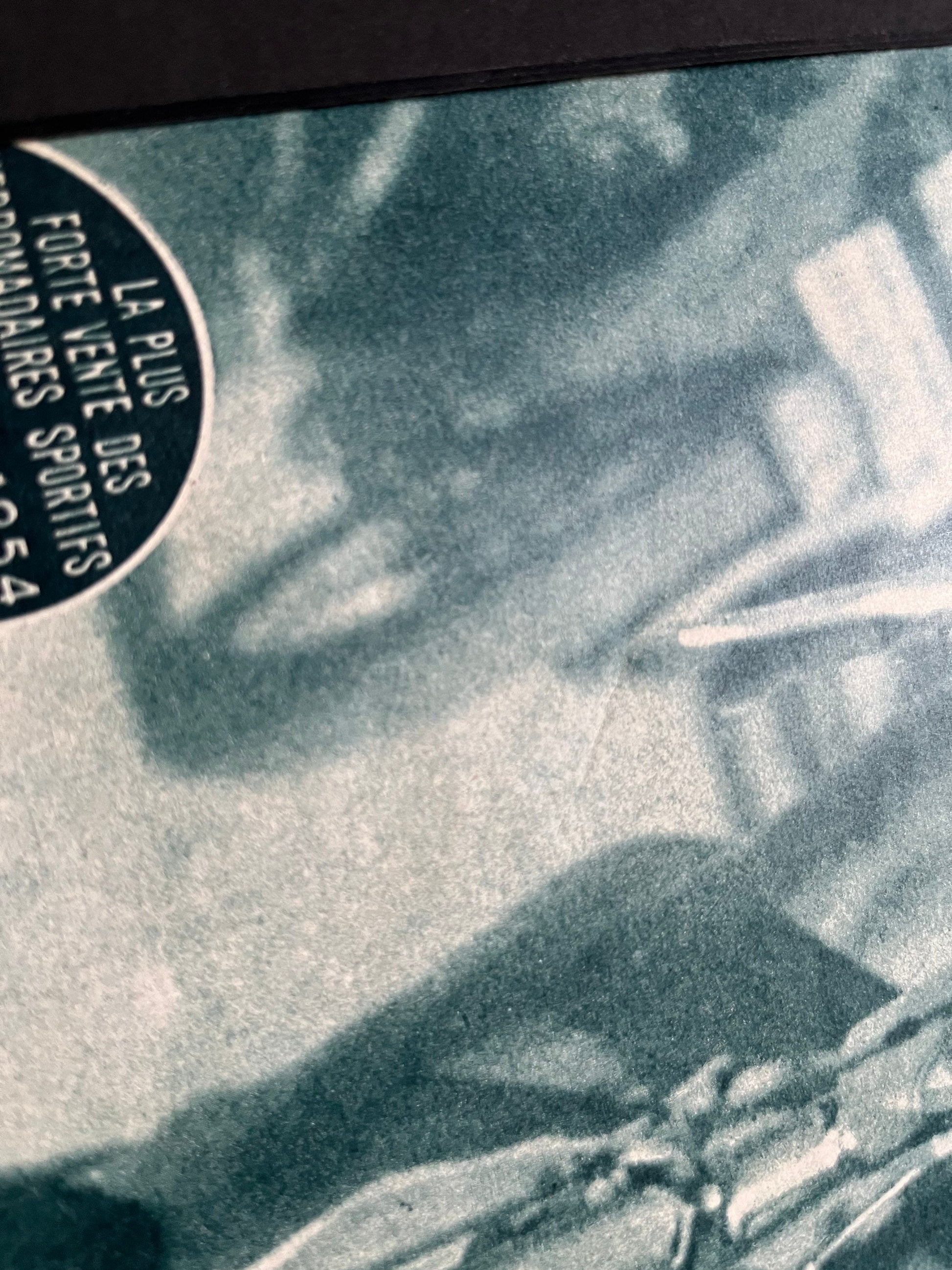 Iconic and very rare Original 1954 French cycling magazine print featuring cycling legend Louison Bobet leaning over his bike. Would look excellent framed. A great looking piece of artwork for the lounge or study. This is an original print and not a scanned copy. A superb piece of artwork and an excellent gift for the cycling nut in your life. Measures 43cm x 34cm Please check out our other listings, we have more really nice vintage prints.