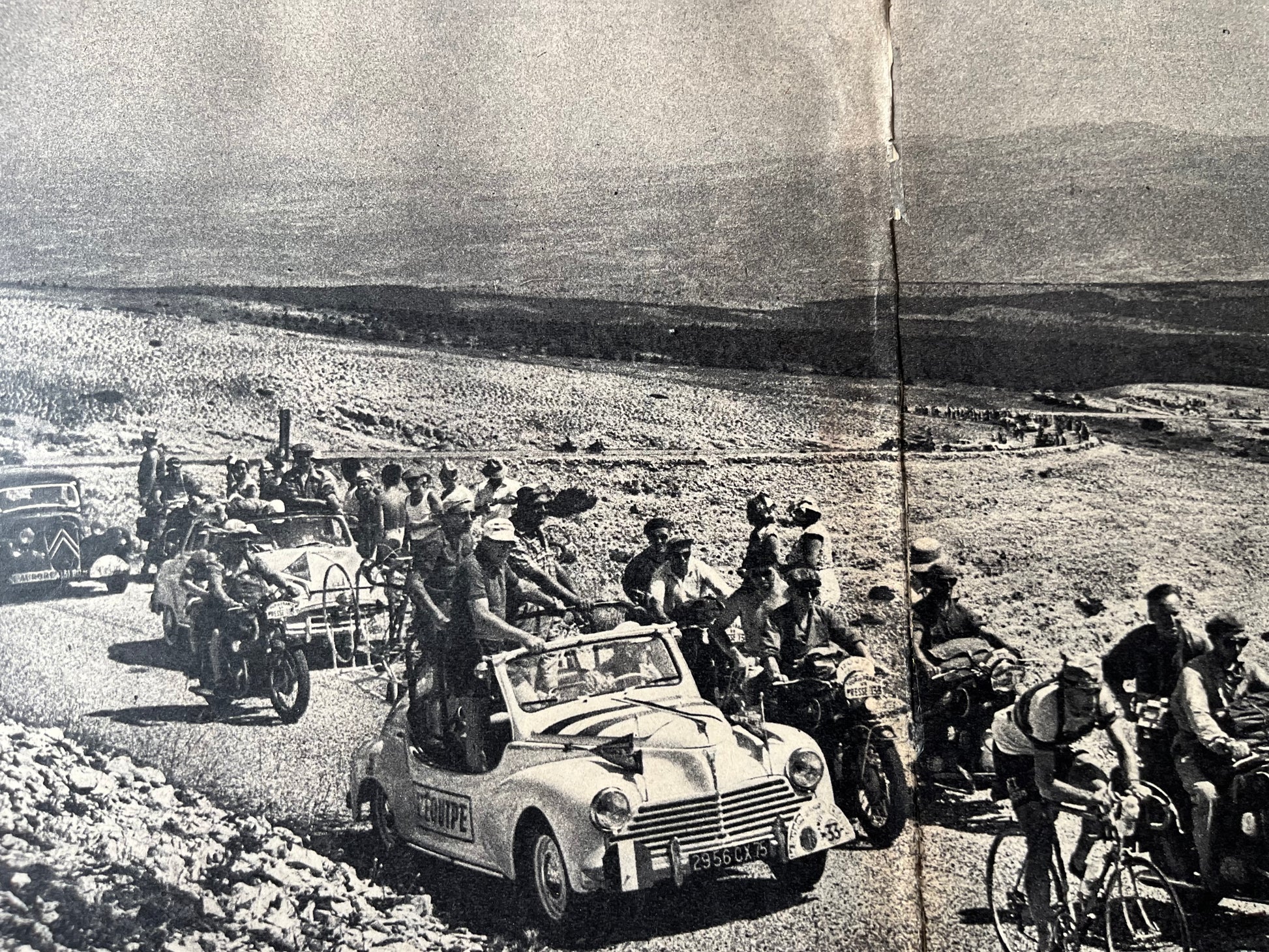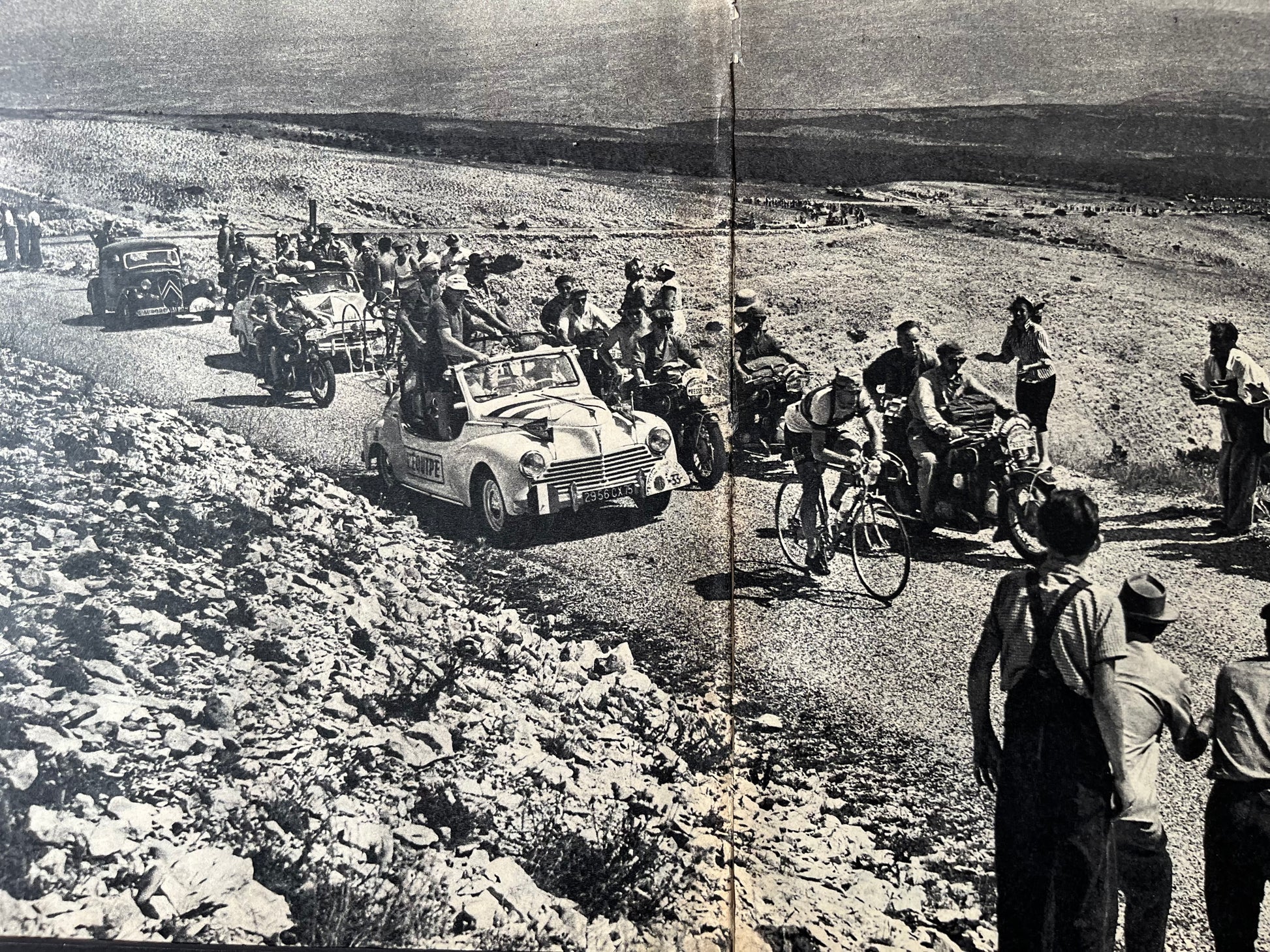 A rare vintage magazine print of Louison Bobet at the summit of Mint Ventoux in the 1951 Tour de France.