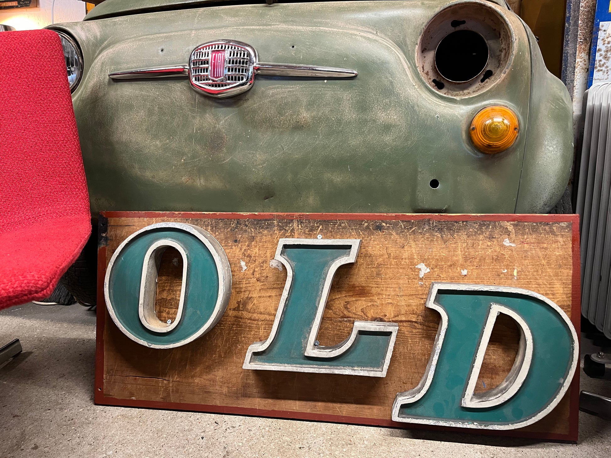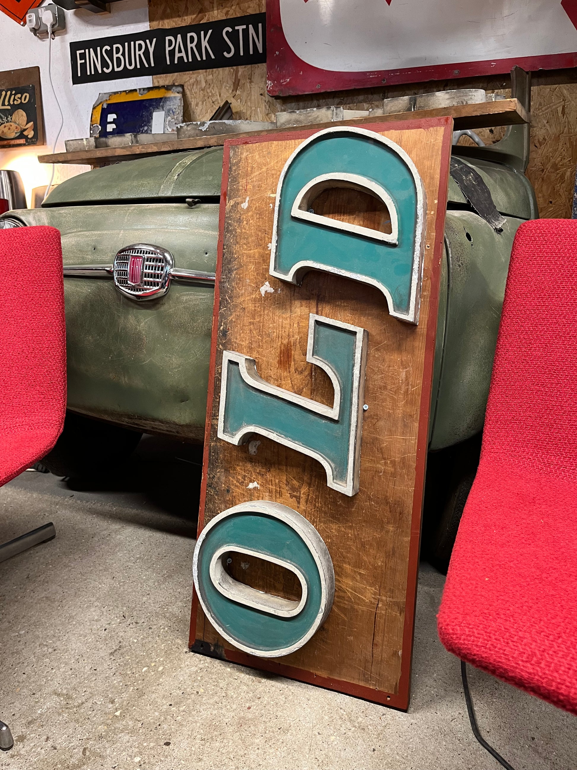Original green 1960s cast alloy shop / garage lettering. “OLD” mounted on reclaimed school cupboard wood board. Weathered ‘as found’ condition. Supercool wall art. Ideal for a bar or home environment.