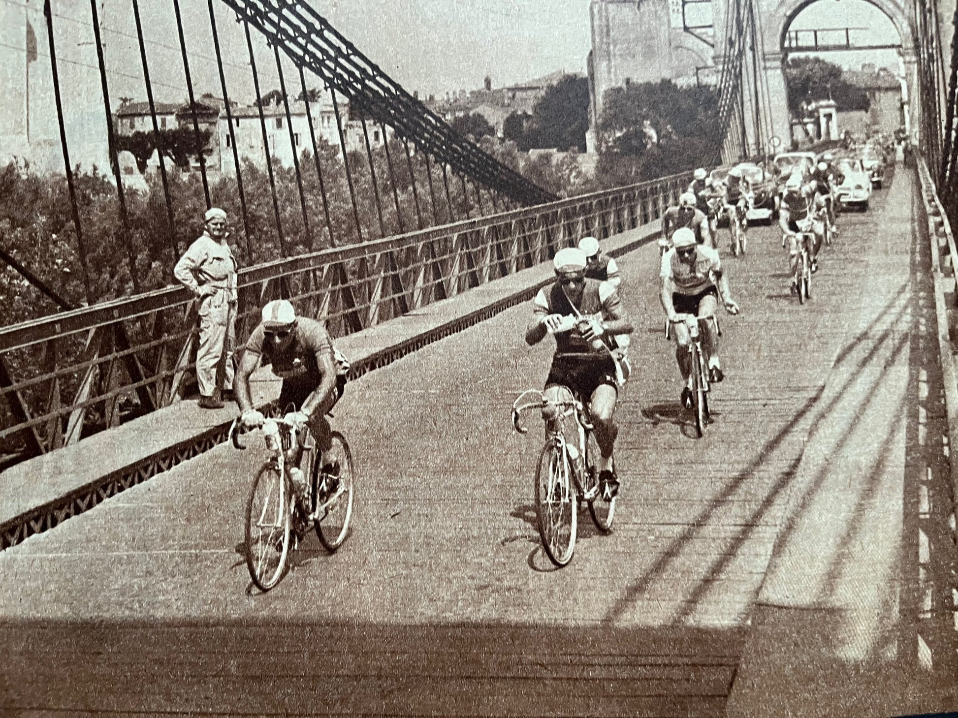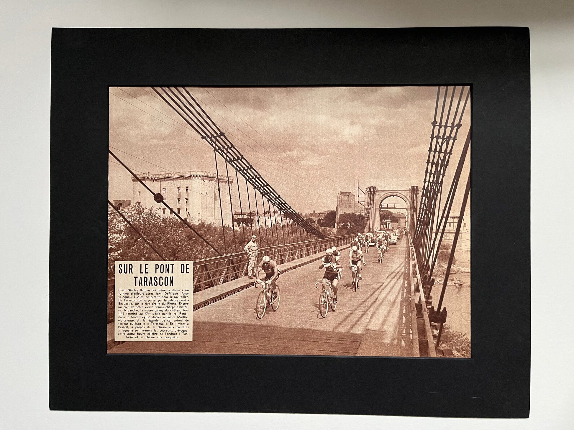 Iconic and very rare Original late 1950s French cycling magazine print showing part of the tour, crossing the Pont de Tarascon.