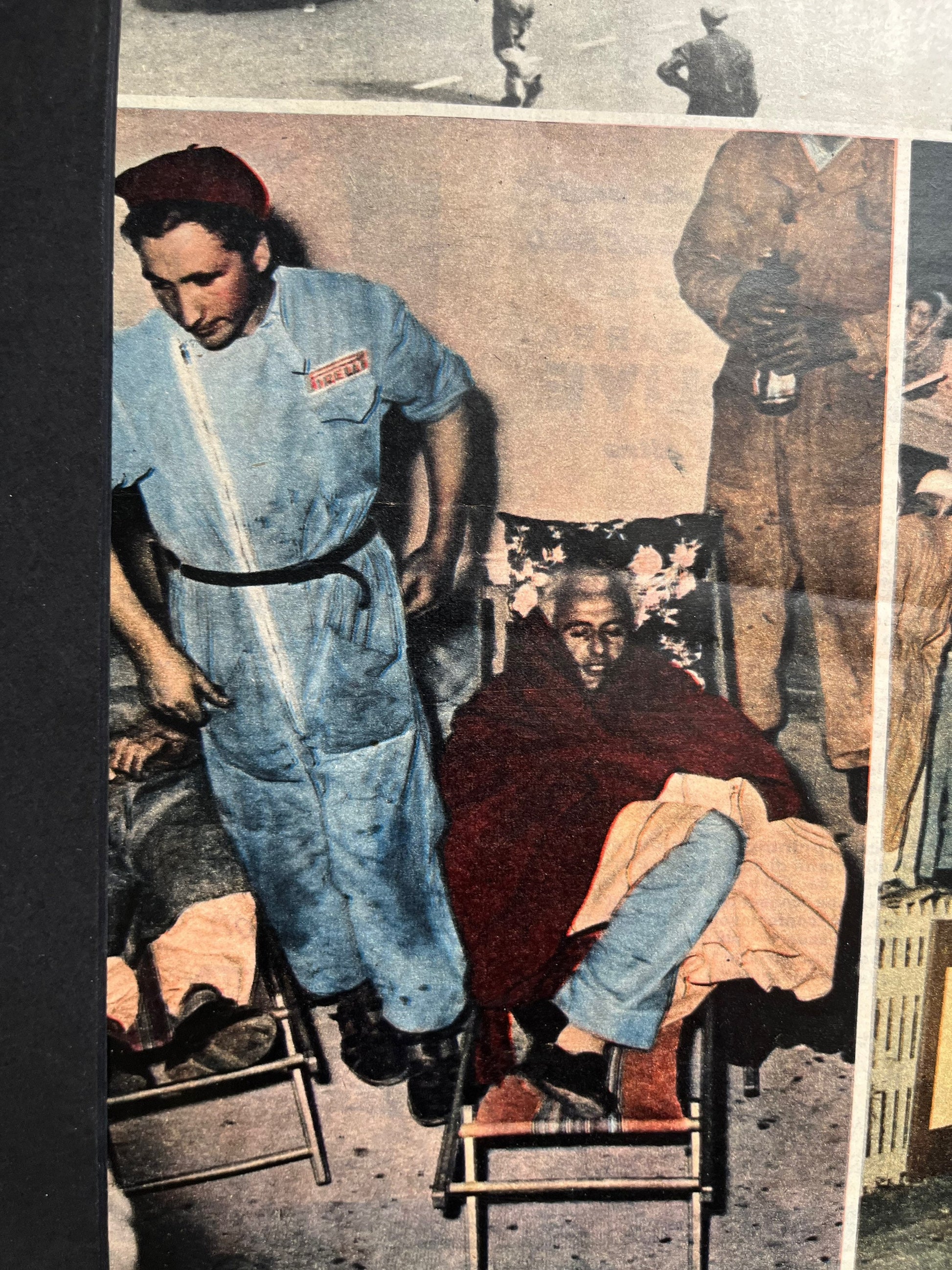 Very rare original c1951 Italian magazine print featuring mechanics working on a Ferrari at the Le Mans 24 hour race.