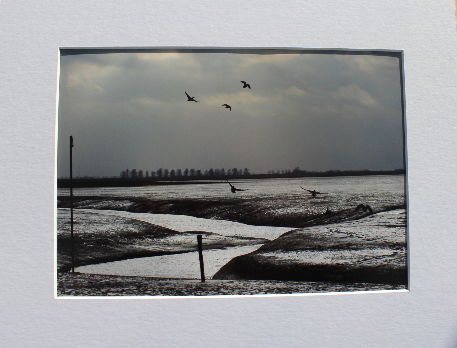 This photograph shows a typical Winter's day in the Wash. This monochromatic image shows a desolate and sometimes harsh landscape. It is one of the UK's most popular habitats for migrating geese and a rich feeding ground for a wide variety of birdlife.