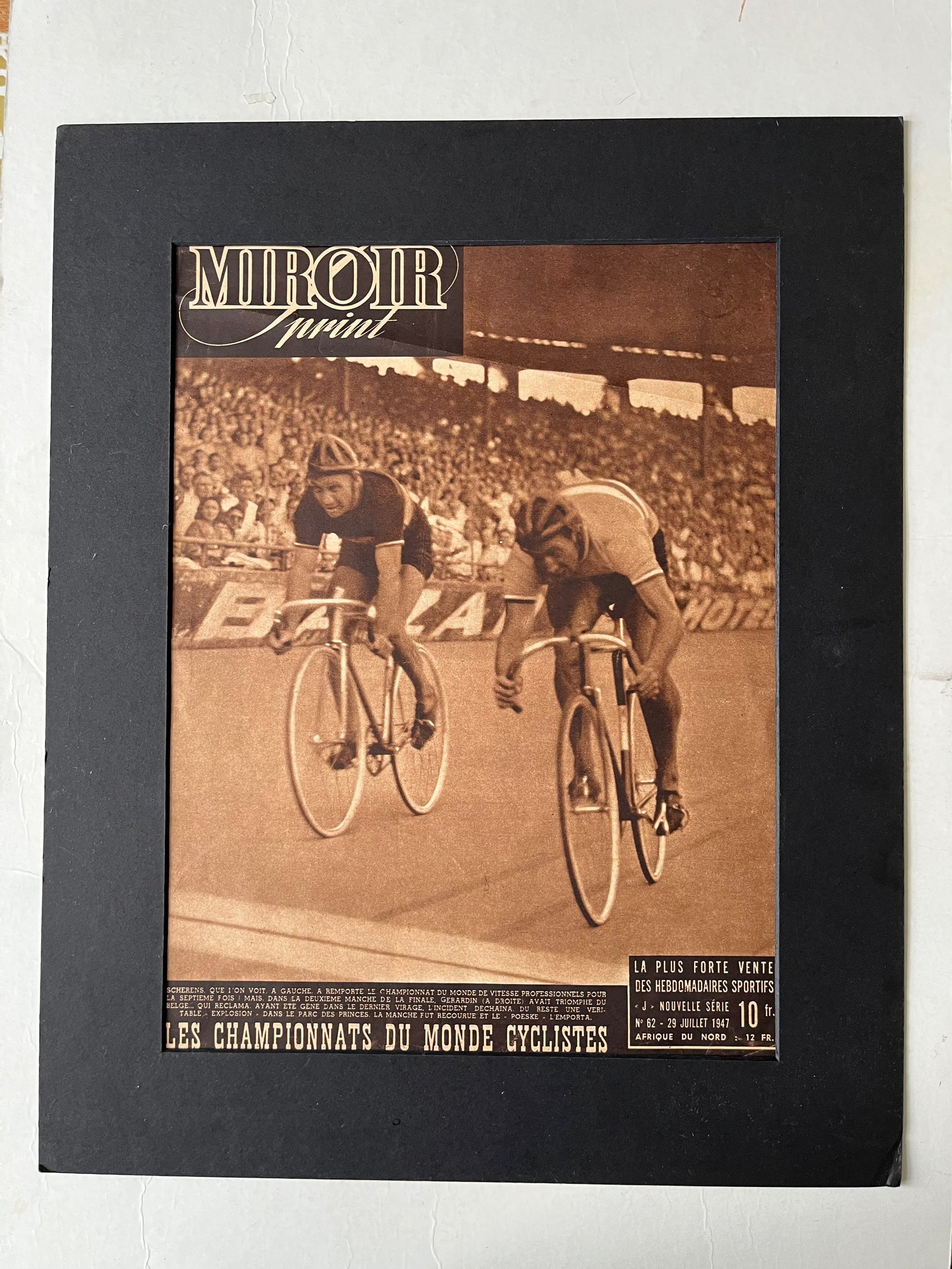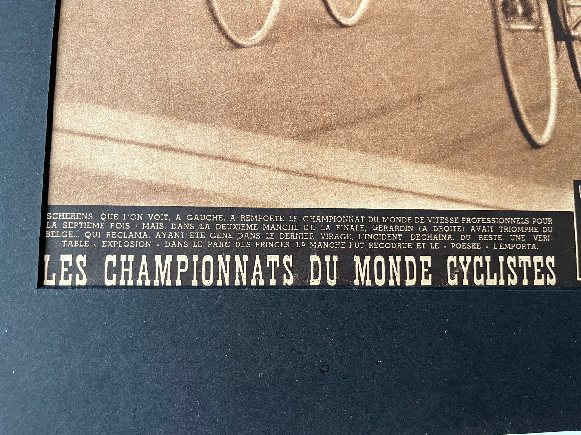 Absolutely stunning and very rare Original 1947 French cycling magazine print with track cycling stars Gerardin and Scherens on the track. A great piece of artwork for the vintage cycling fanatic. Would look excellent framed. A great looking piece of artwork for the lounge or study. This is an original print and not a scanned copy.. A superb piece of artwork and an excellent gift for the cycling enthusiast.