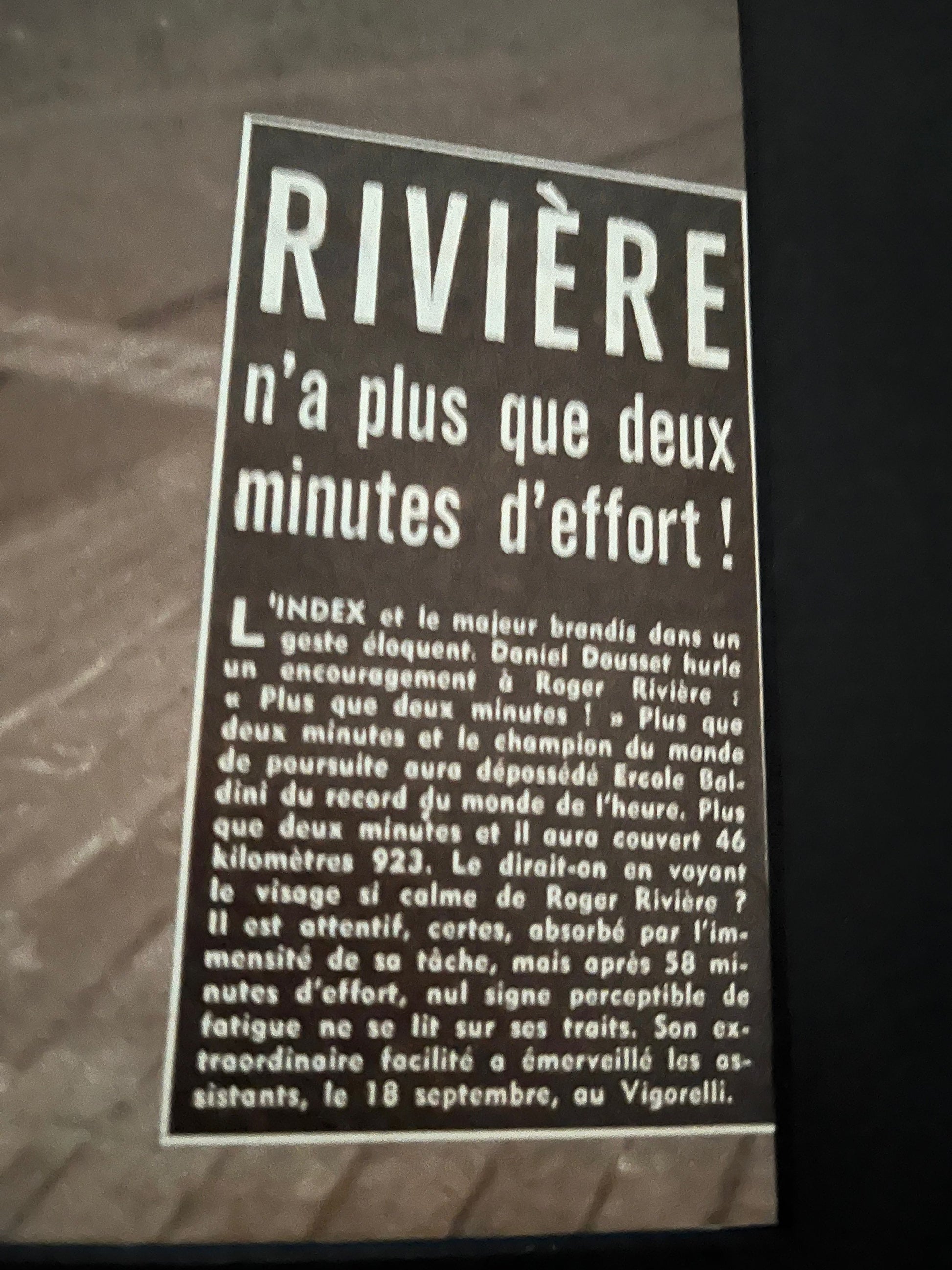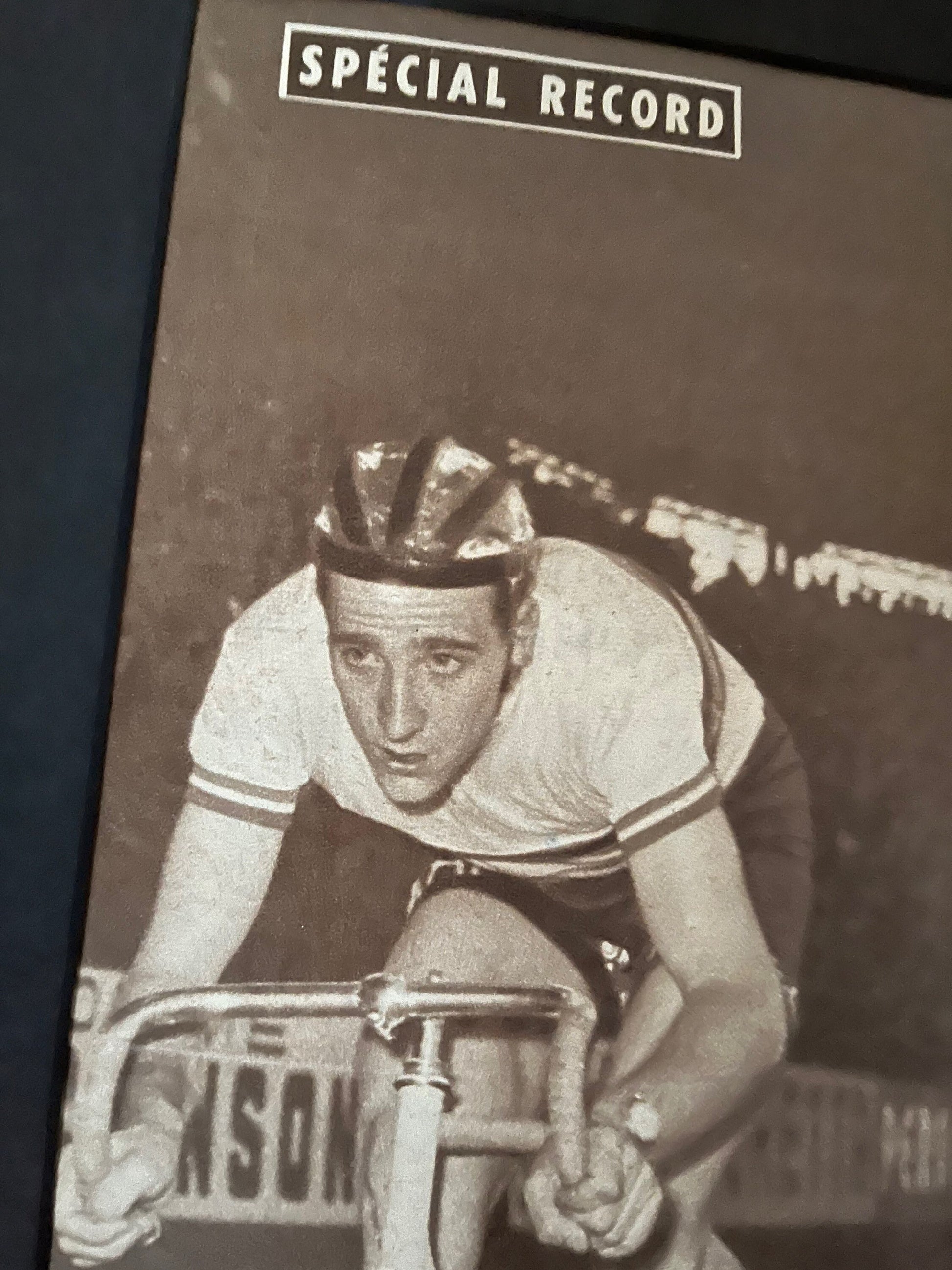 Iconic and very rare Original 1957 French cycling magazine print featuring Roger Rivière on a track bike in St Raphael team strip.