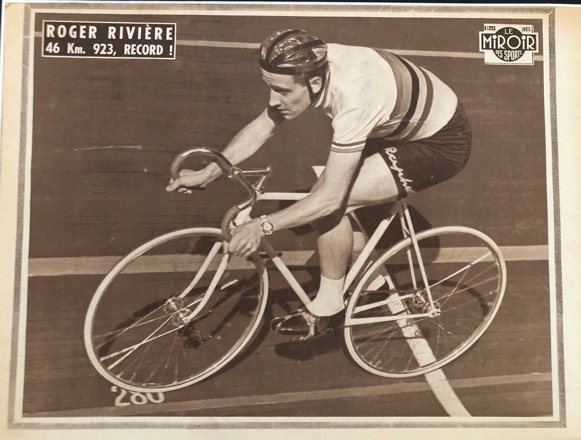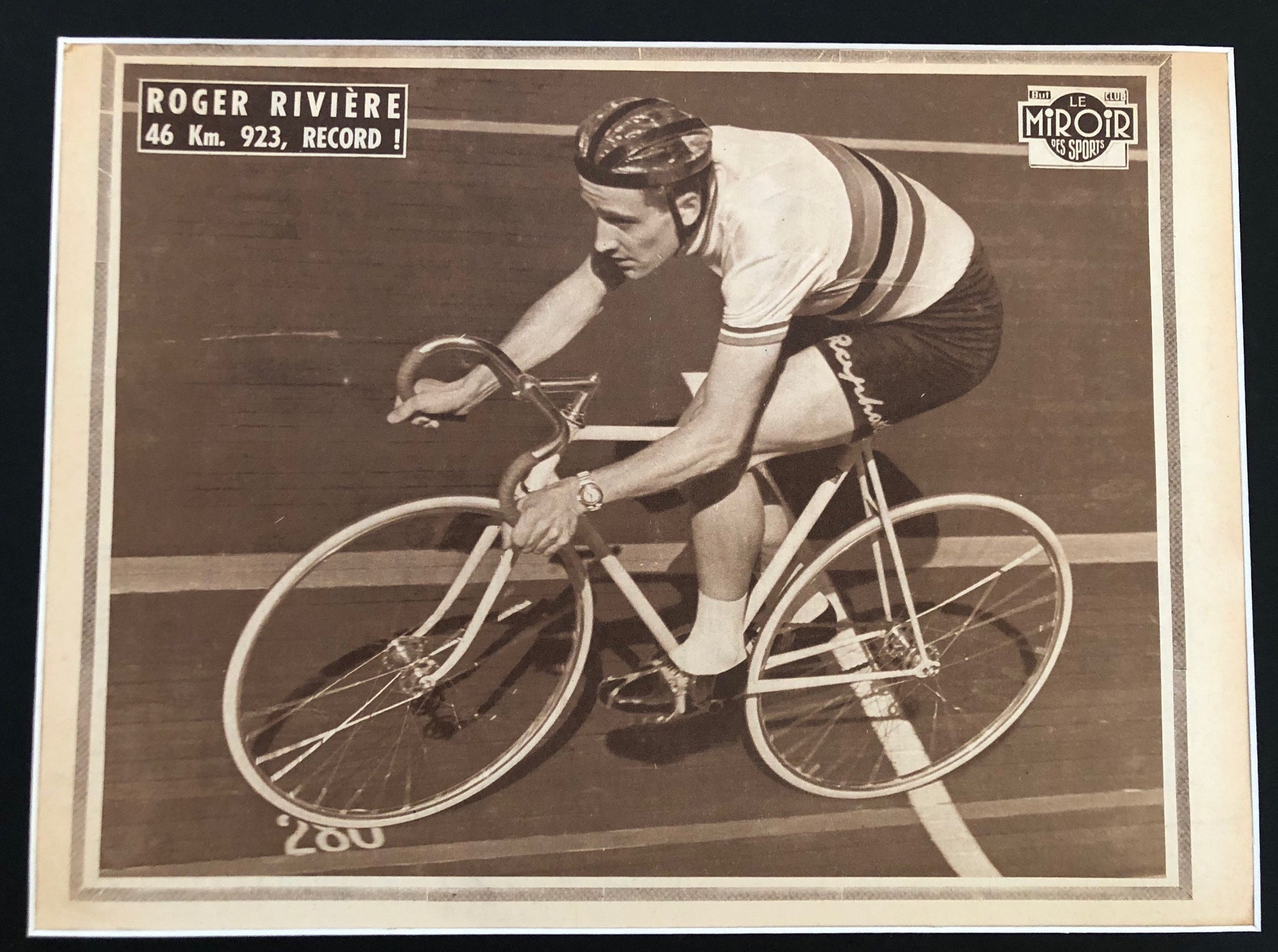 Iconic and very rare Original 1957 French cycling magazine print featuring Roger Rivière on a track bike in St Raphael team strip.