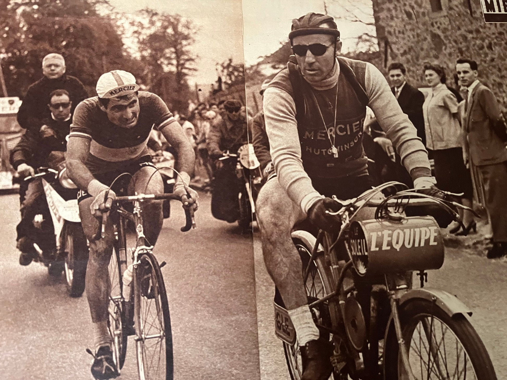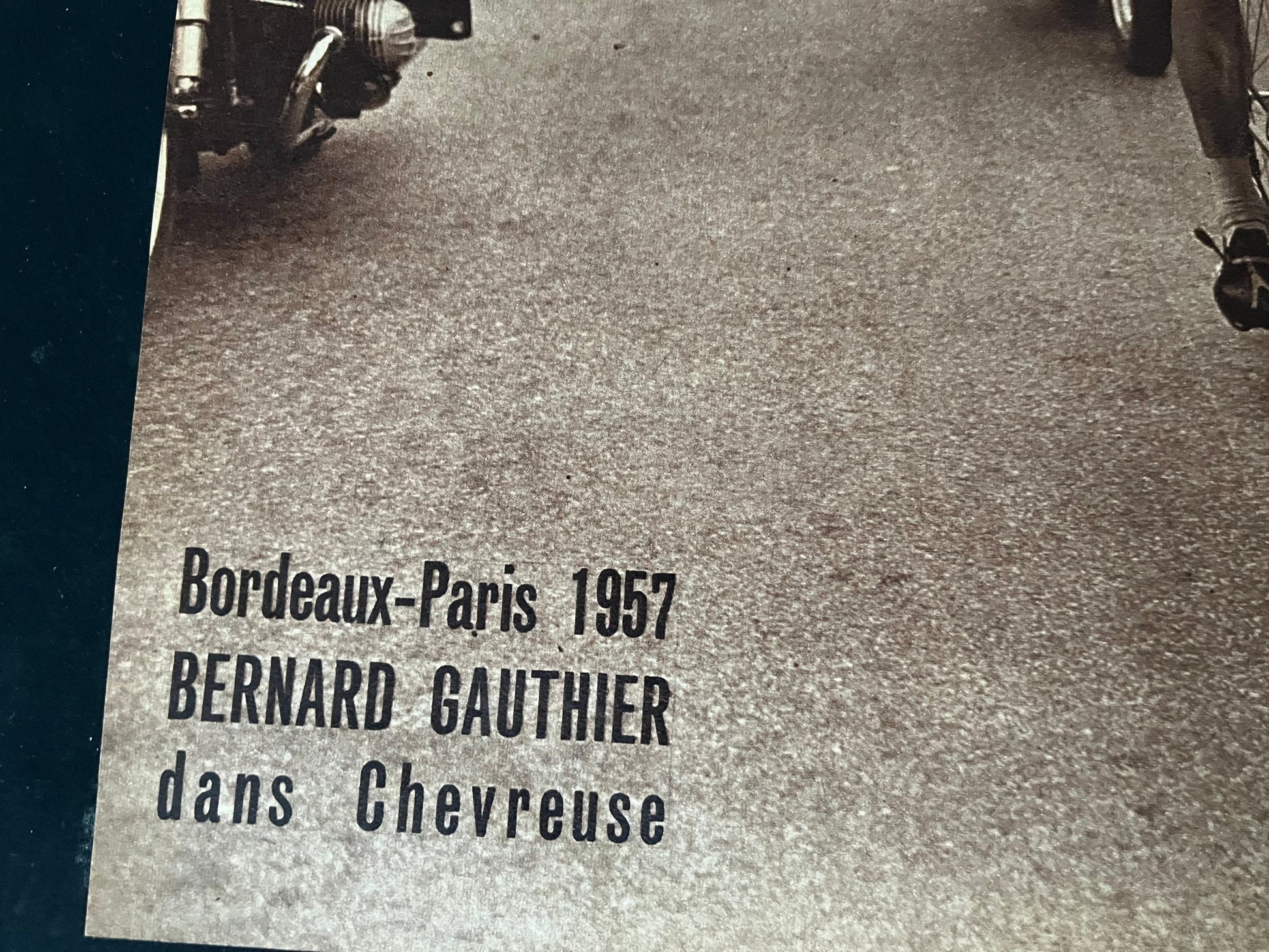 Iconic and very rare Original 1957 French cycling magazine print featuring a rider - Bernard Gauthier riding alongside a support motorcycle on a stage of the Tour de France. Would look excellent framed. A great looking piece of artwork for the lounge or study. This is an original print and not a scanned copy. A superb piece of artwork and an excellent gift for the cycling nut in your life. Measures 56cm x 39cm Please check out our other listings, we have more really nice vintage prints.