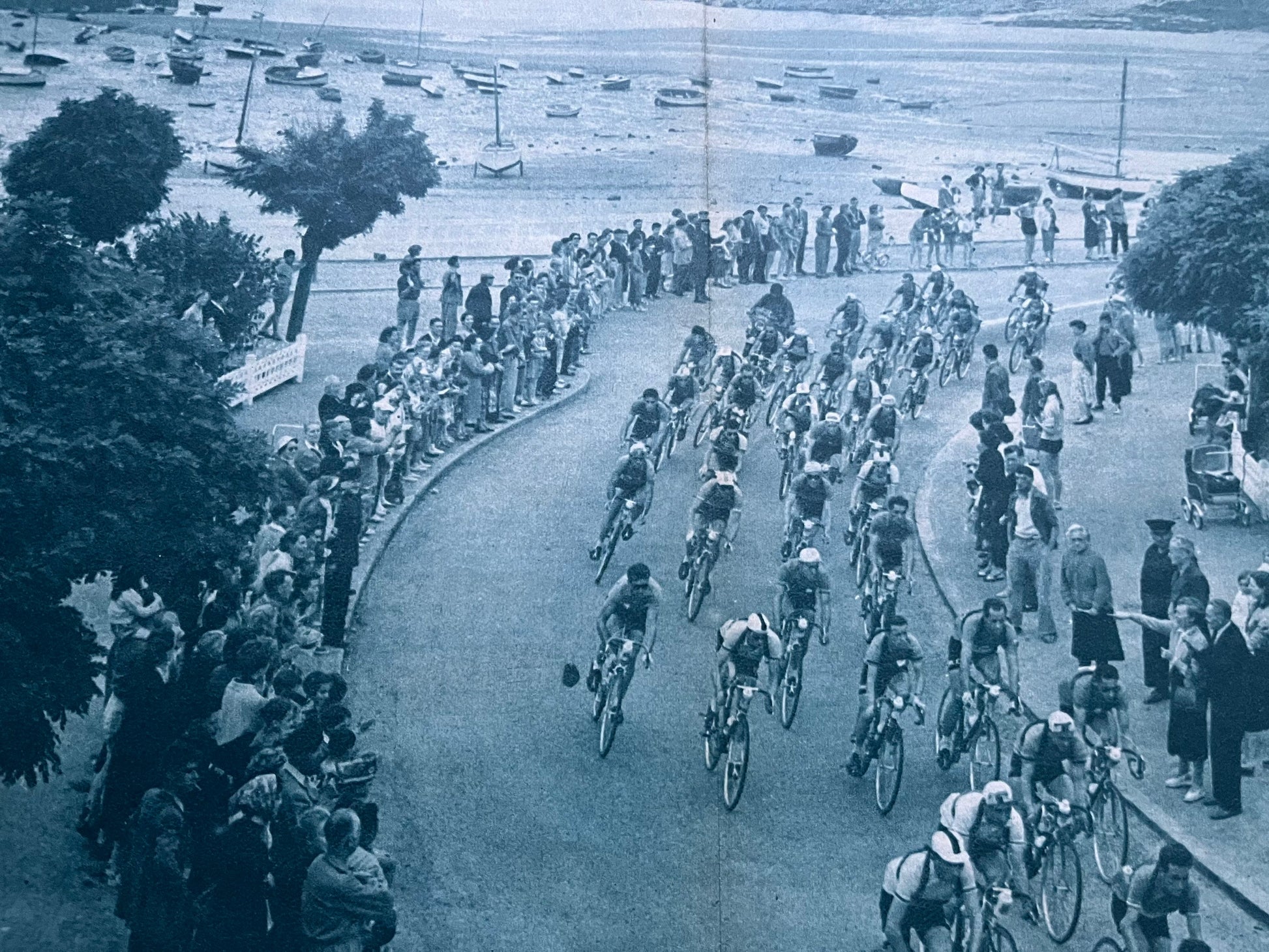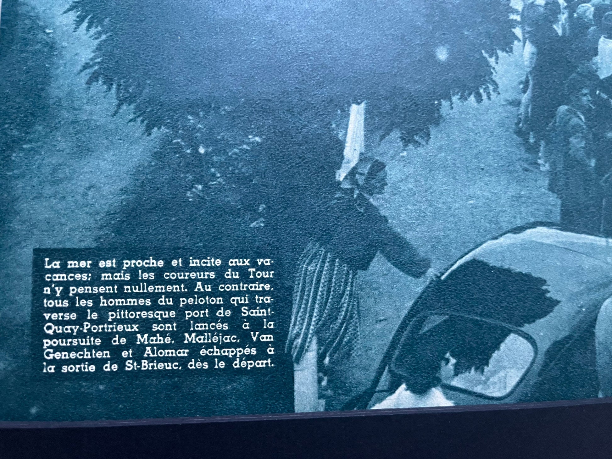 Iconic and very rare Original French cycling magazine print featuring the Peloton racing through Quay Portrieux in the Tour de France in 1954