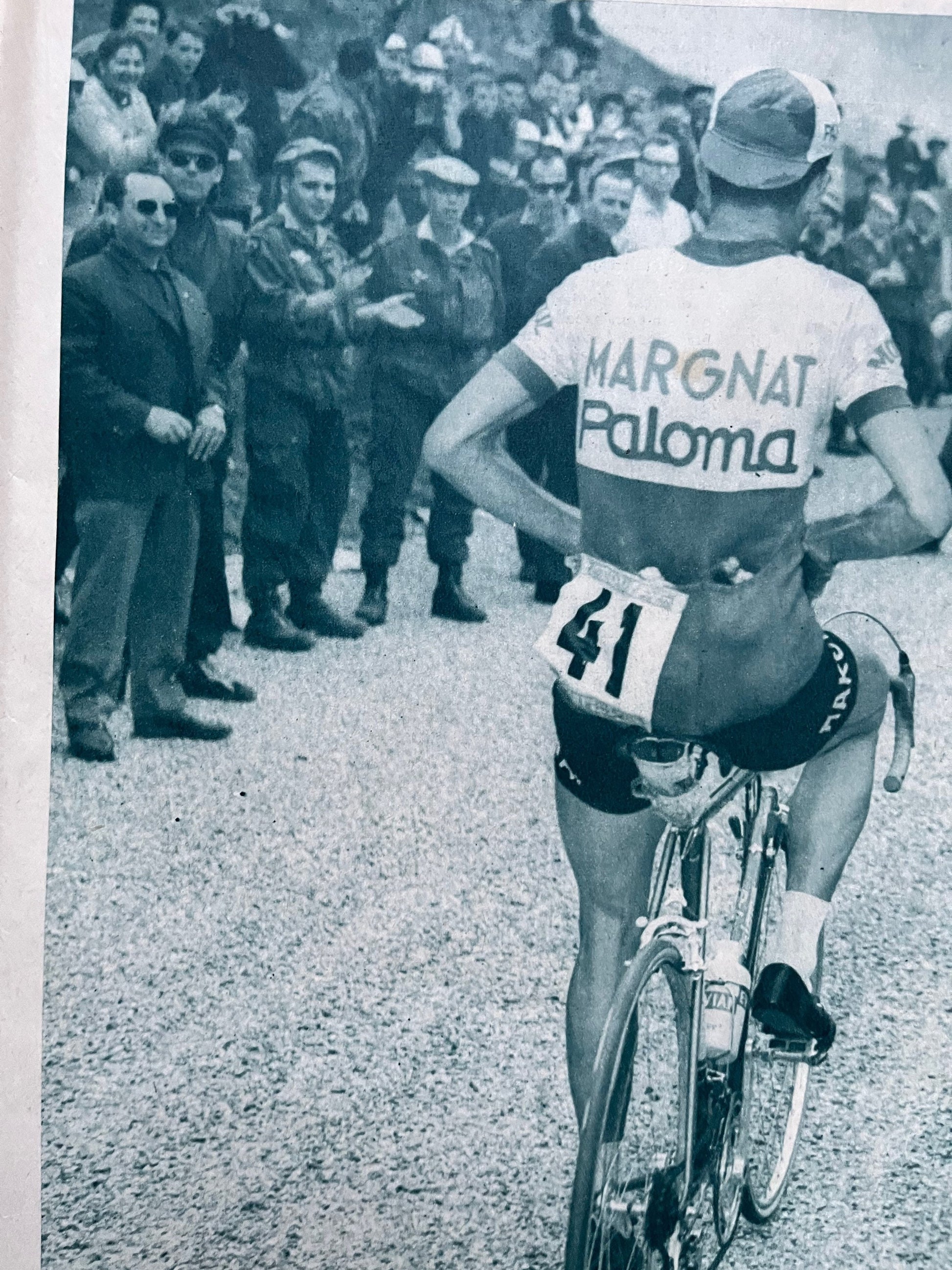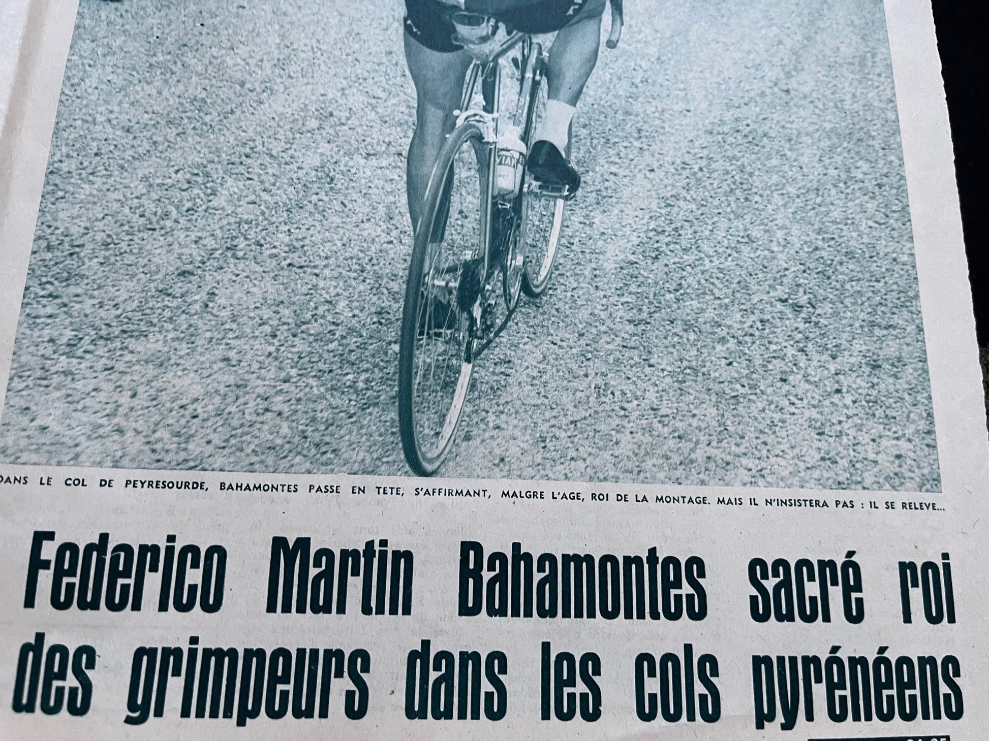 An awesome image! Iconic and very rare Original early 1960s French cycling magazine print showing Spanish rider Federico Bahamontes riding in the Pyrenees.