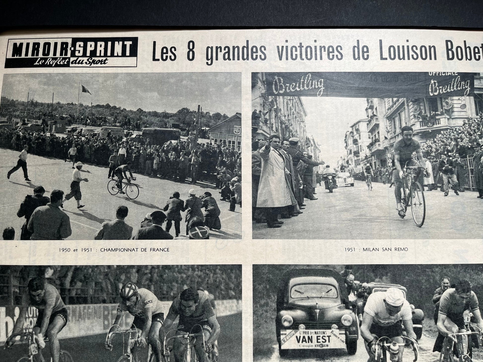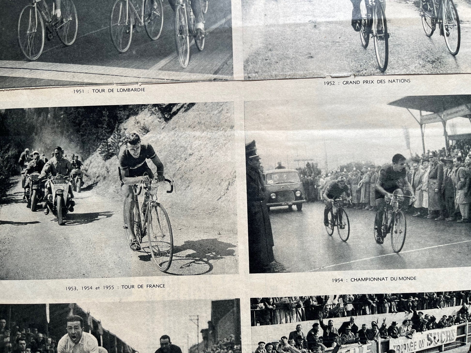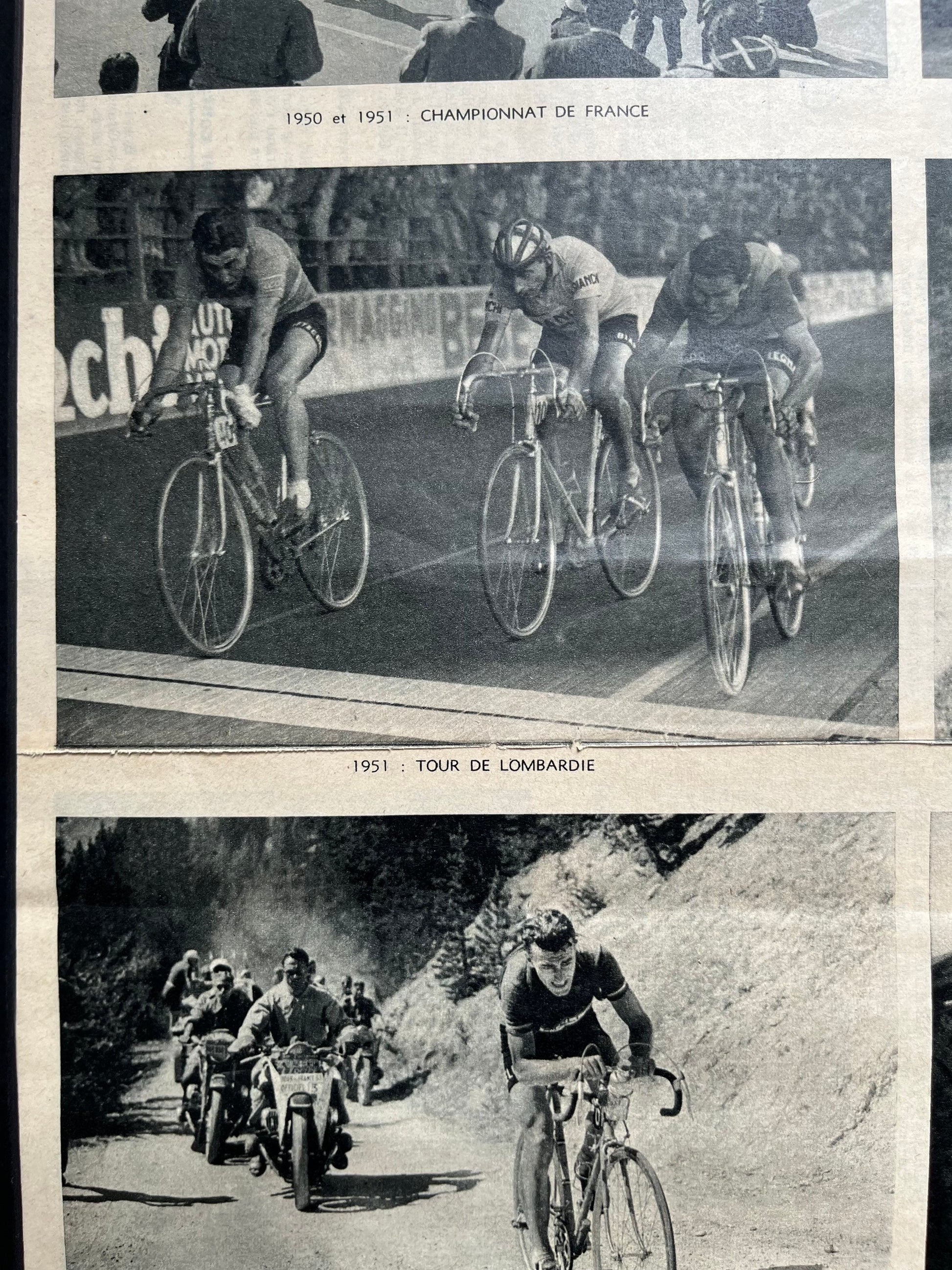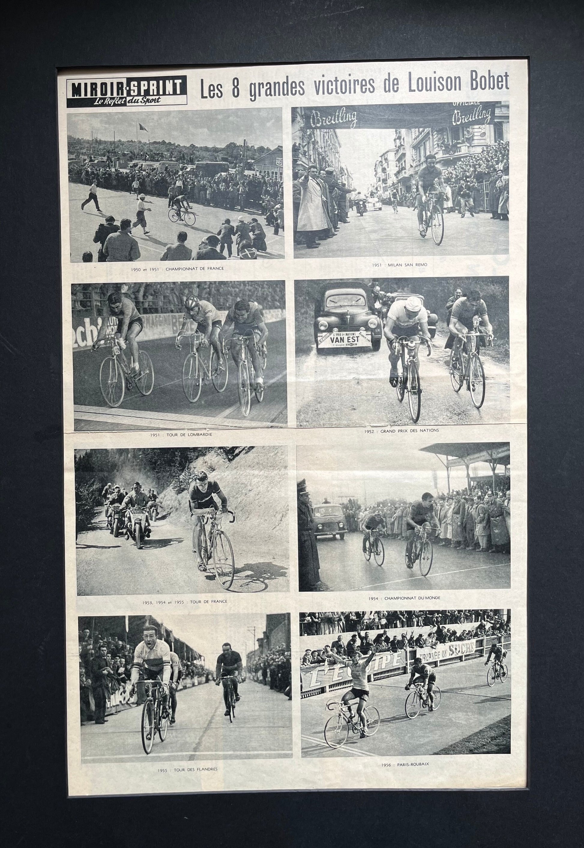 An original french magazine print highlighting the eight major cycling victories of Louison Bobet during his career from 1951-55
