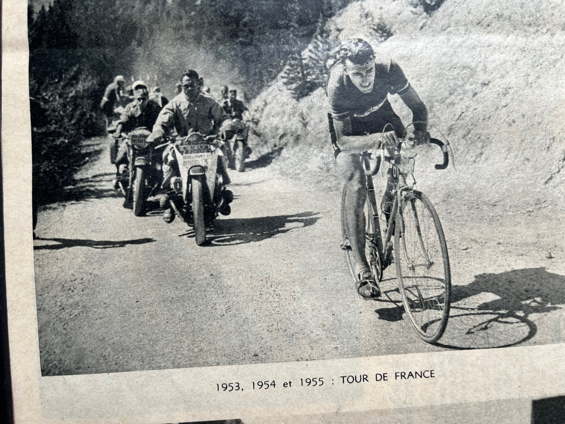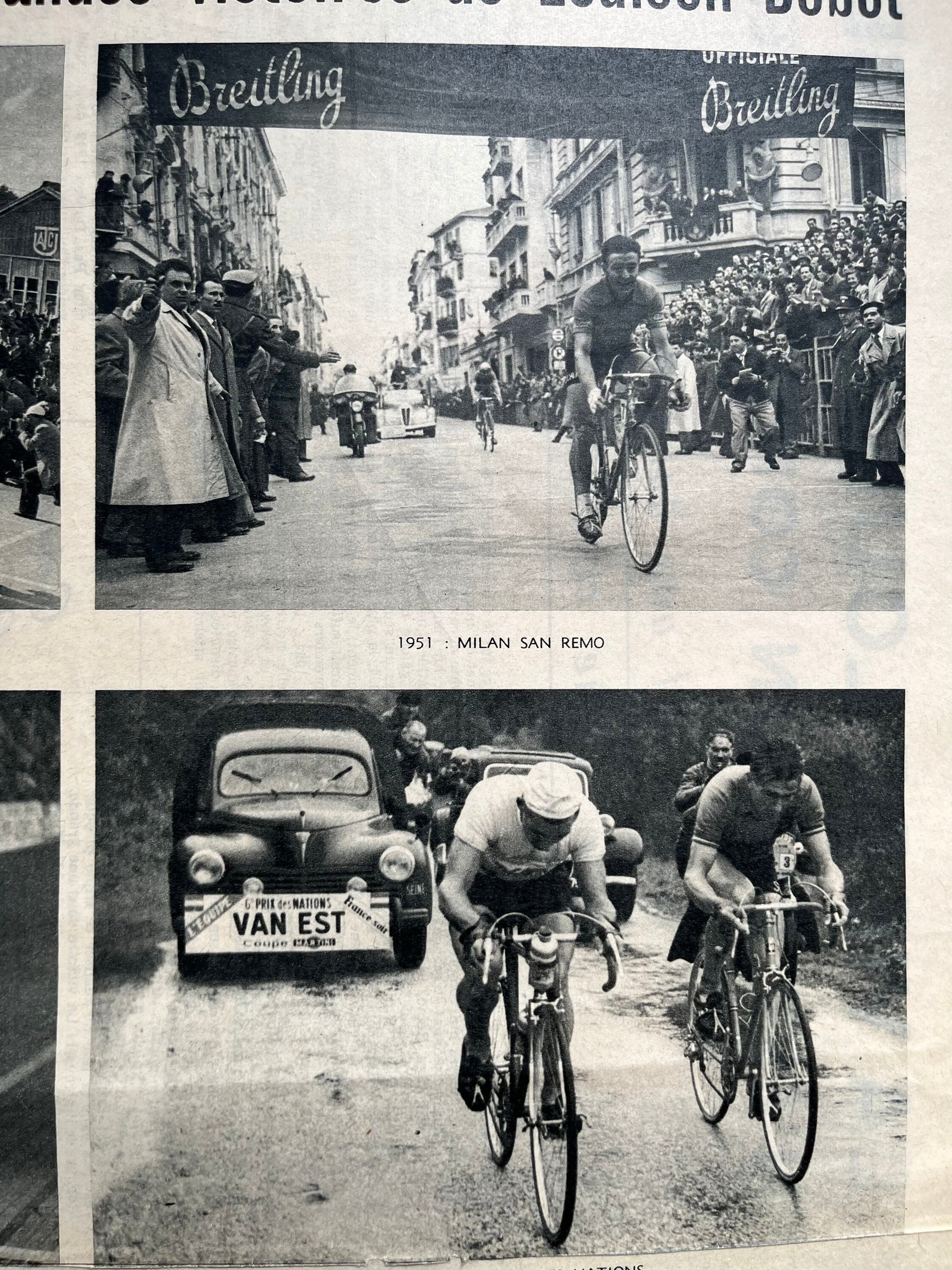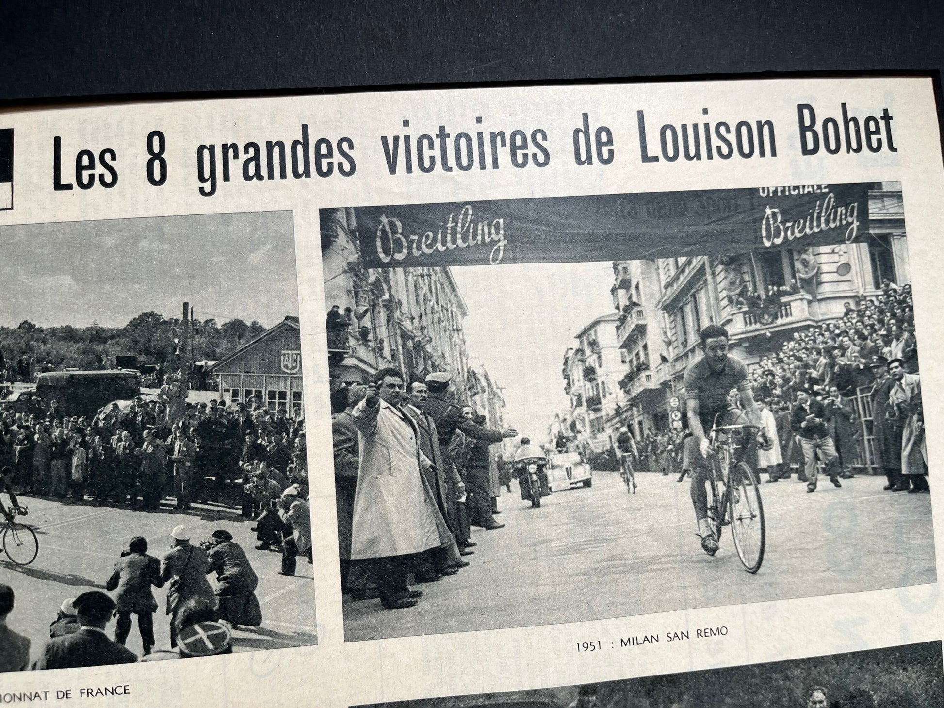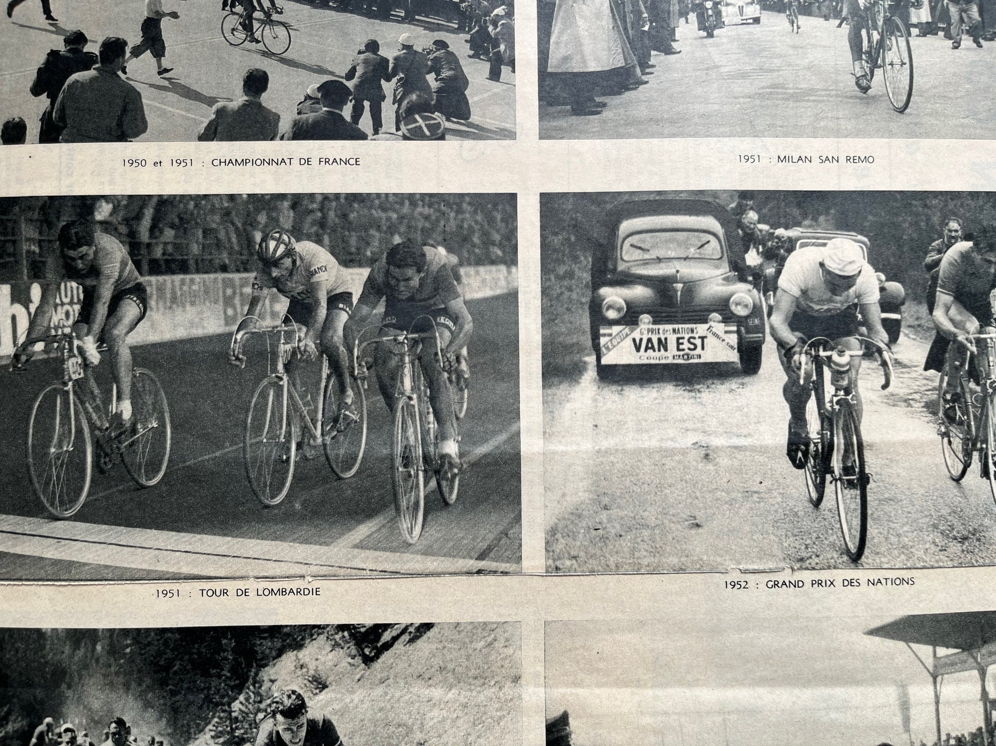 An original french magazine print highlighting the eight major cycling victories of Louison Bobet during his career from 1951-55