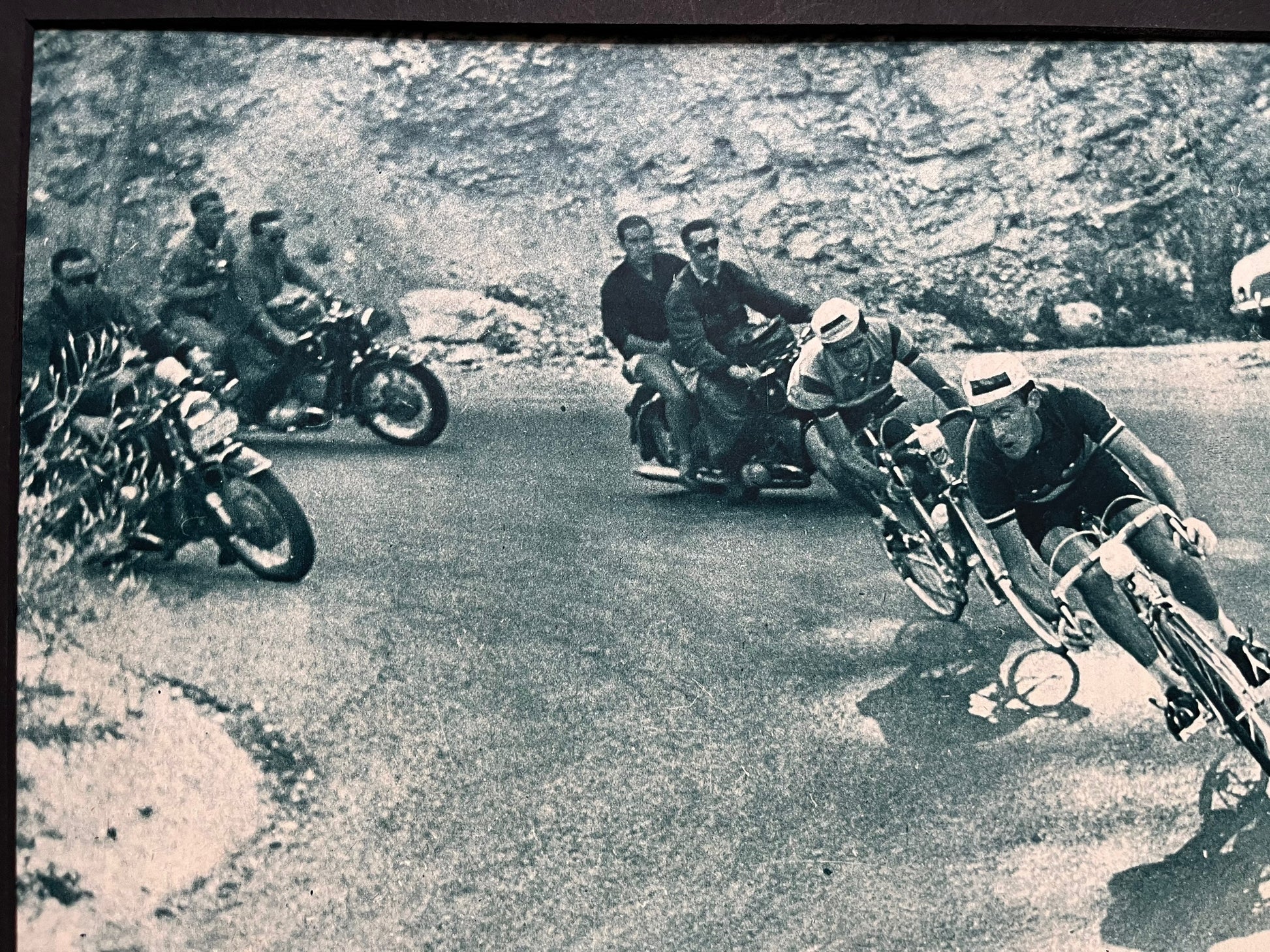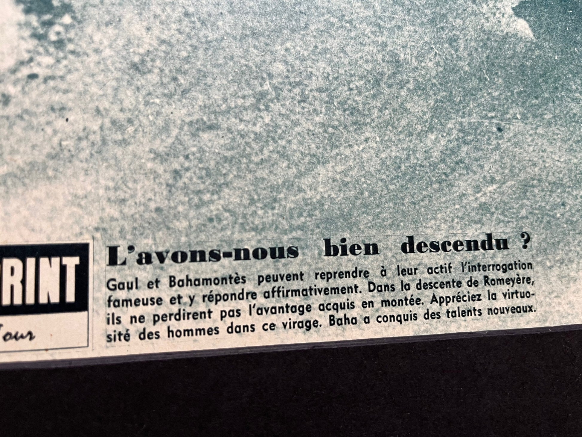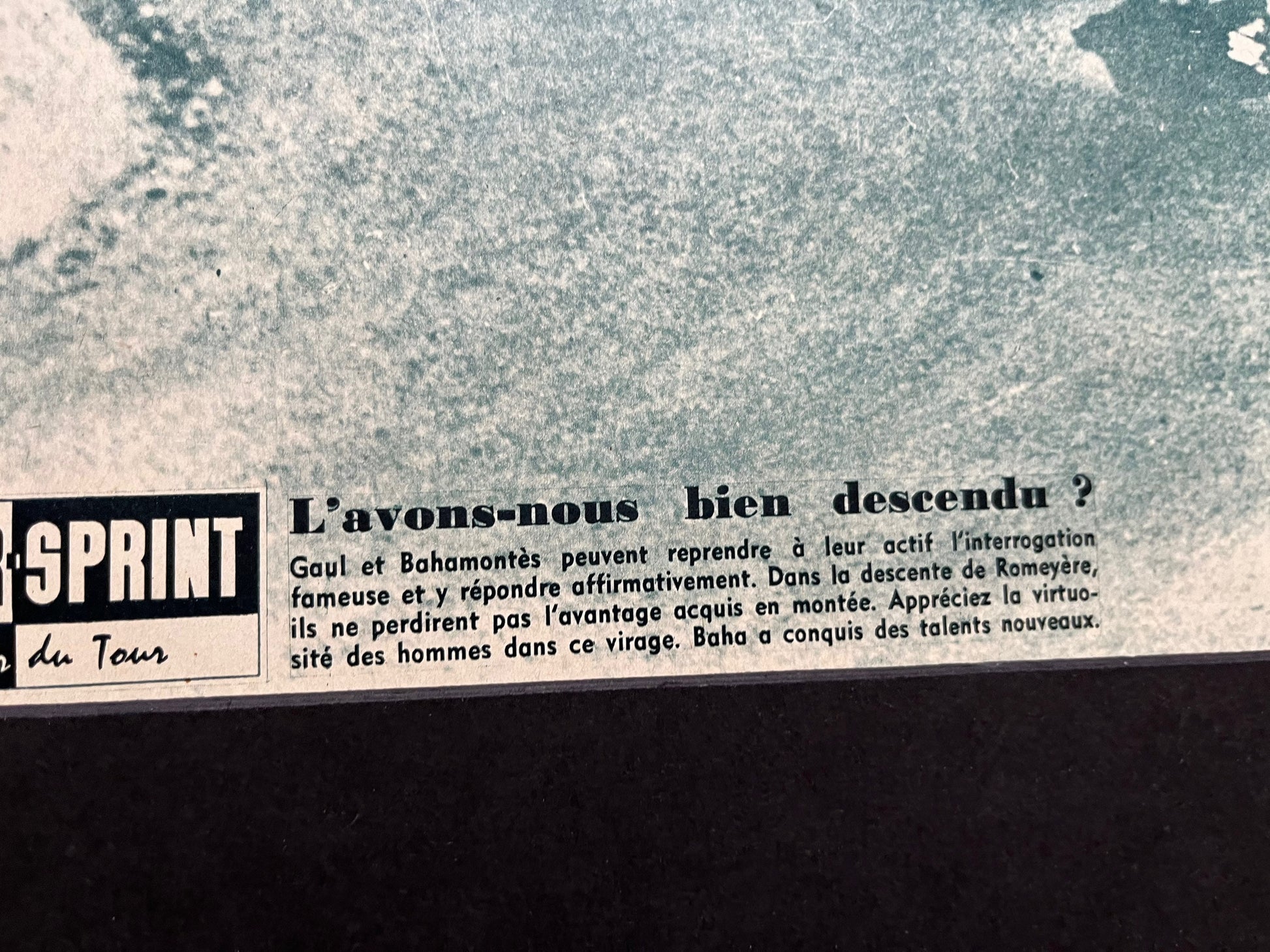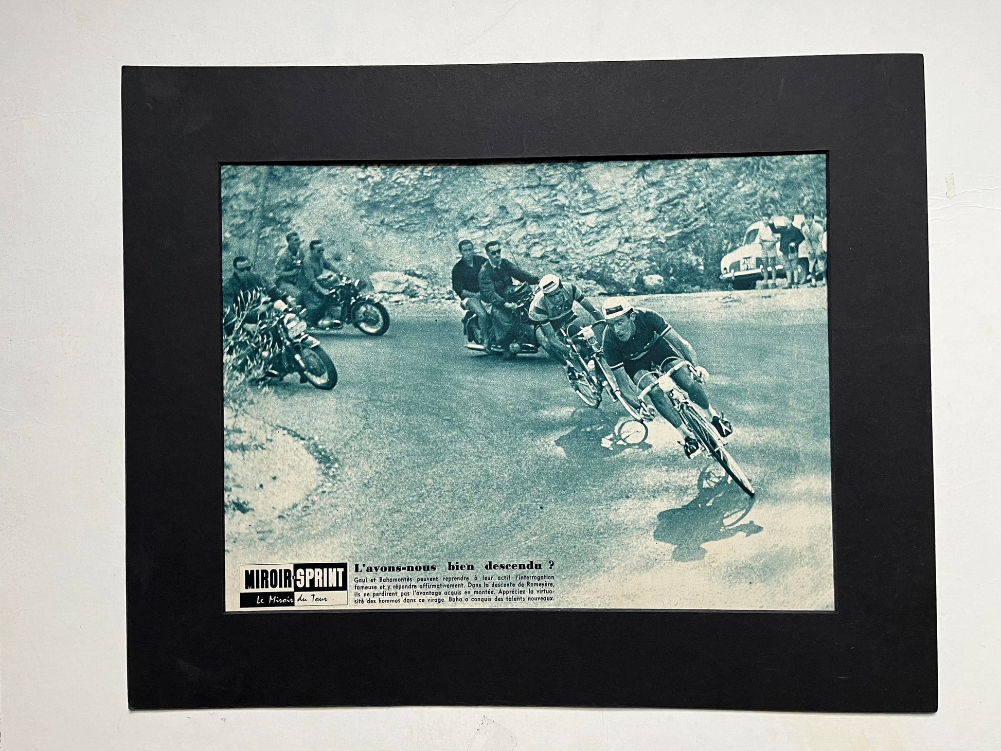 An awesome image! Iconic and very rare Original 1958 French cycling magazine print showing an excellent descent battle between Charly Gaul and Federico Bahamontes.