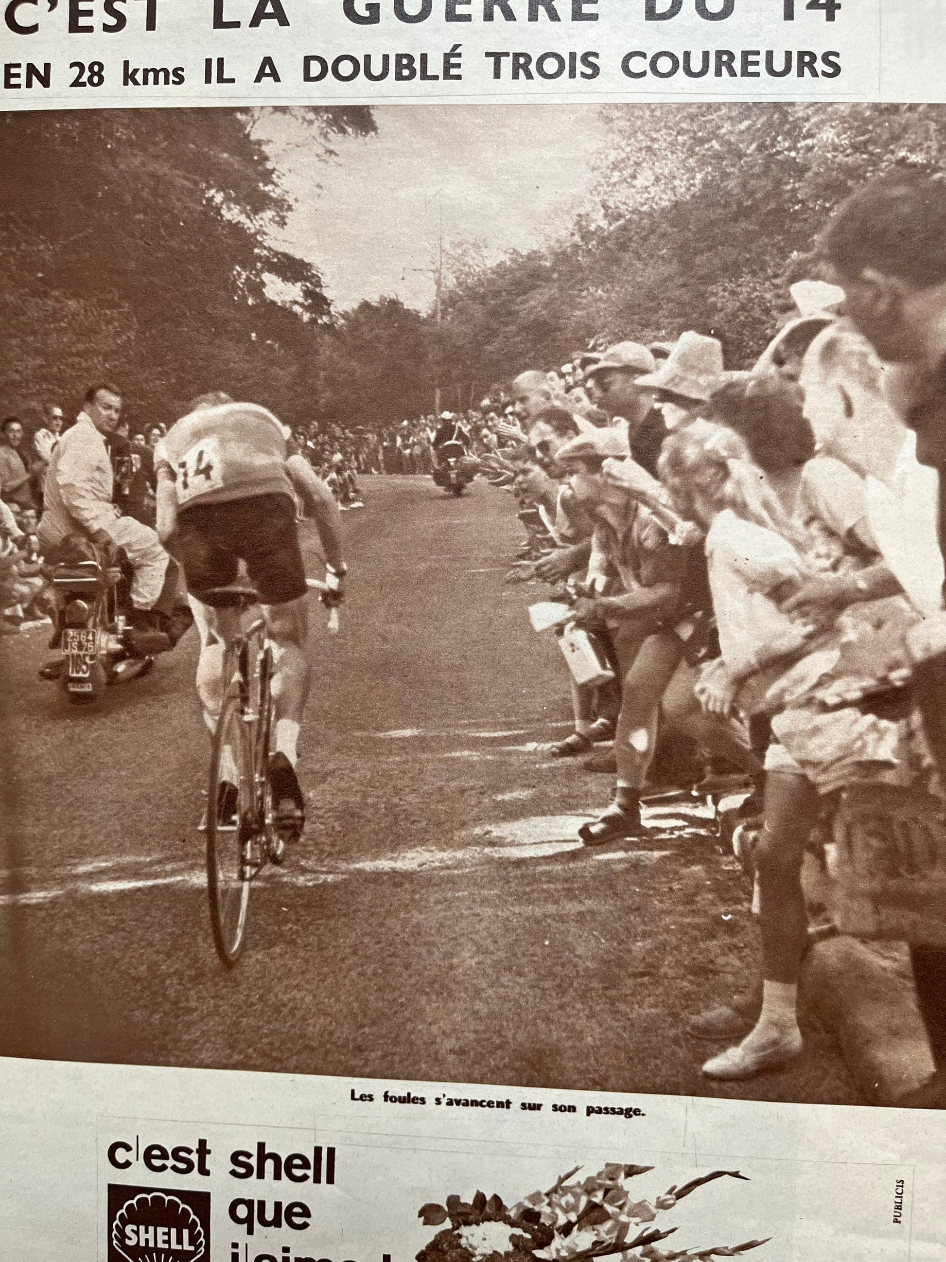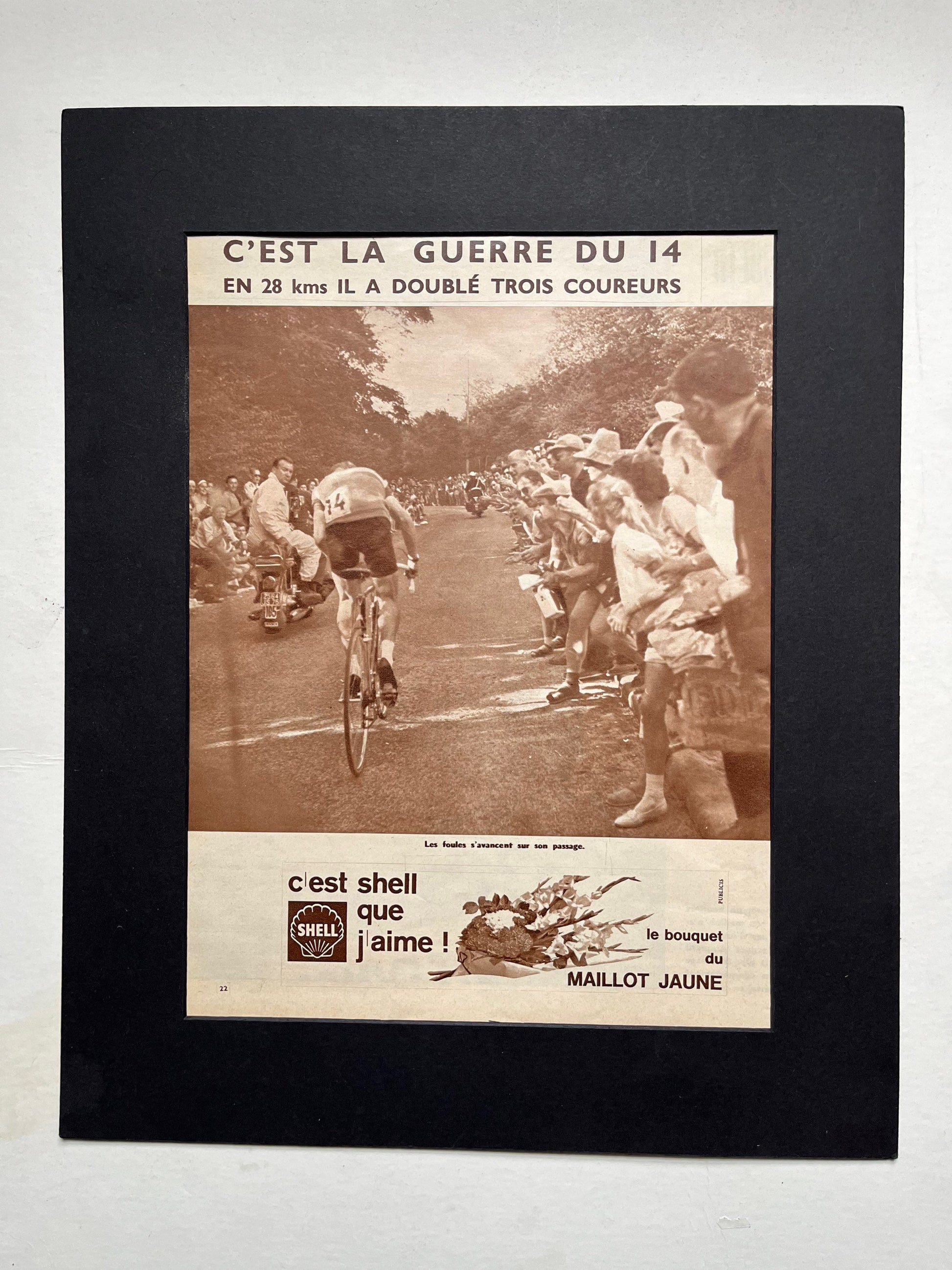 Iconic and very rare Original 1961 French cycling magazine print showing the crowd cheering on a rider. The text at the bottom is a Shell advertisement as the Shell company sponsored the yellow jersey (Maillot Jaune)
