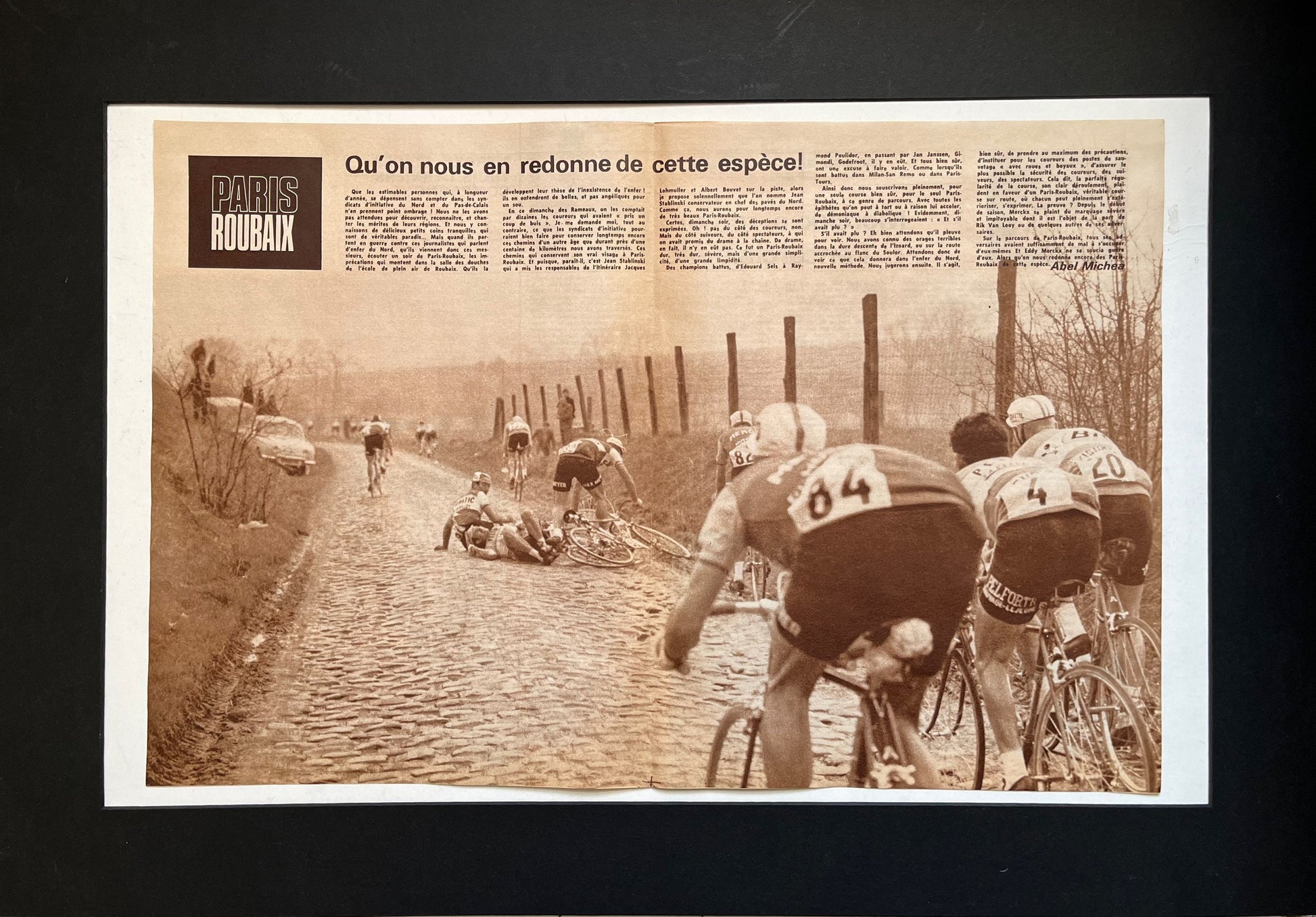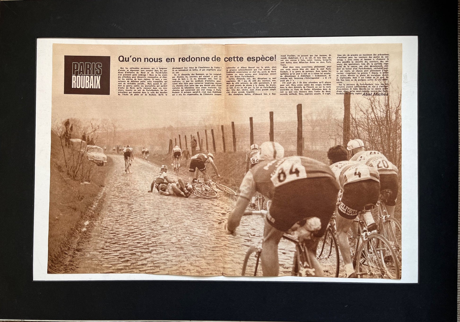Iconic and very rare Original 1967 French cycling magazine print featuring a scene from the famous cobbles of the Paris Roubaix winter race.