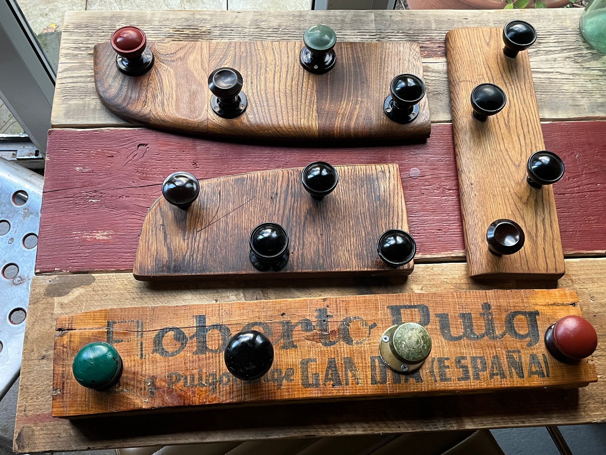 A Vintagehausinterior one off ! Coat hanger made from reclaimed elm and fitted with reclaimed Bakelite 1920s door knobs. Soulful and very cool.