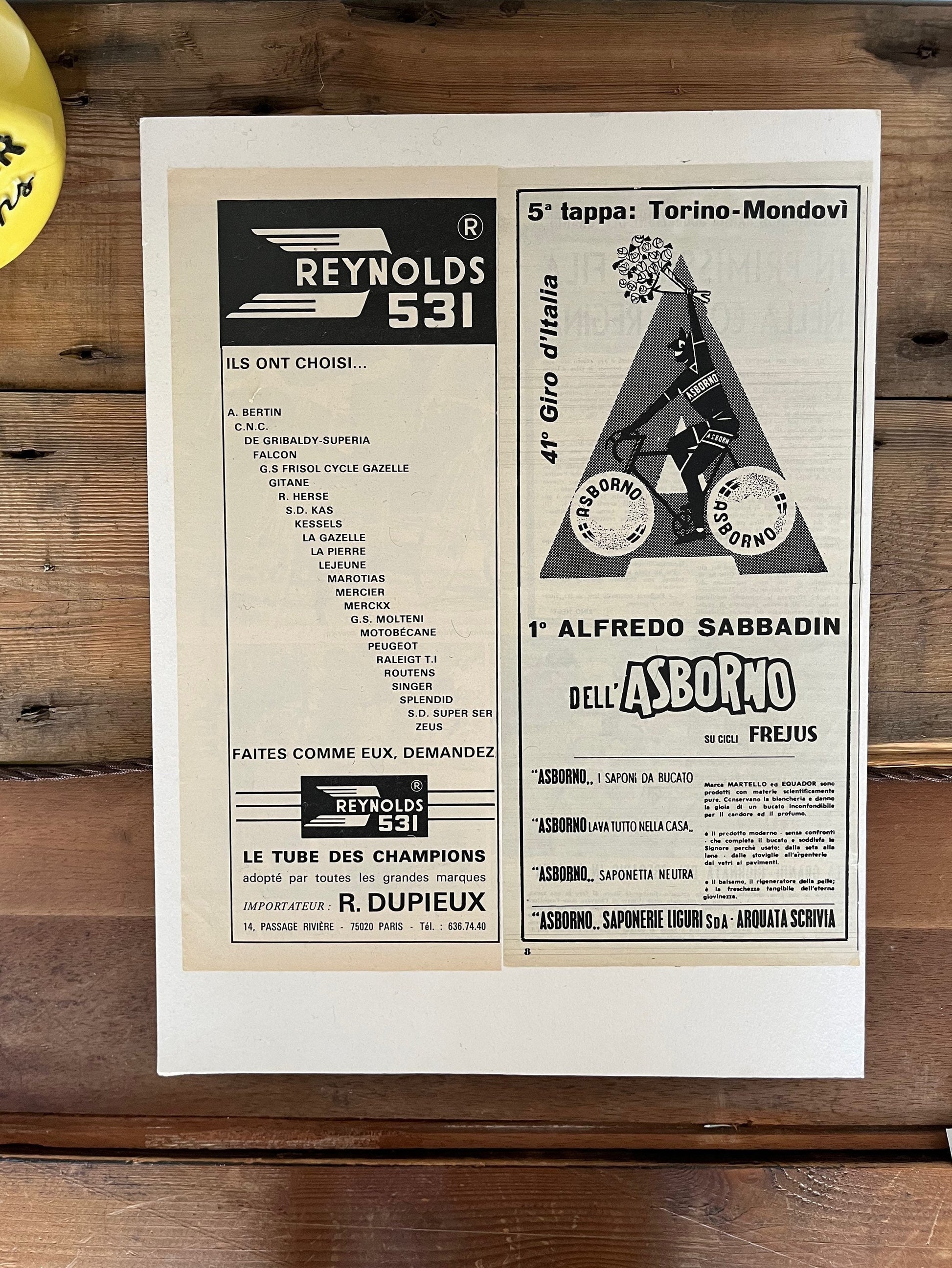 Original 1950s Reynolds 531 advertisement, alongside a Frejus Giro D’Italia advertisement, mounted and ready for framing.