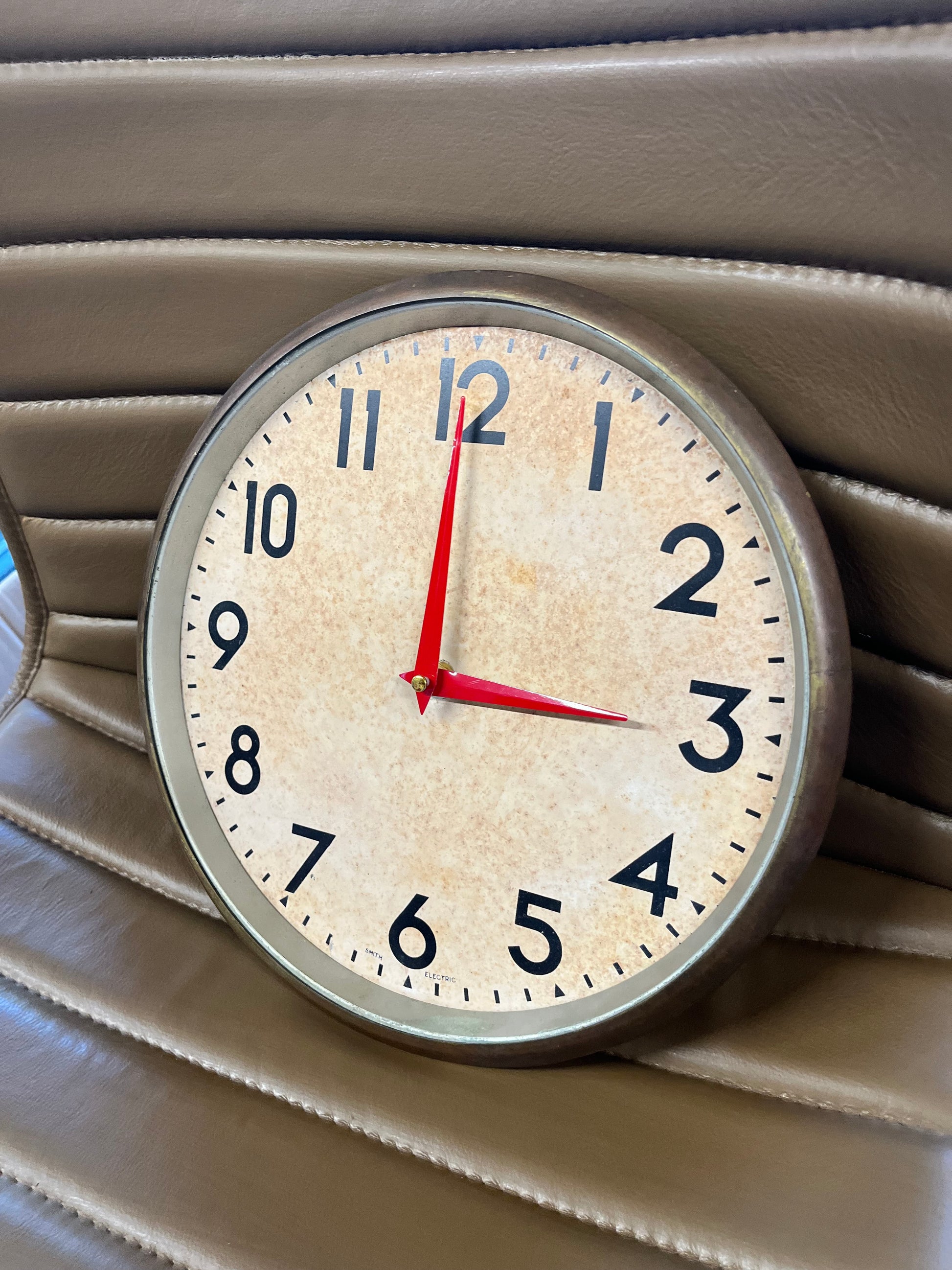 Smiths sectric vintage clock with original patina and brass surround. It’s been fitted with a new quartz mechanism with red hands. No glass.