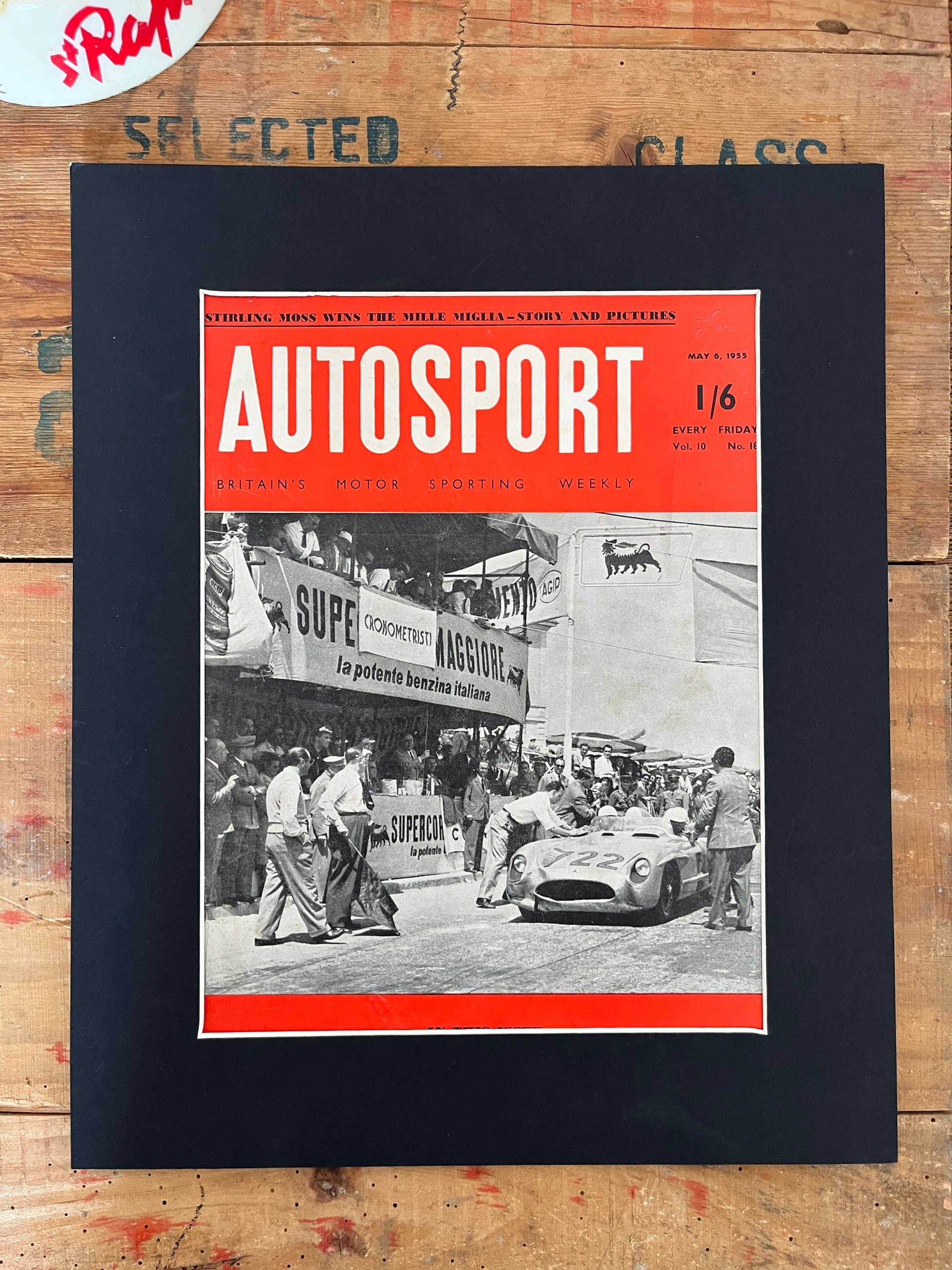 Rare and original 1955 Autosport magazine print featuring Stirling Moss having just won the Italian ‘Mille Miglia’ race in his Mercedes. An historic and very stylish image. This is an original print and not a scanned copy.. A superb piece of artwork A stylish vintage piece of artwork for the lounge, workshop or study. and an excellent gift for the motoring enthusiast. Please note: Your print will be shipped in cardboard packaging to protect it during transit, minus the card surround.