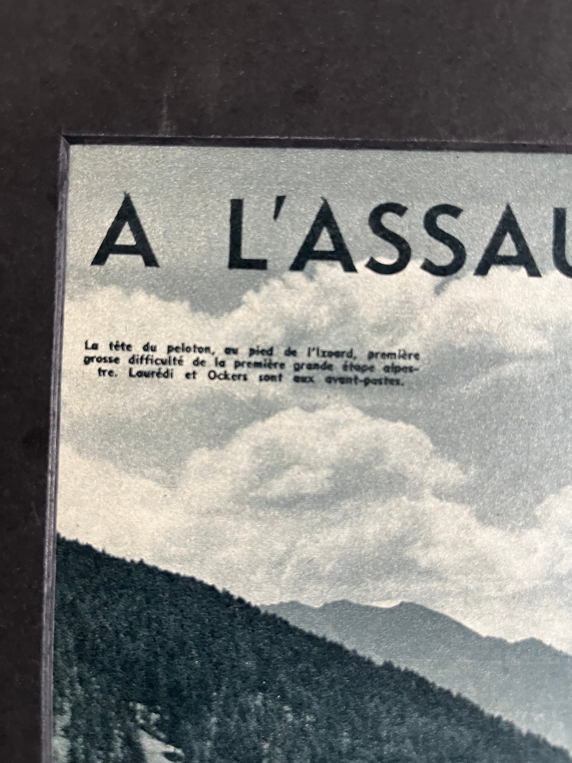 A one off piece of artwork and awesome image! Very rare original early 1960s french cycling magazine poster of Tour de France peloton with the Col d'Izoard in the background