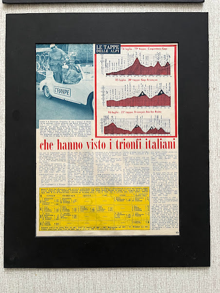 Iconic and very rare Original early 1950s French cycling magazine print showing all seven of the mountain stages in diagrams. Beatifully designed artwork. In Italian language.