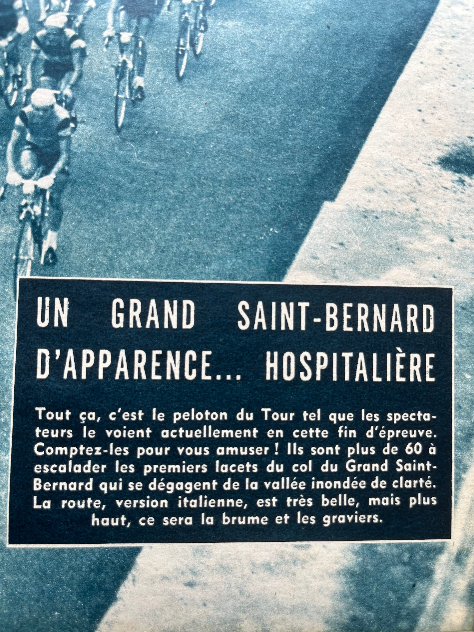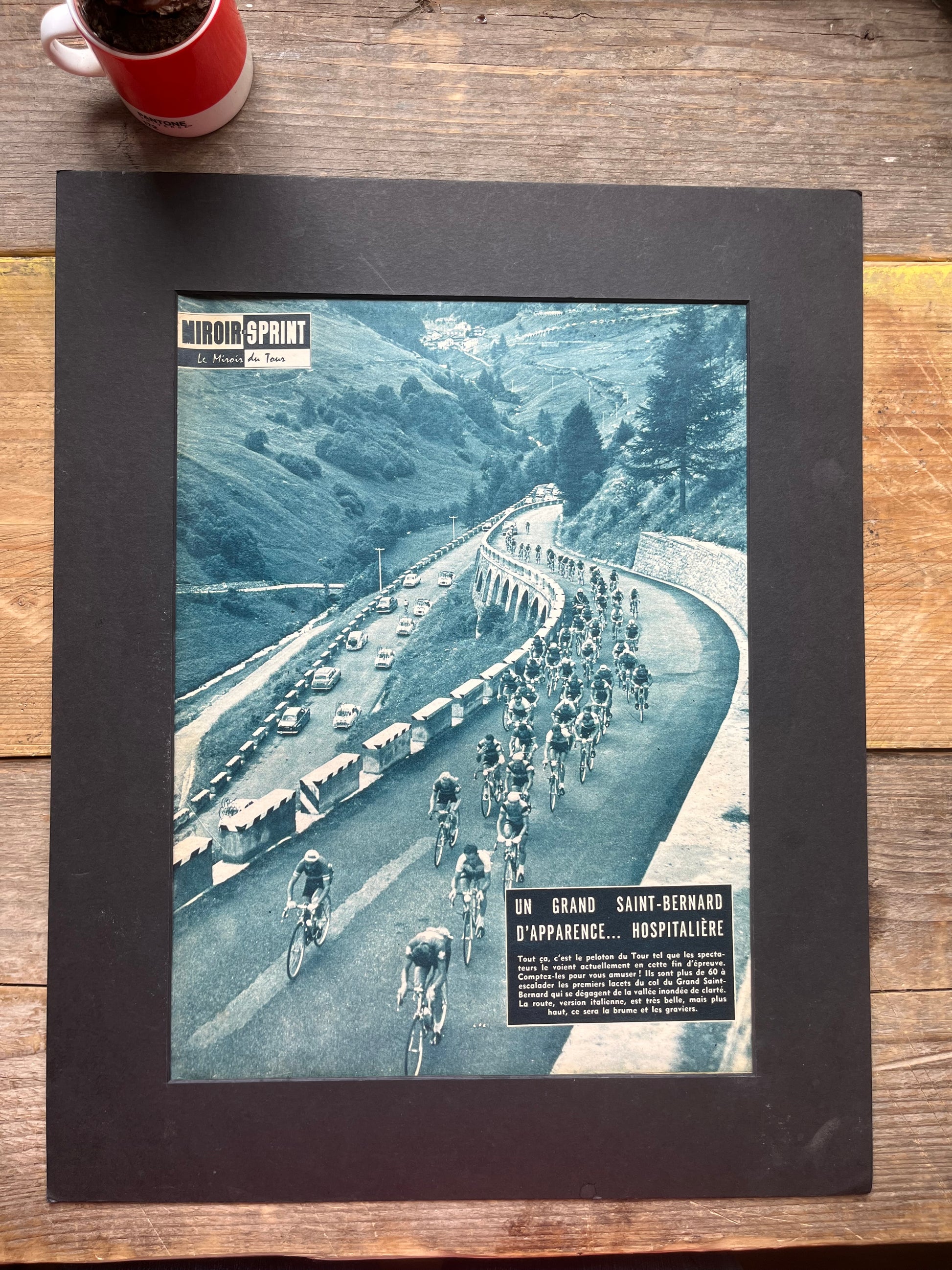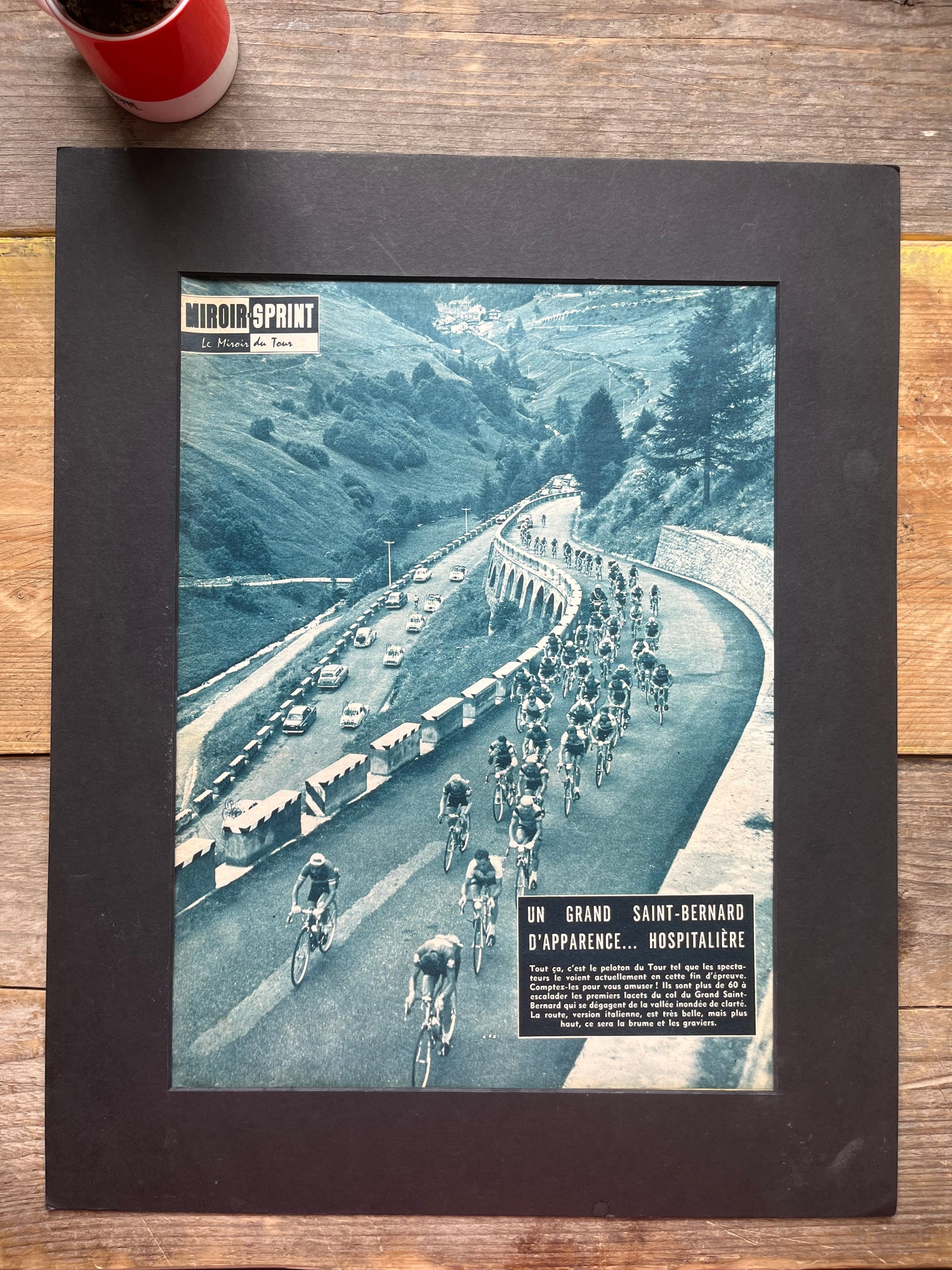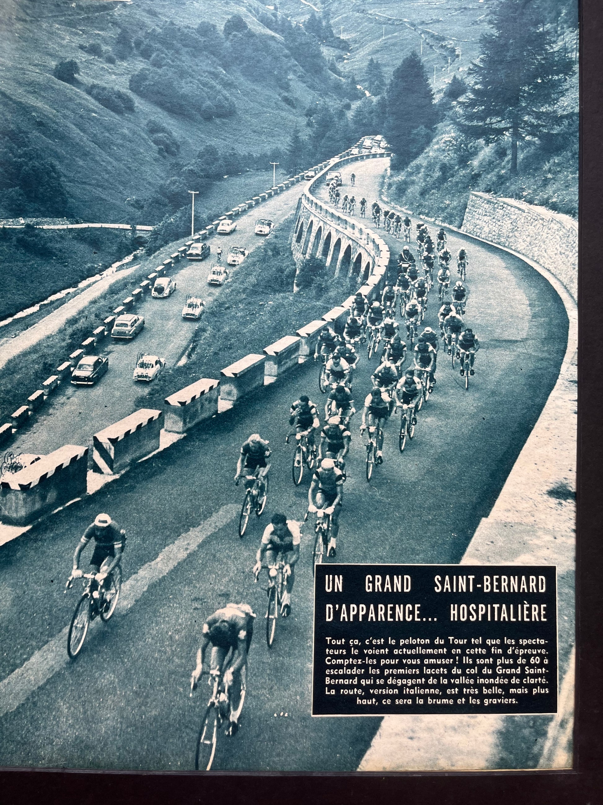 Iconic and rare original late 1950s French cycling magazine print showing the peloton passing through the Val d’Aost mountain stage with the Grand St Bernard mountain in the background.