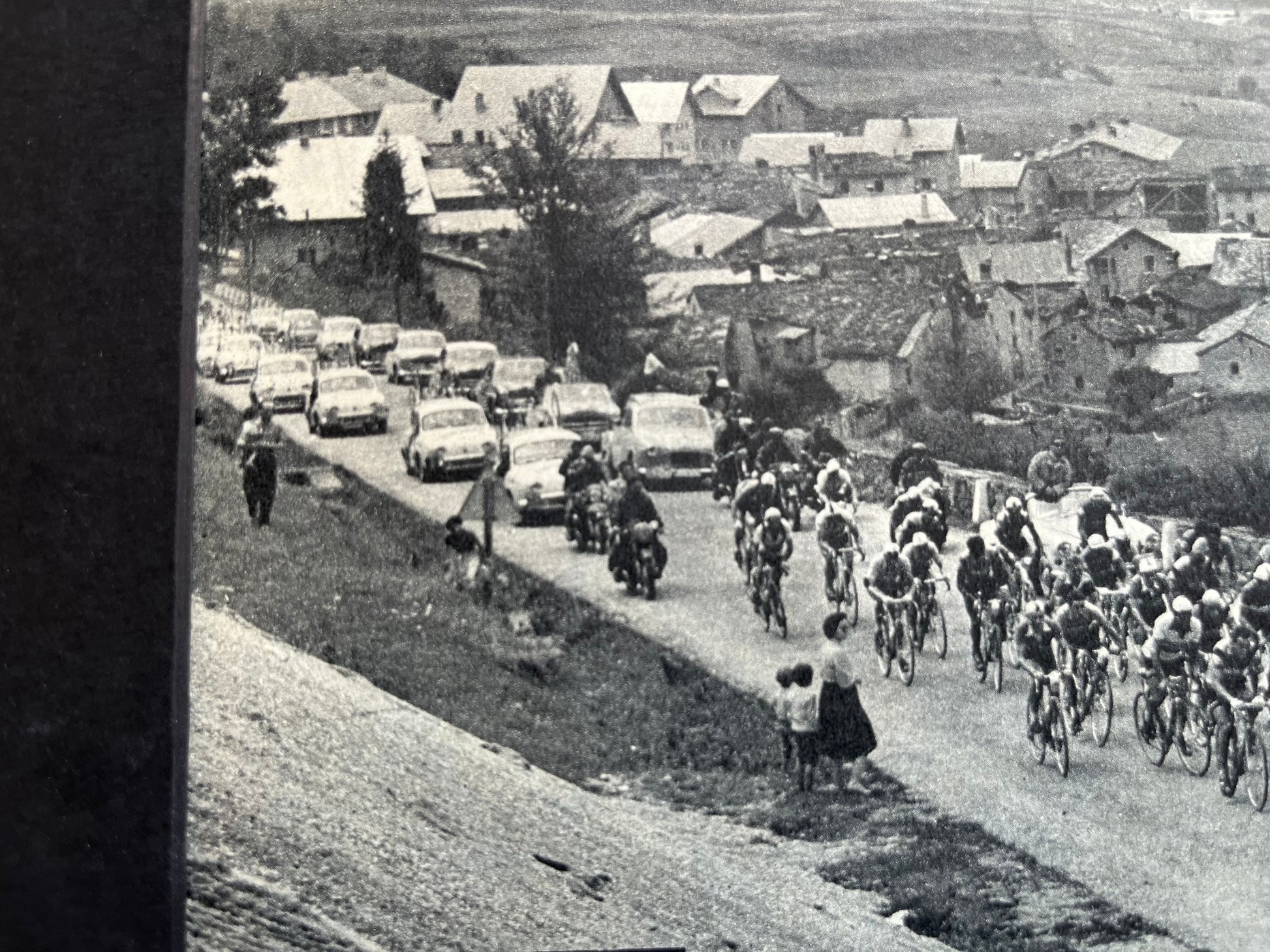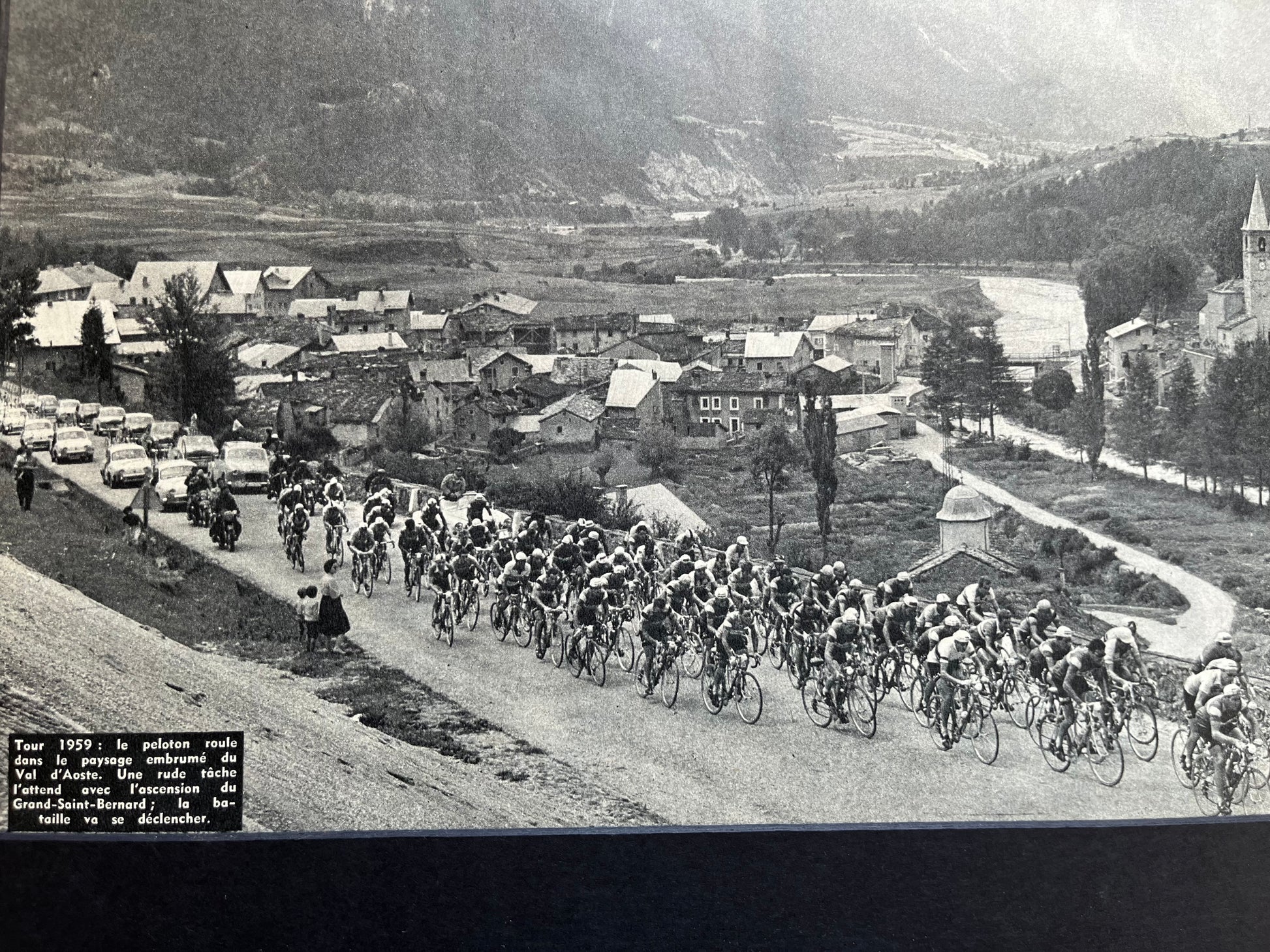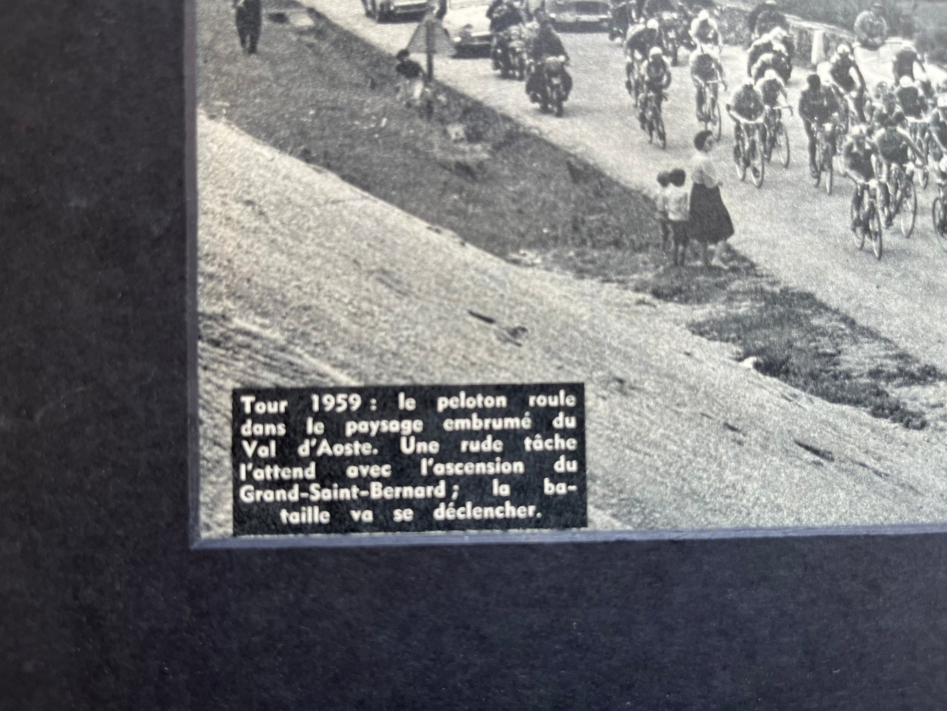 Iconic and rare original late 1950s French cycling magazine print showing the peloton passing through the Val d’Aost mountain stage with the Grand St Bernard mountain in the background.