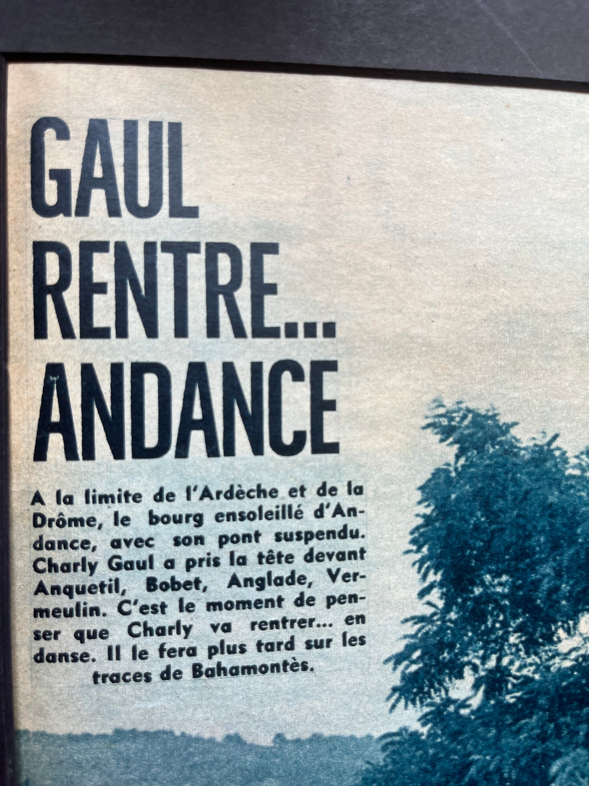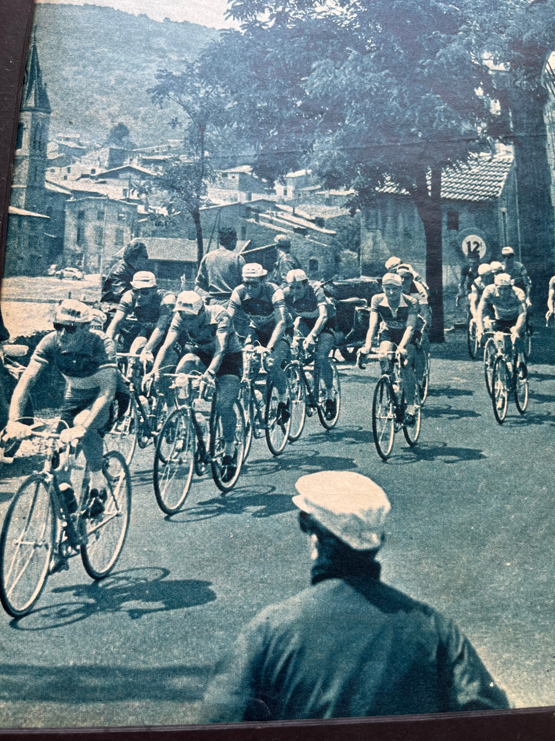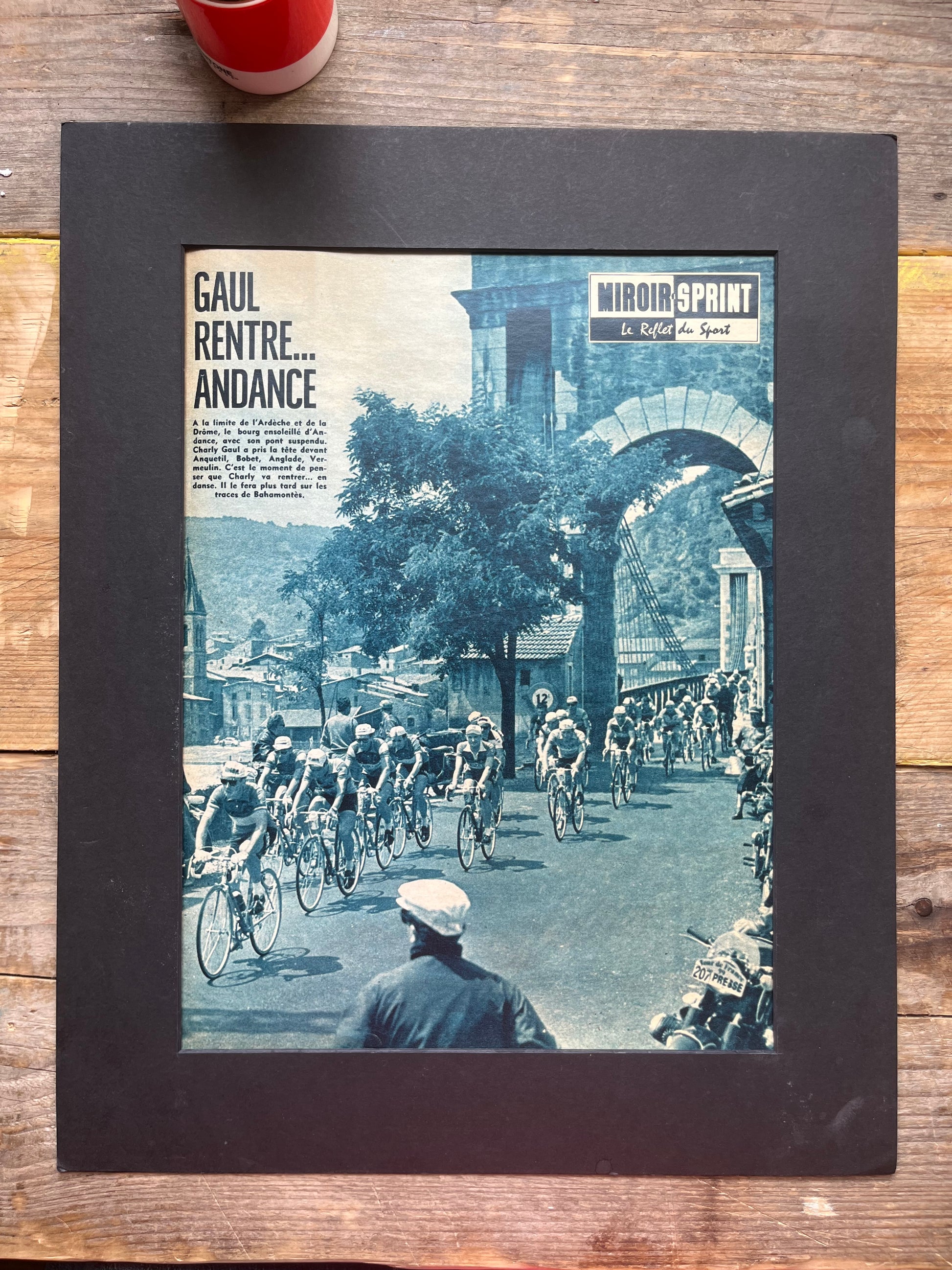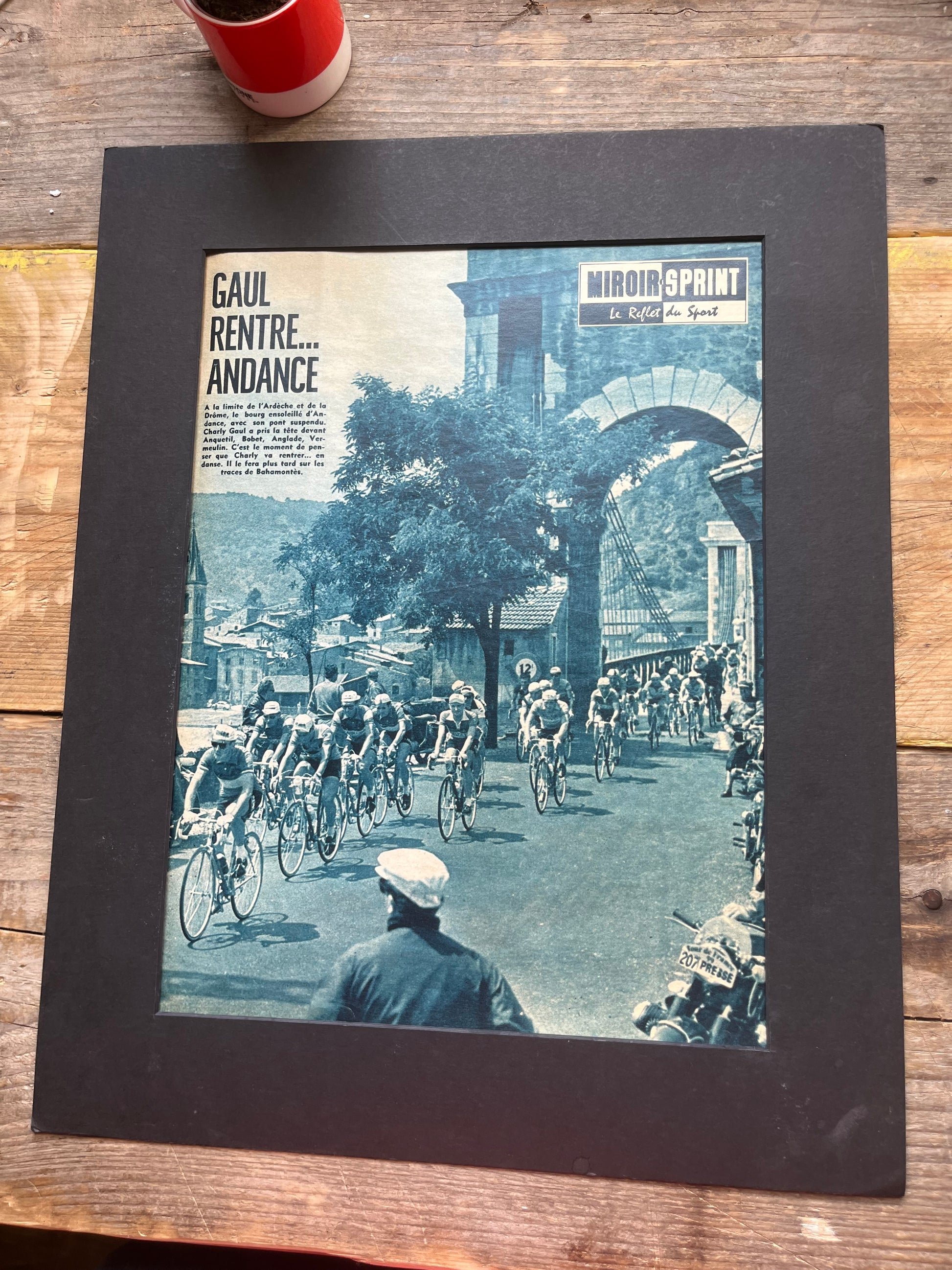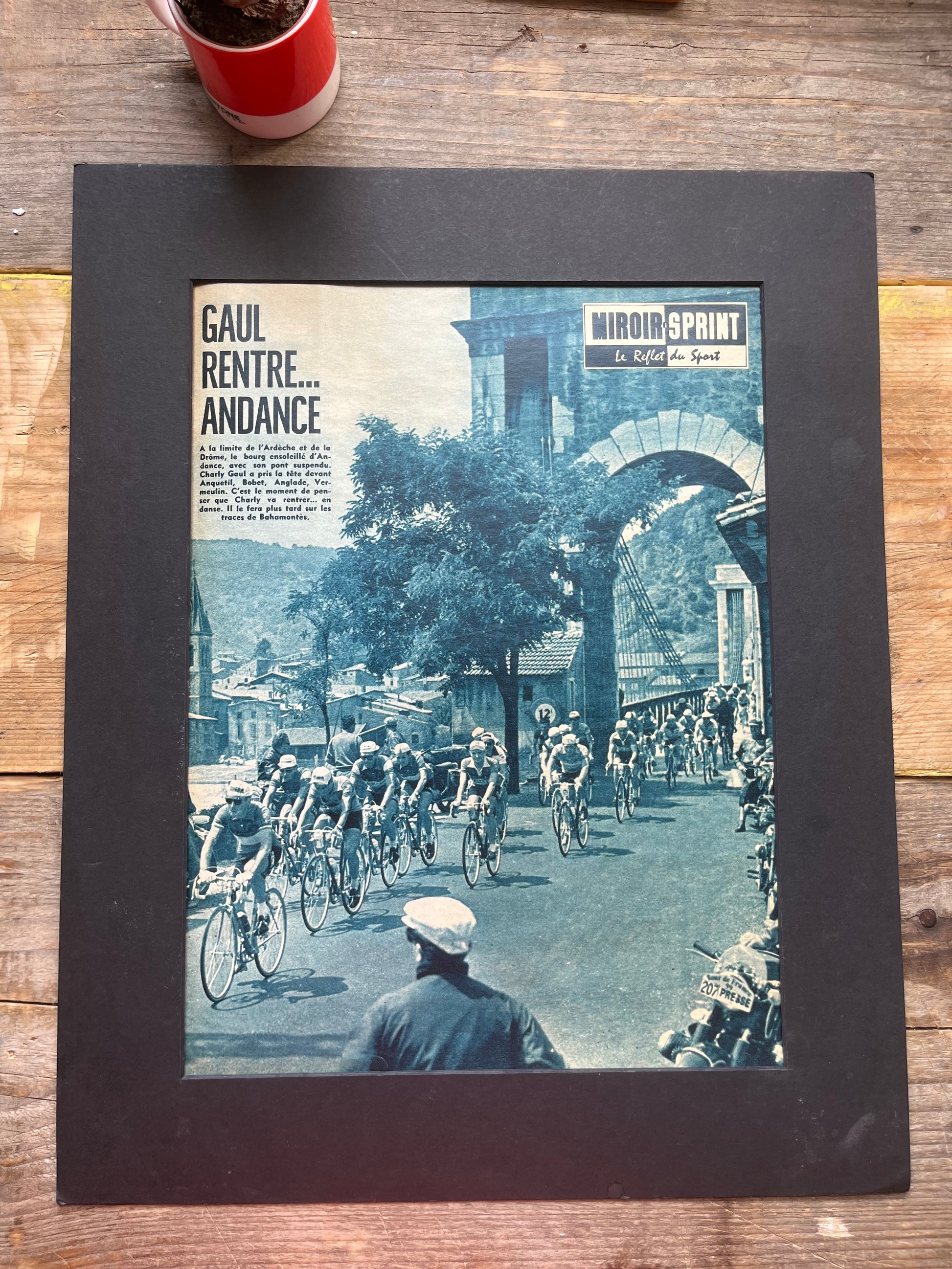 Iconic and rare original late 1950s French cycling magazine print showing the peloton passing through Andance, in the Ardeche region. Riders include Charly Gaul and Federico Bahamontes.