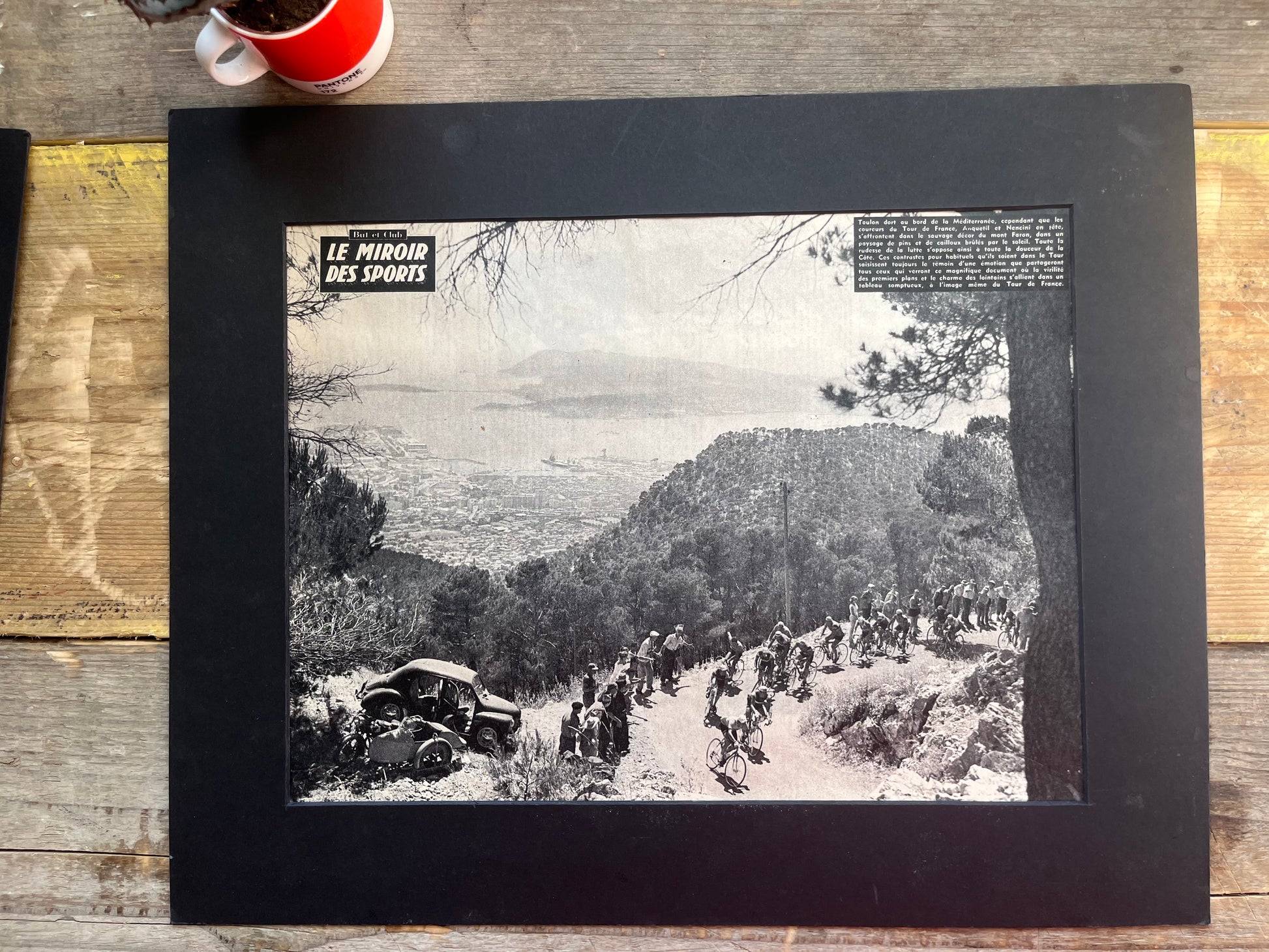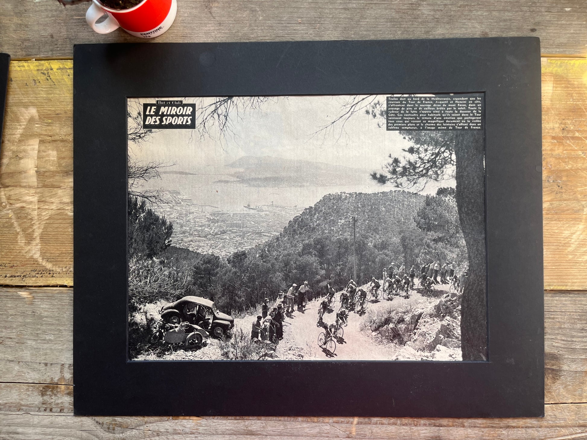 Iconic and very rare original late 1950s French cycling magazine print showing the peloton passing through Toulon on a winding descent. Absolutely stunning aerial photography.