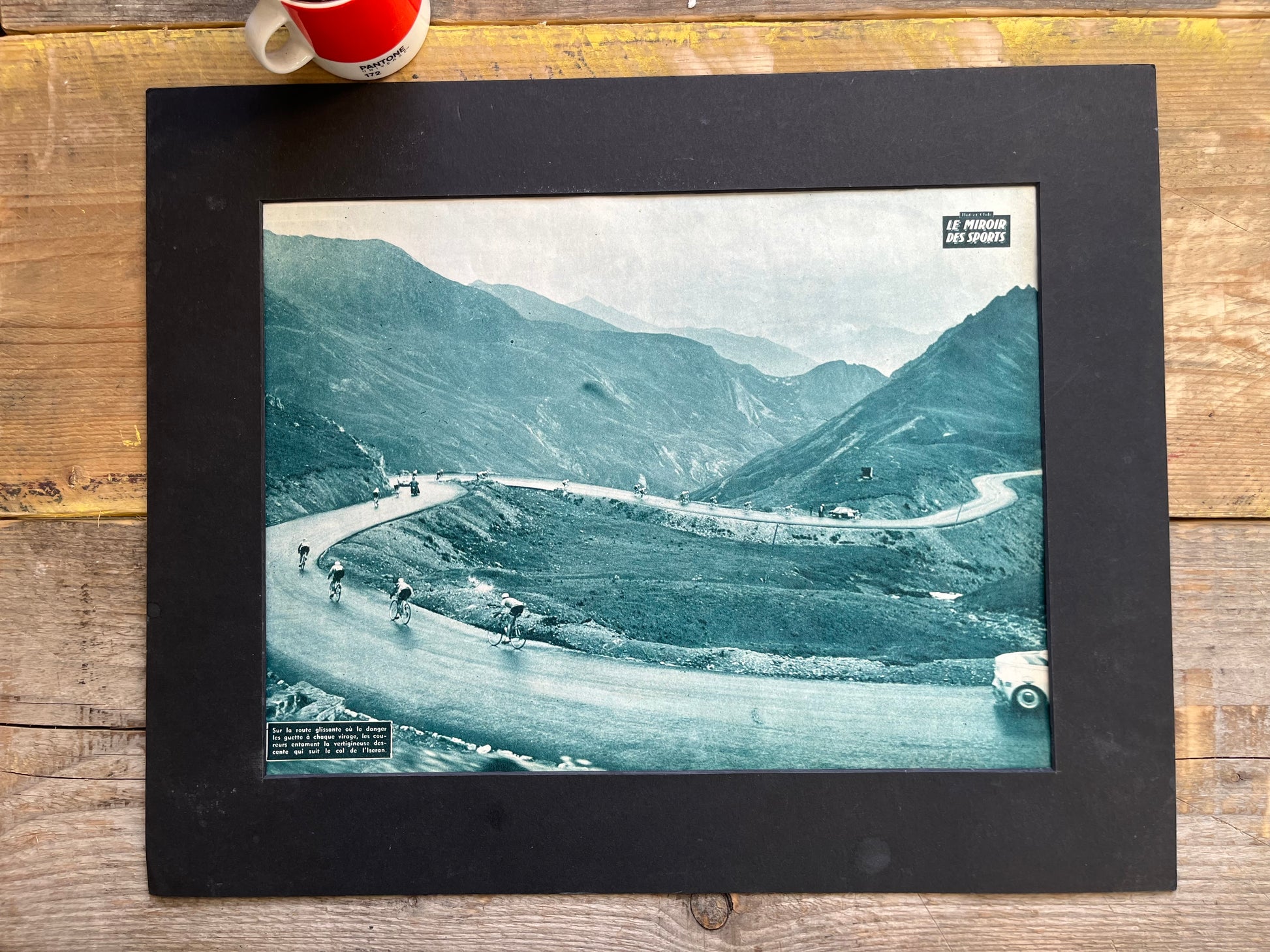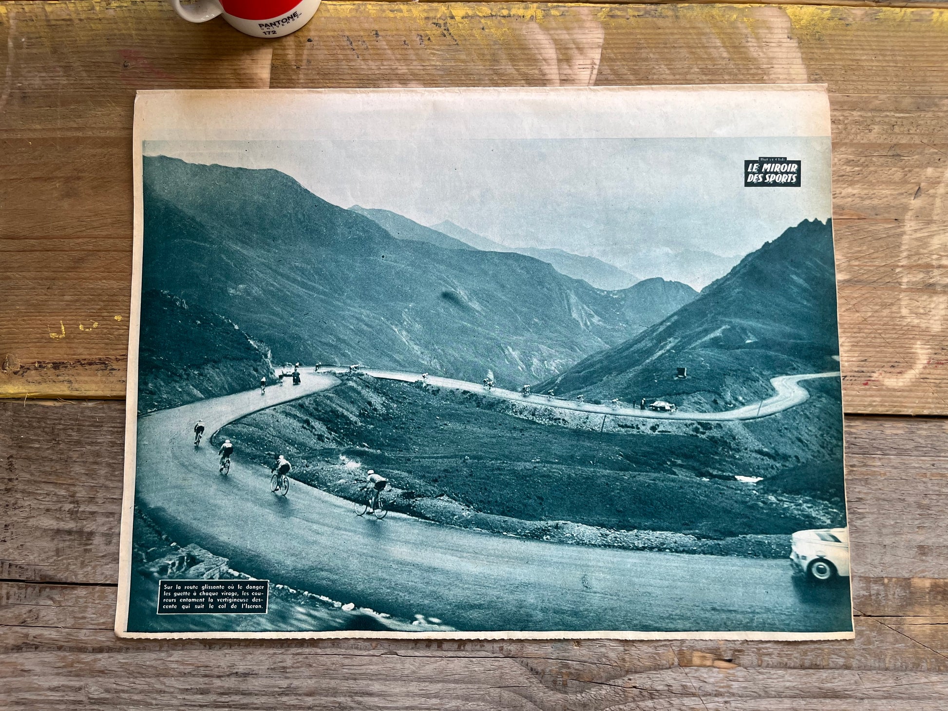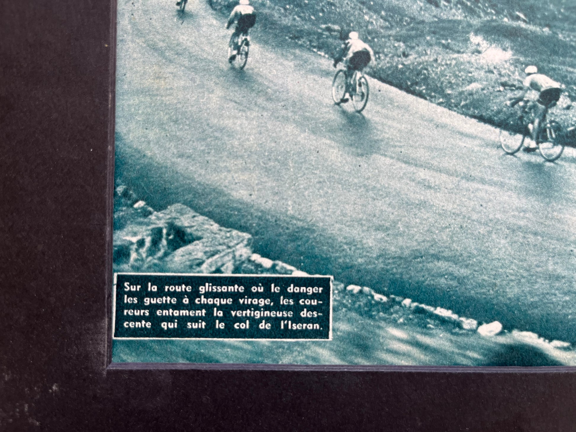 Iconic and very rare original late 1950s French cycling magazine print showing the peloton passing through the col d’Iseran mountain stage.