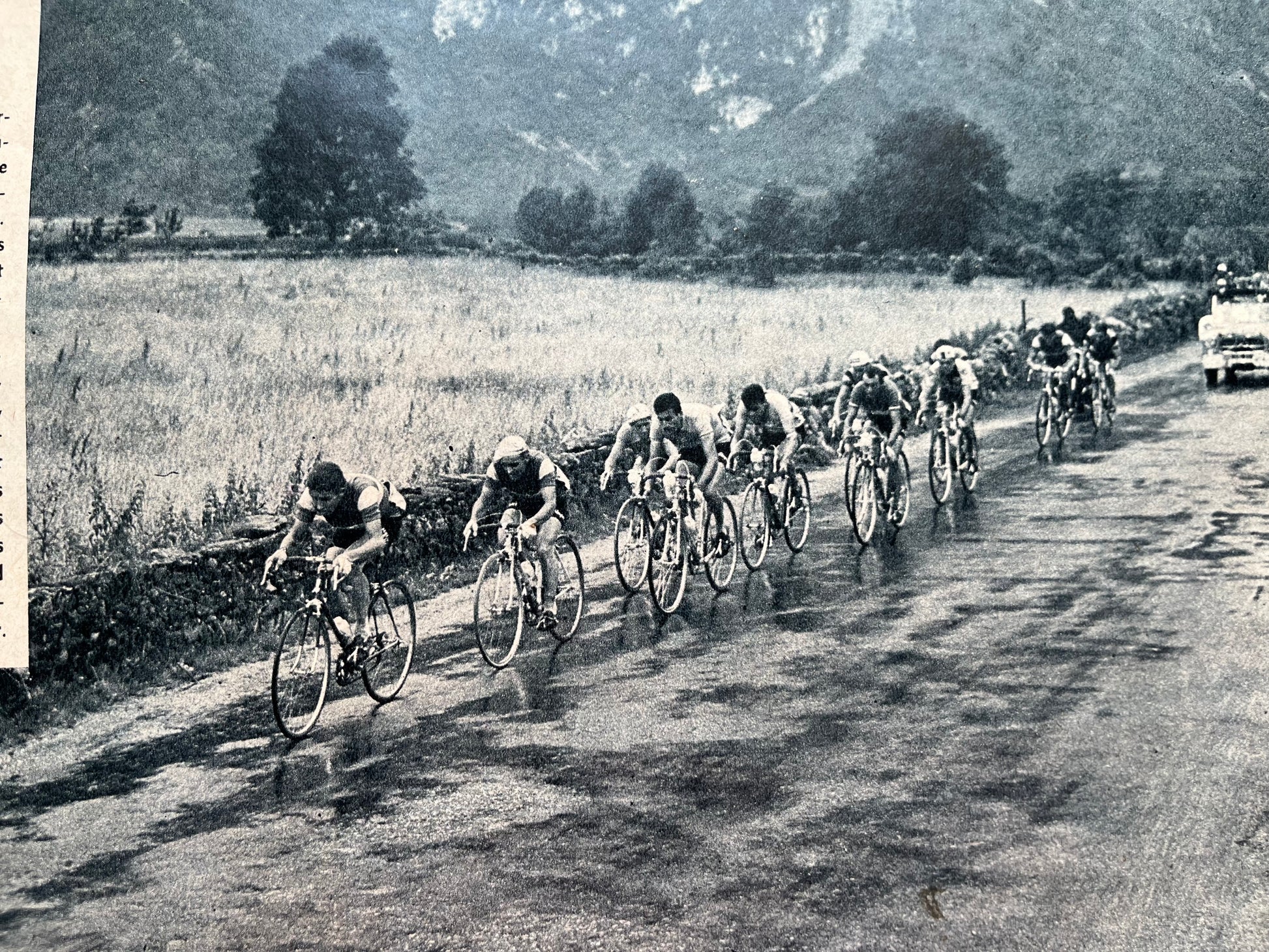Iconic and very rare original late 1950s French cycling magazine print showing the peloton passing through the col d’Iseran mountain stage.