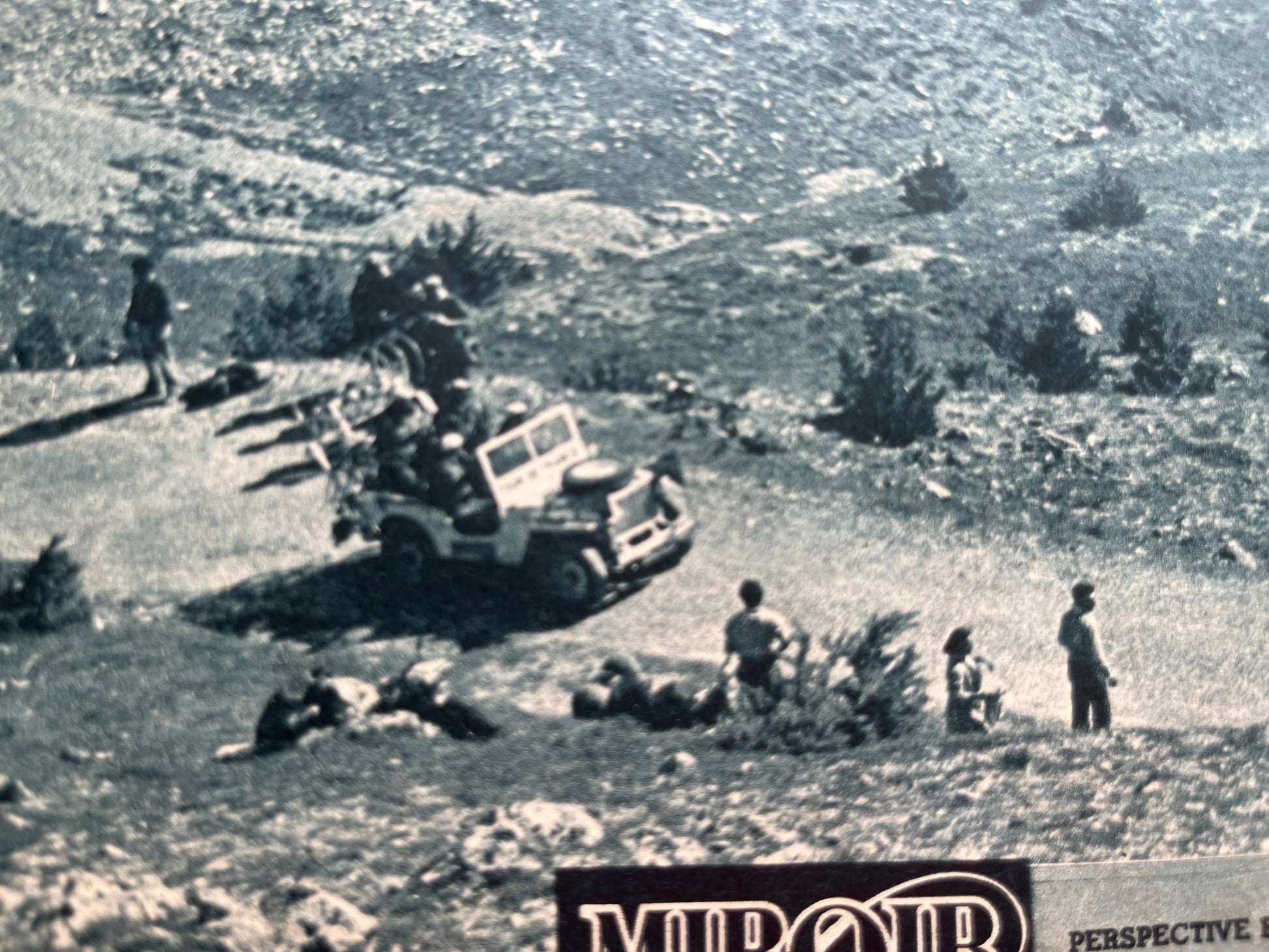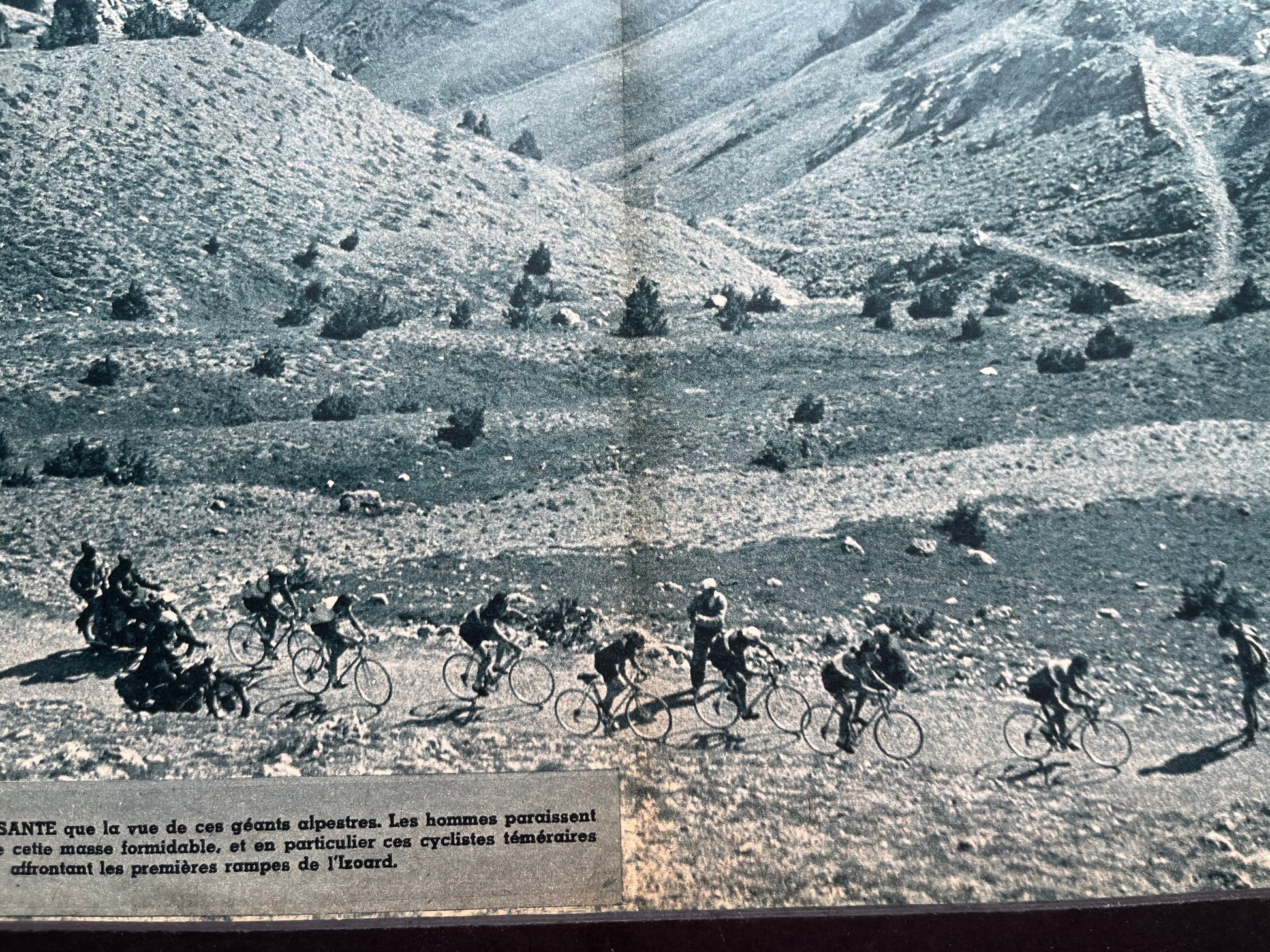 Iconic and very rare original 1950s aerial photograph from a French cycling magazine showing the peloton passing through the col d’Izoard mountain stage. Riders include Fausto Coppi and Louison Bobet.
