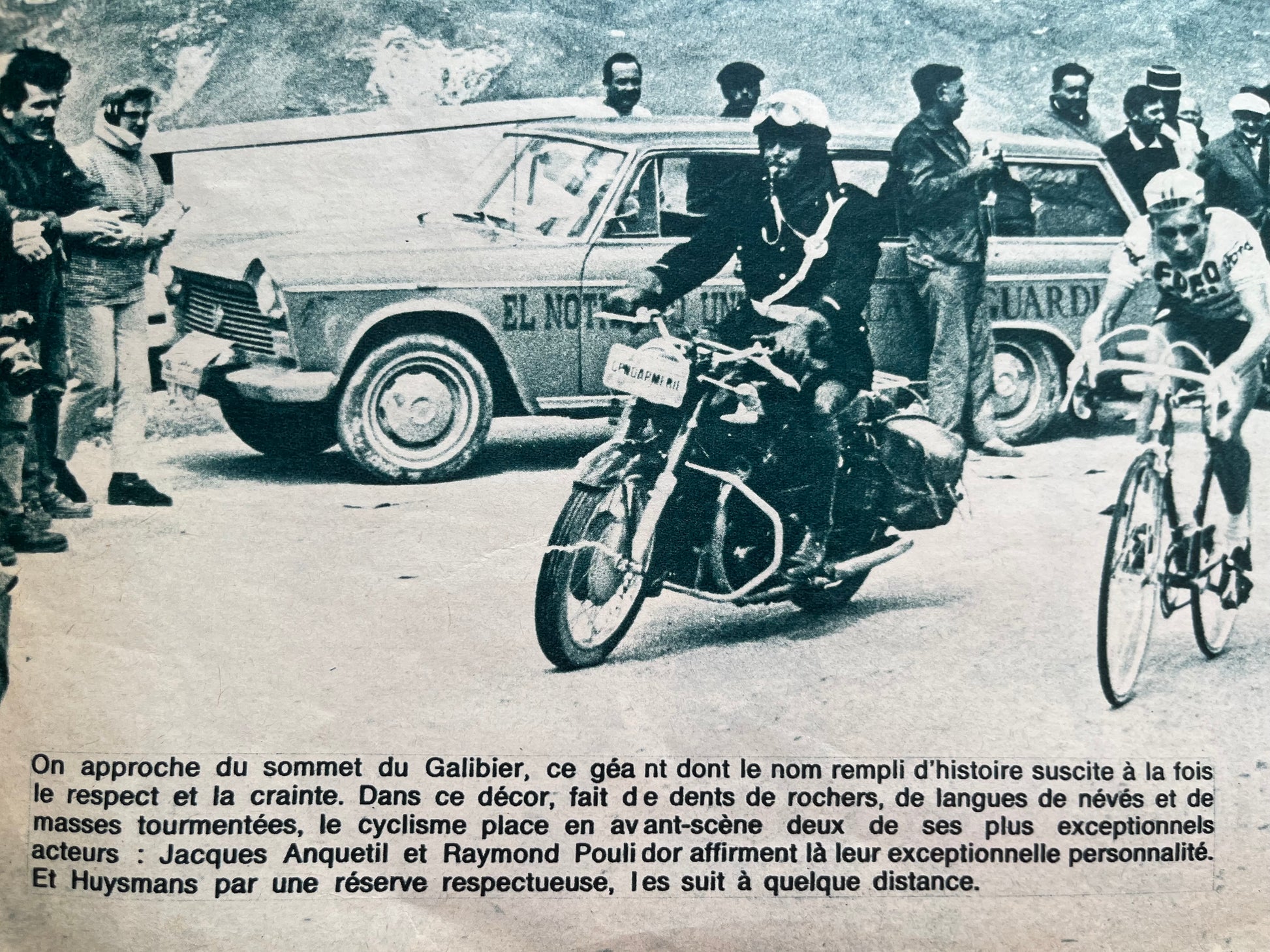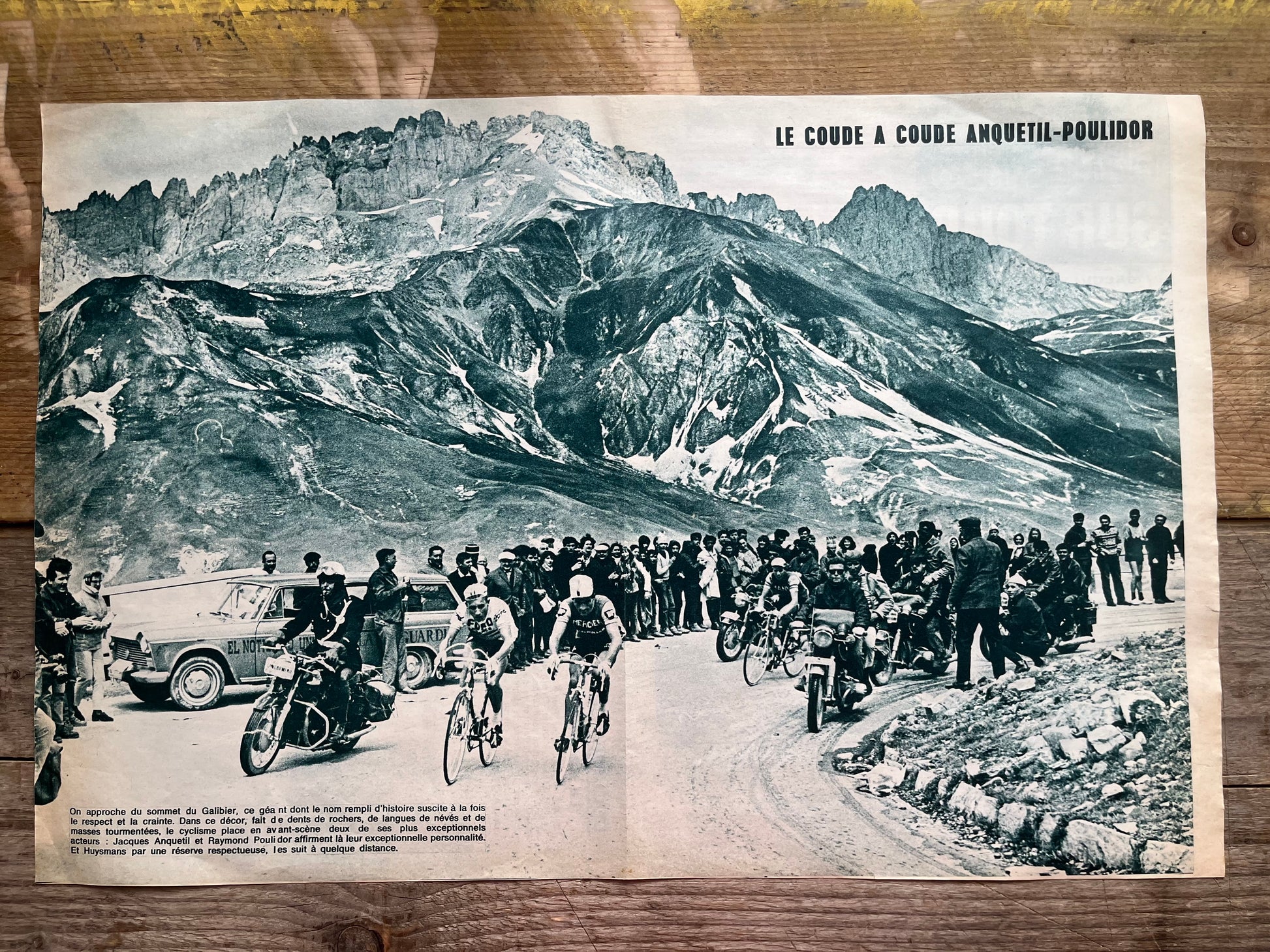 Iconic and very rare original 1965 French cycling magazine print showing Jacques Anquetil and Raymond Poulidor leading the peloton passing through the col du Galibier alps stage of the tour.