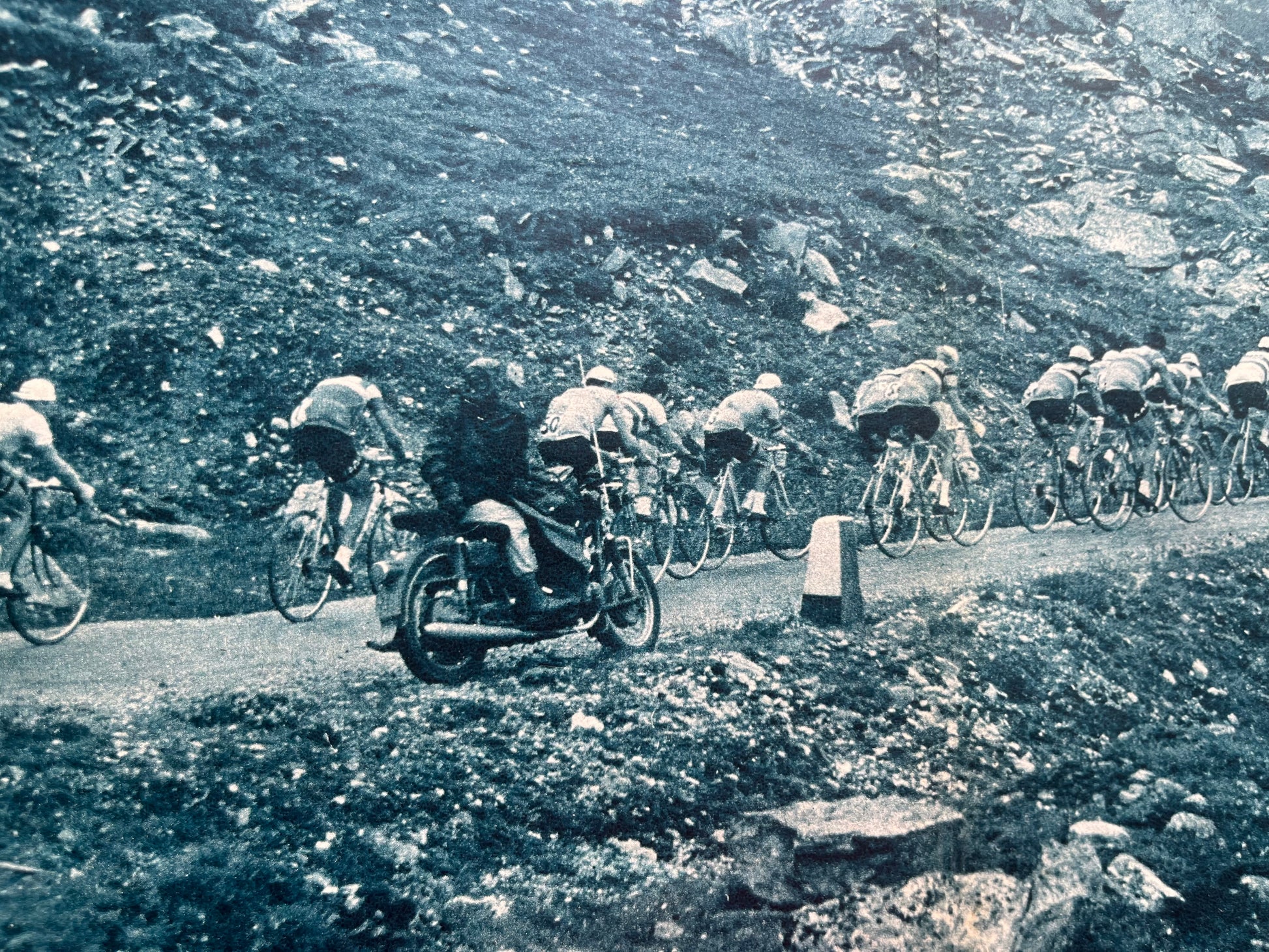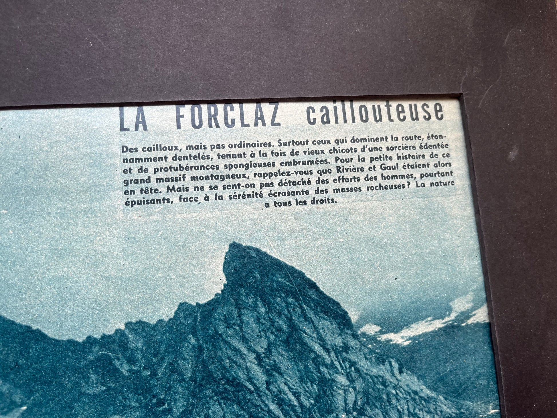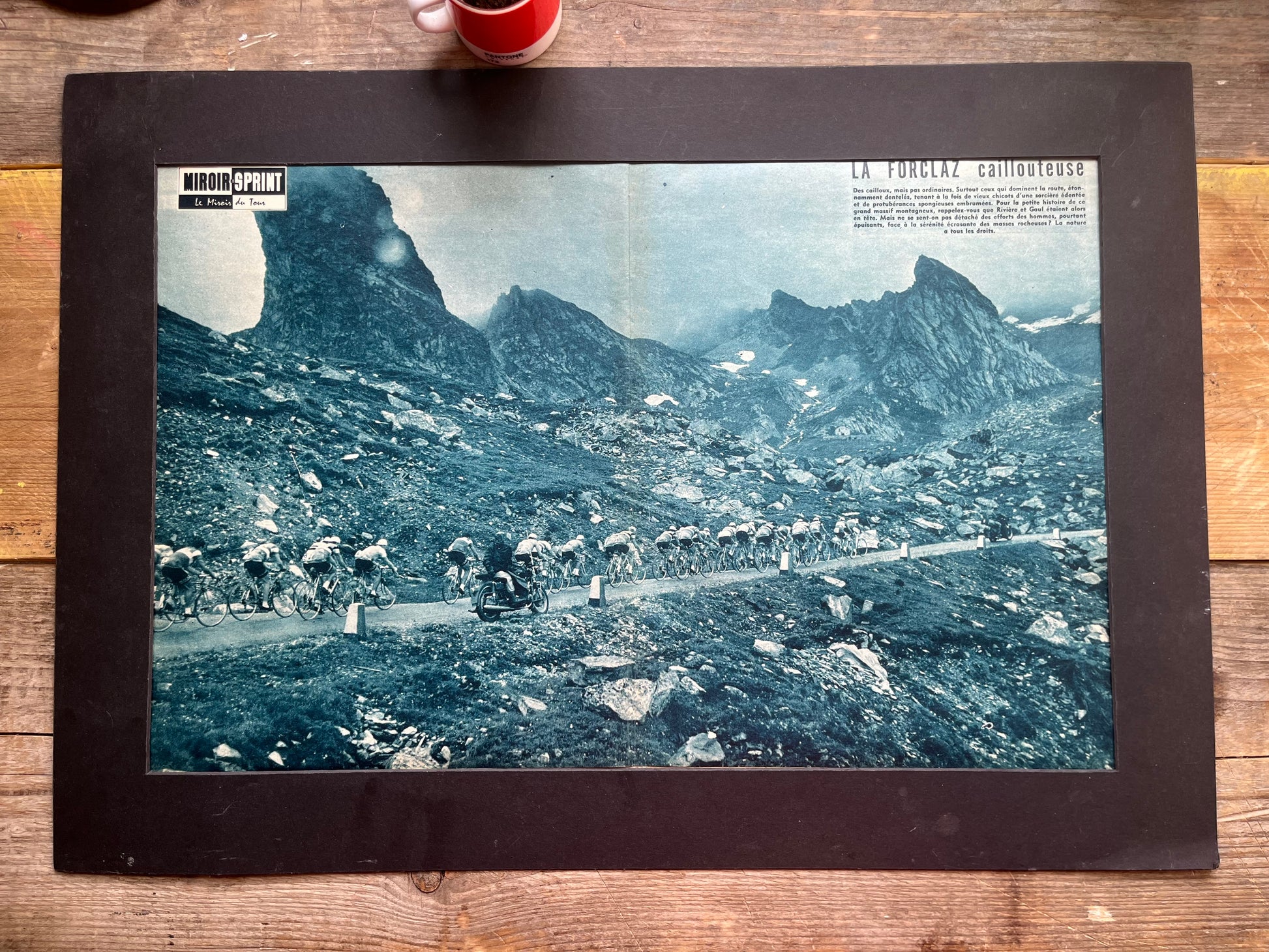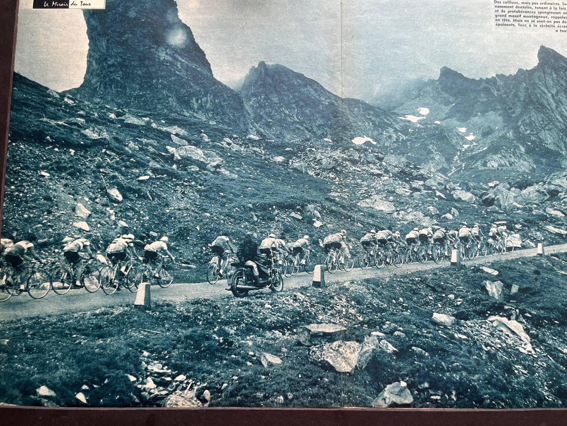 Iconic and very rare original late 1950s French cycling magazine print showing the peloton passing through the col d’Iseran mountain stage.