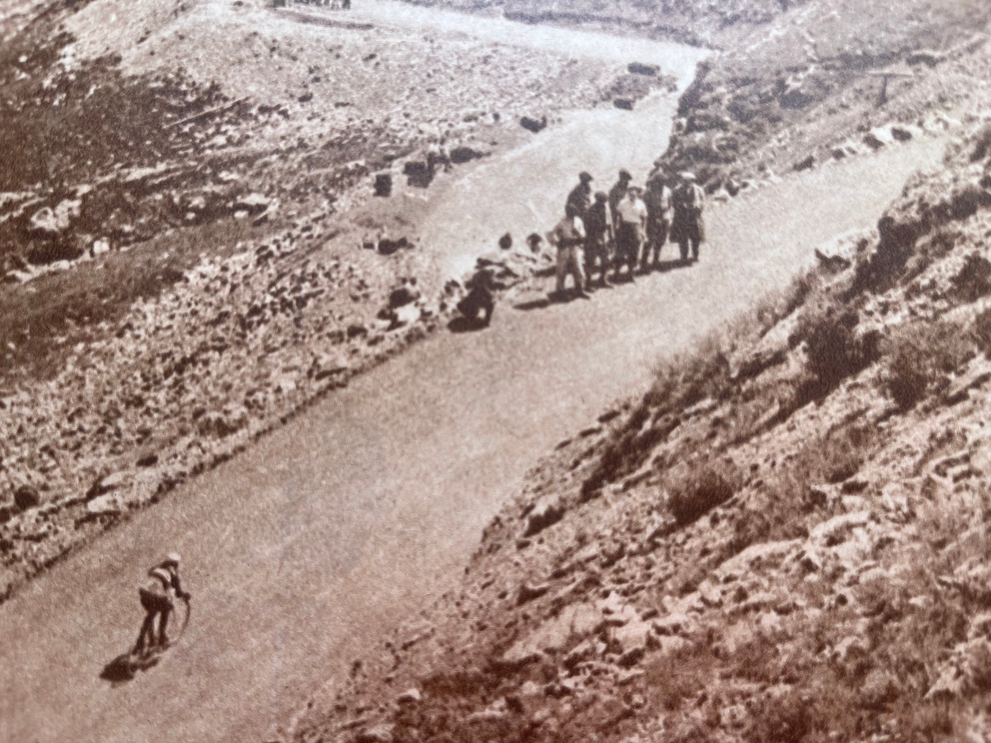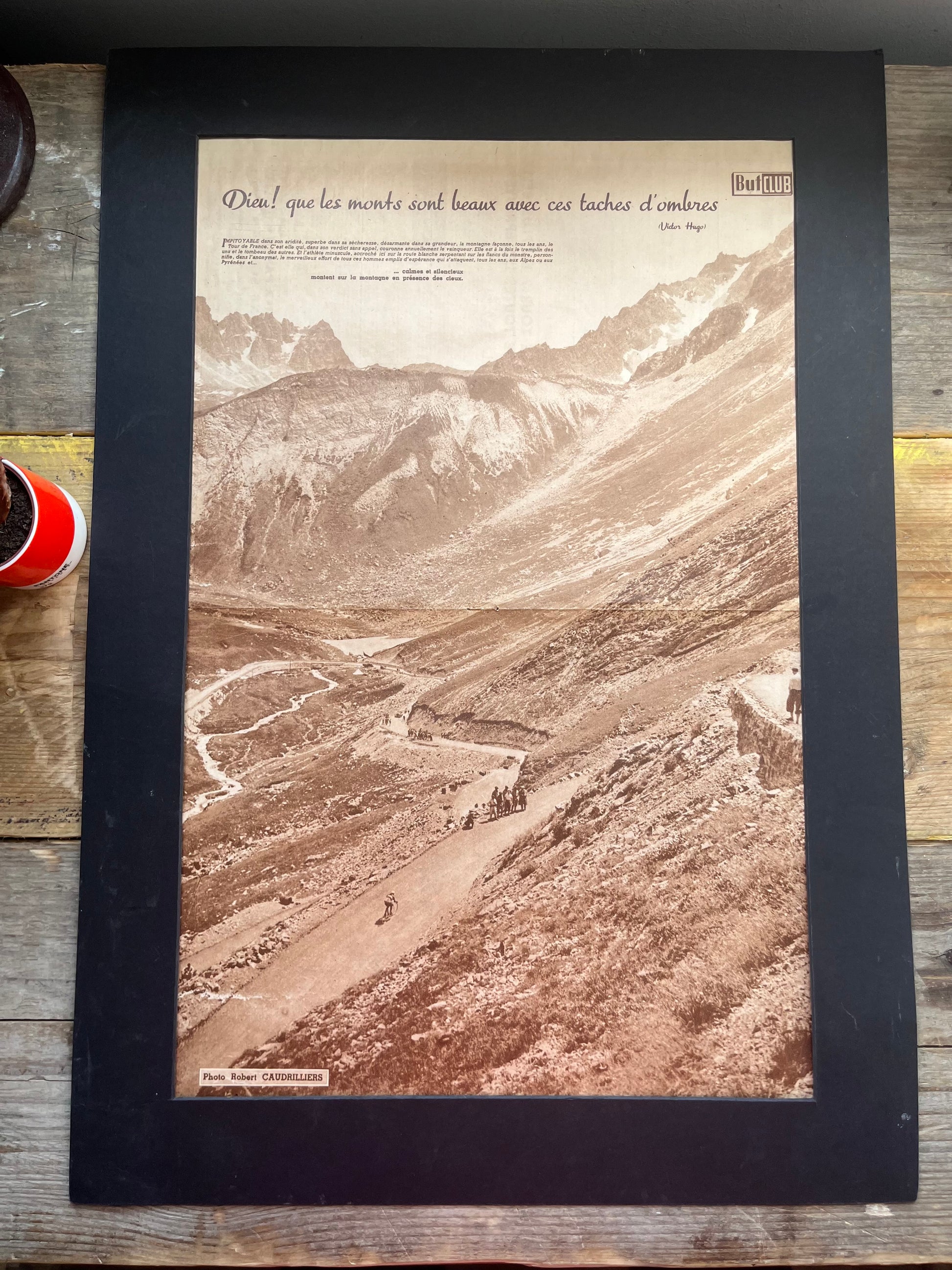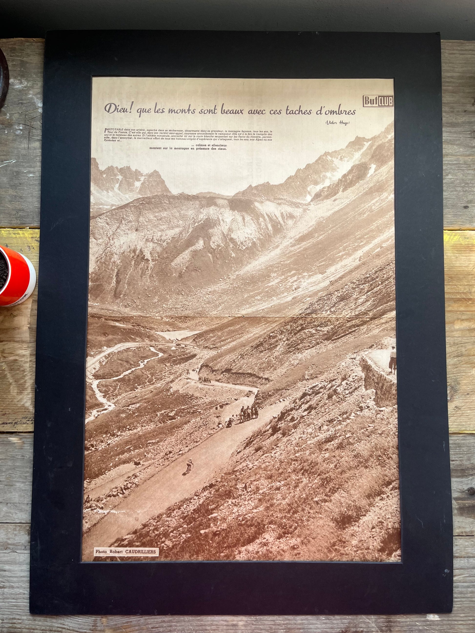 Iconic and very rare original 1950s French cycling magazine print showing a single rider passing through the Pyrenees on a stage of the tour de France.