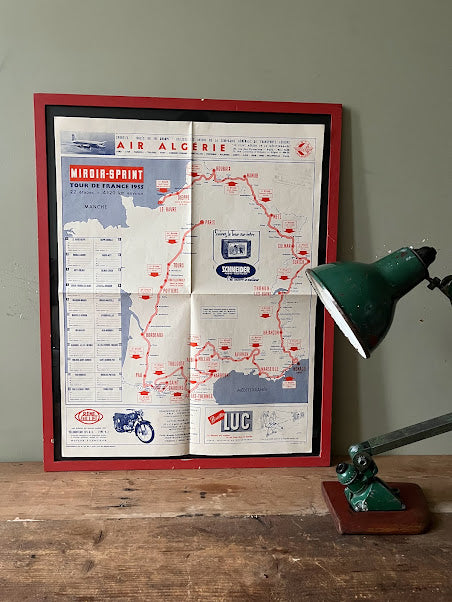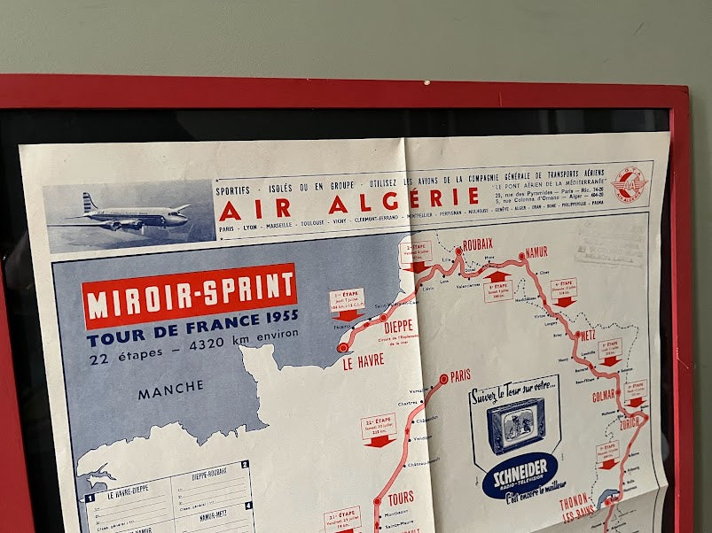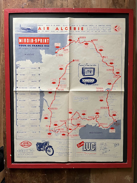 Beautiful old original genuine 1955 Tour de France route map, showing all 21 stages of the Tour de France from an old french cycling magazine. These maps would have been sold so that people could follow the tour at home or in bars and restaurant, where they were possibly displayed on walls.
