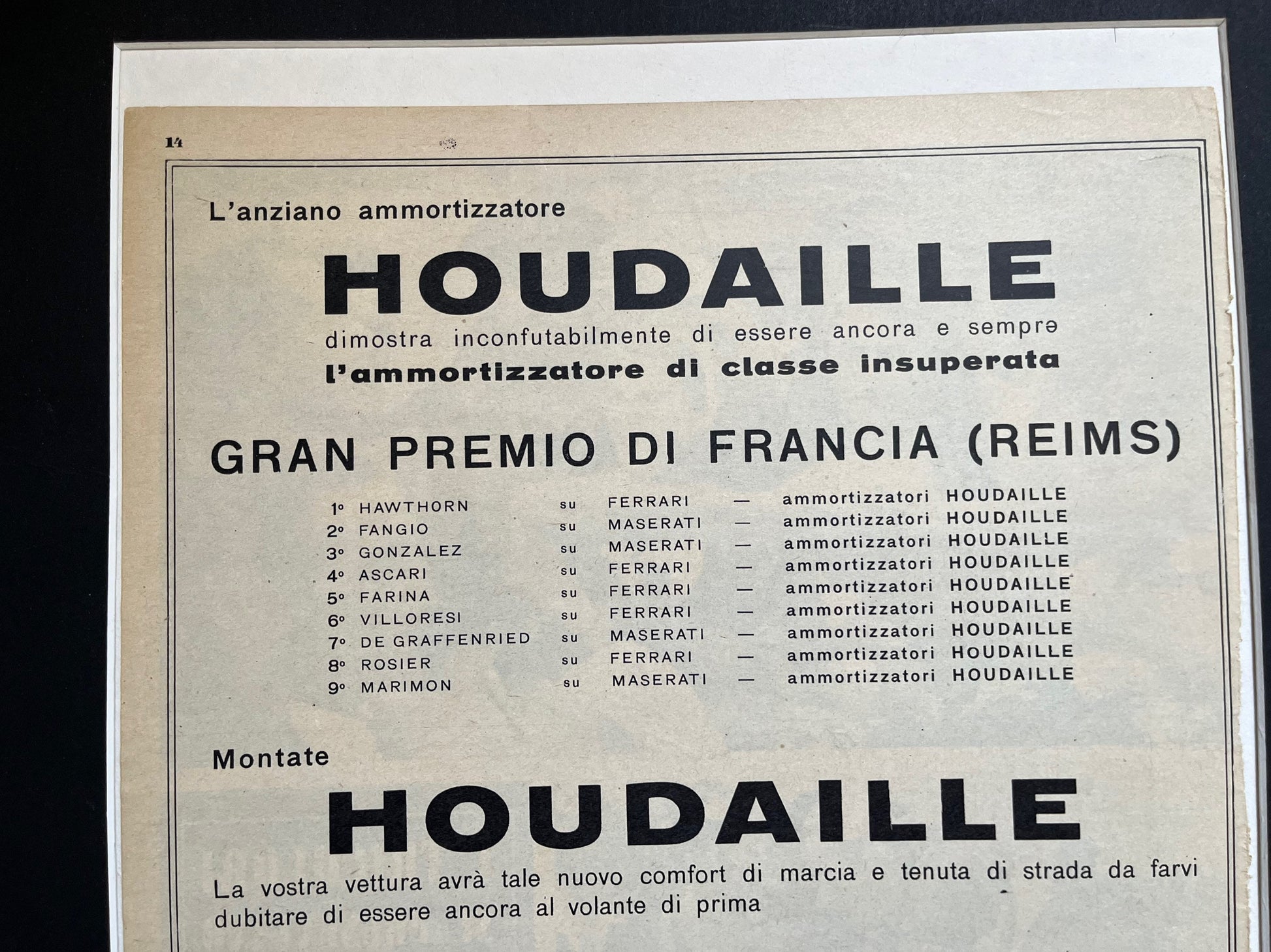Original 1950s Houdaille car components Grand Prix advertisement, mounted and ready for framing.