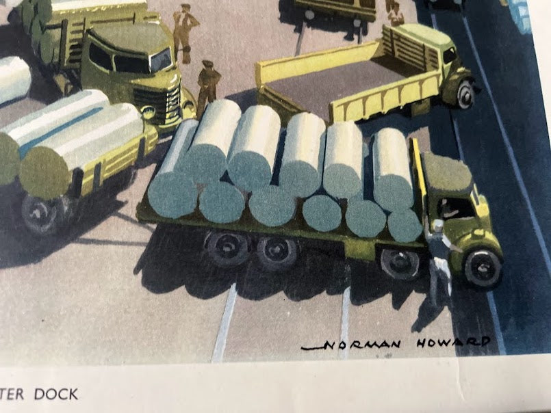A great example of mid century 'industrial' art - a 1950s school poster depicting Rolls of newspaper being loaded and unloaded at a Manchester docks. Beautiful sharp colourful artwork, will look great on any wall.! A stunning and very cool modernist image..