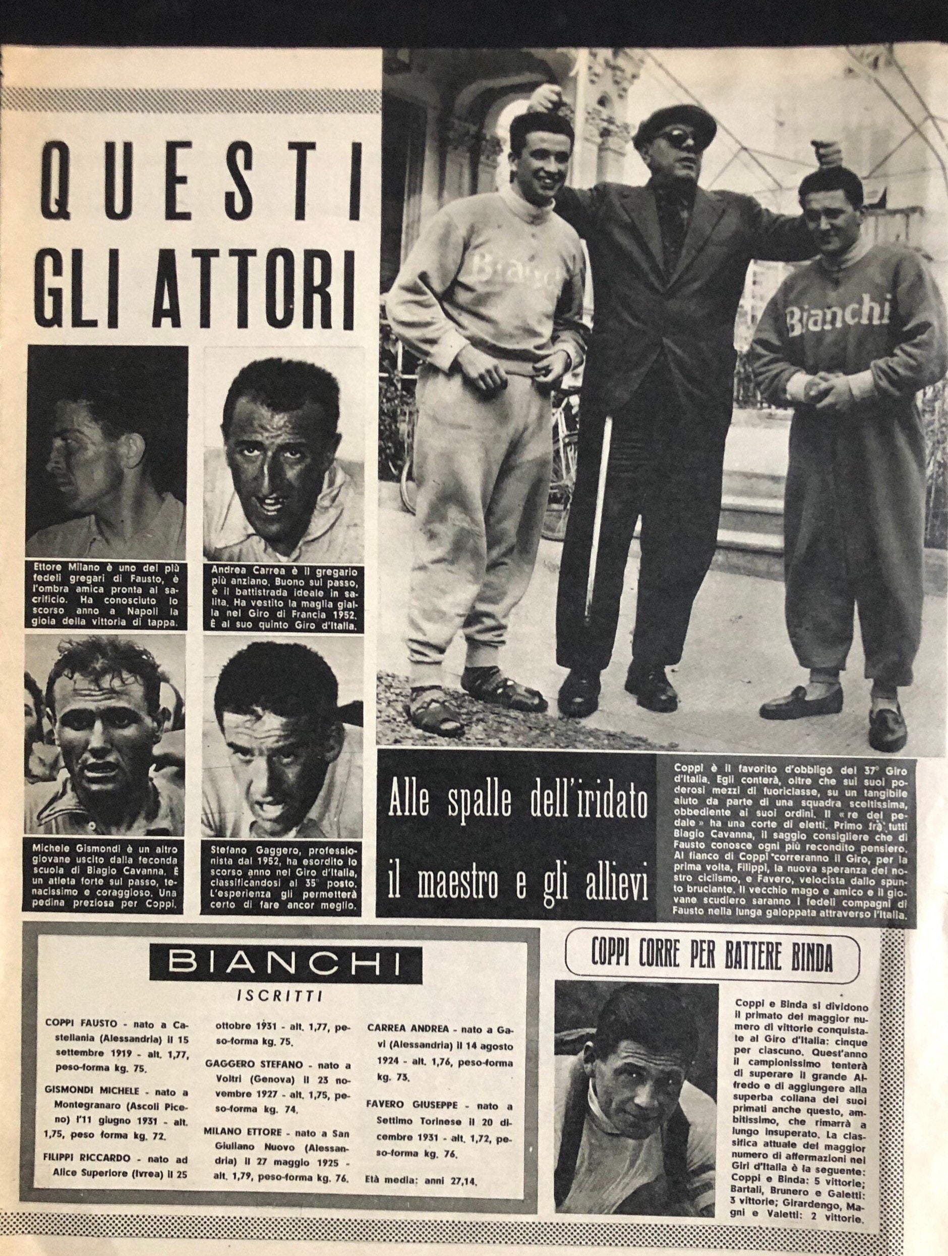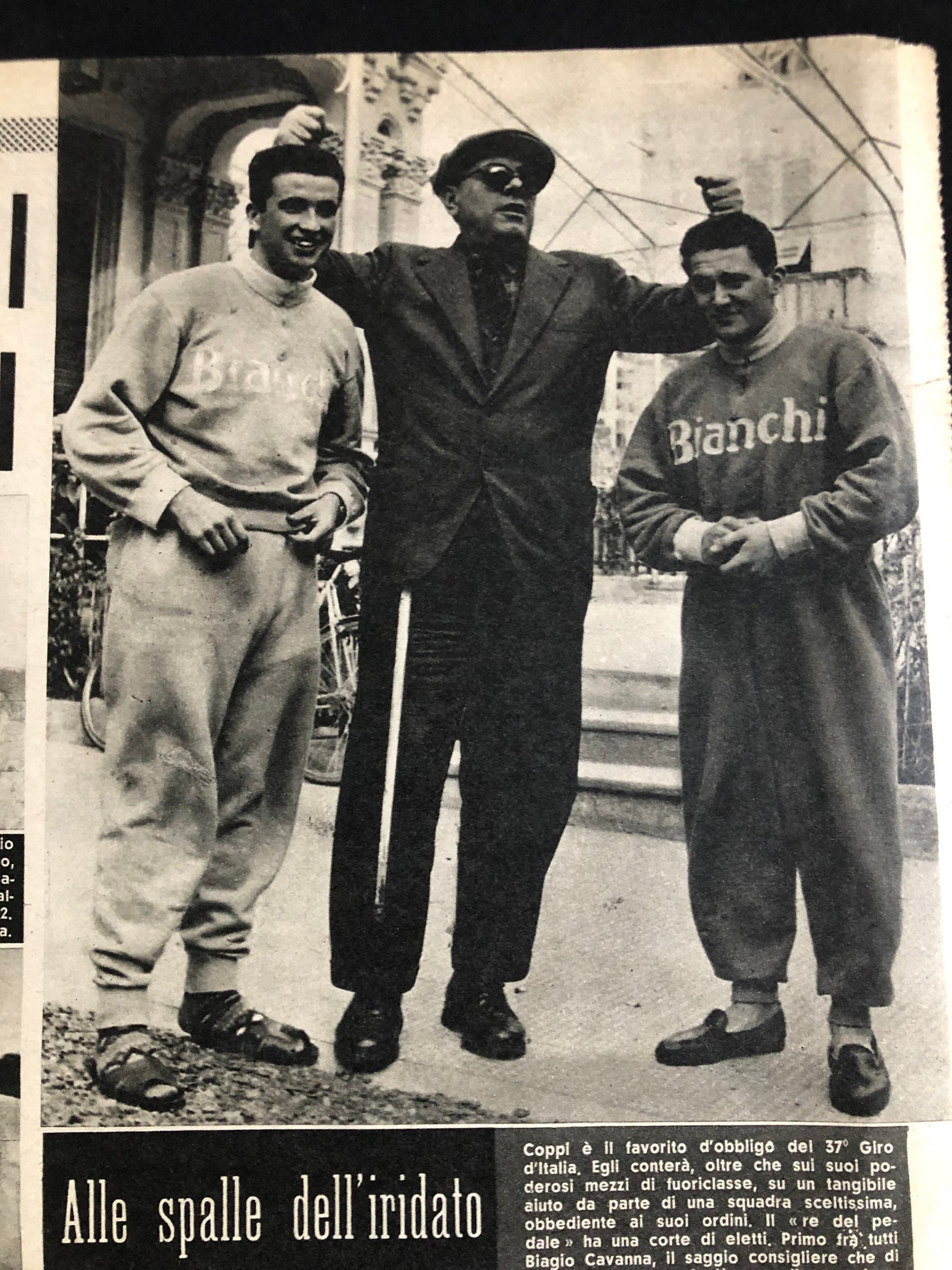 Very rare Original 1953 Italian cycling magazine print featuring iconic cycling coach Biagio Cavanna with members of the Bianchi team. Would look excellent framed.