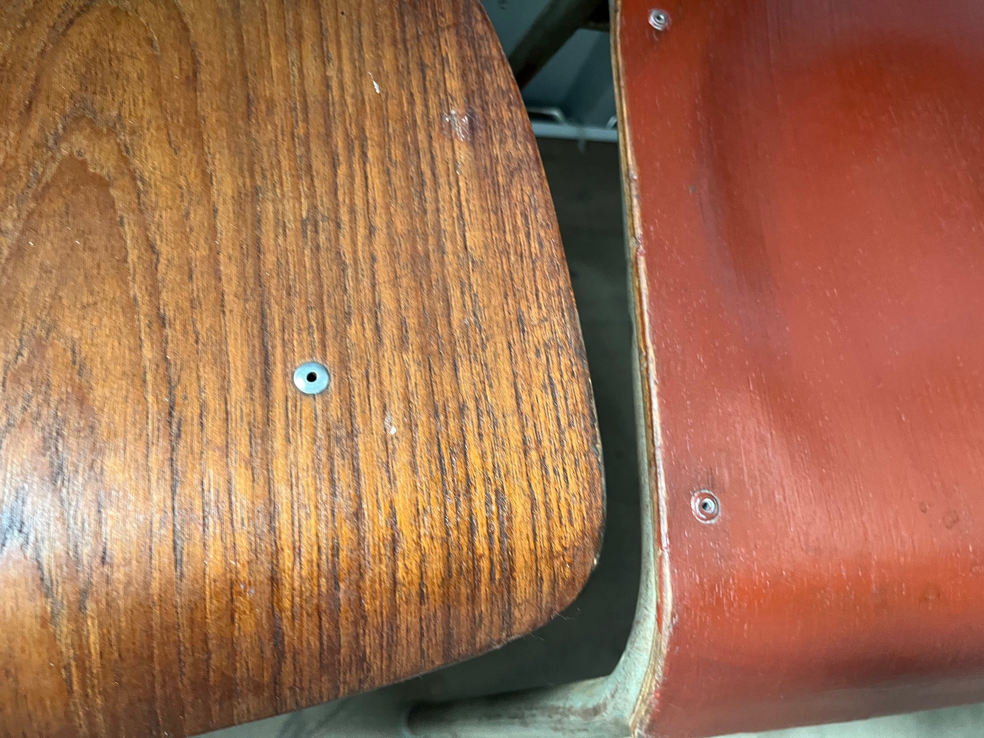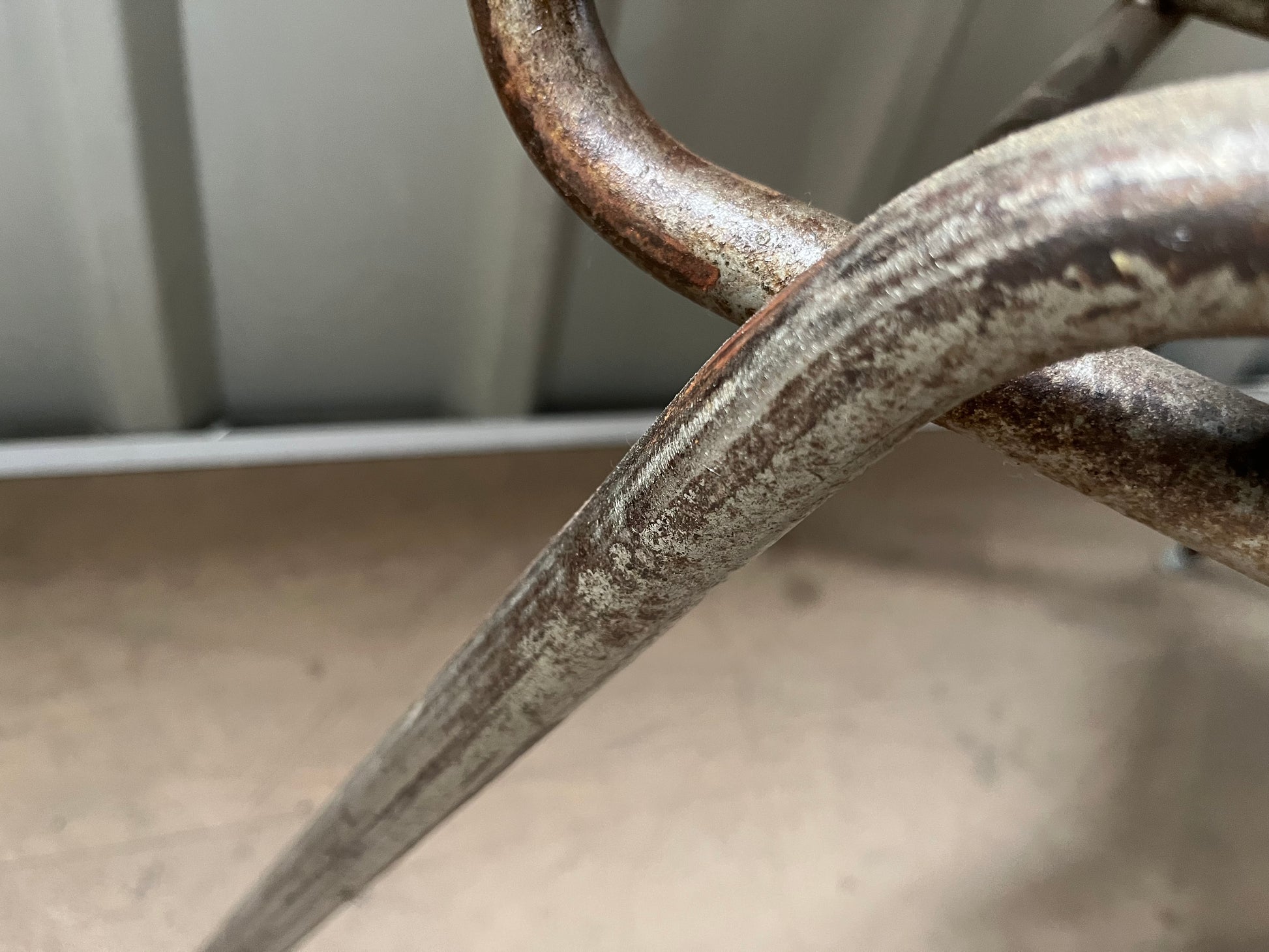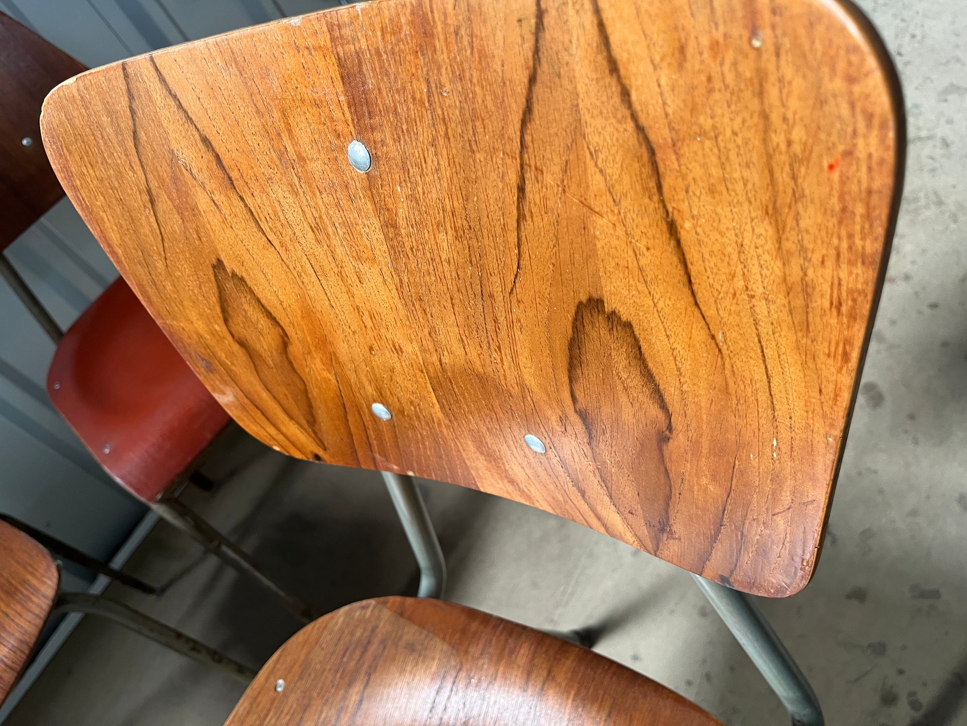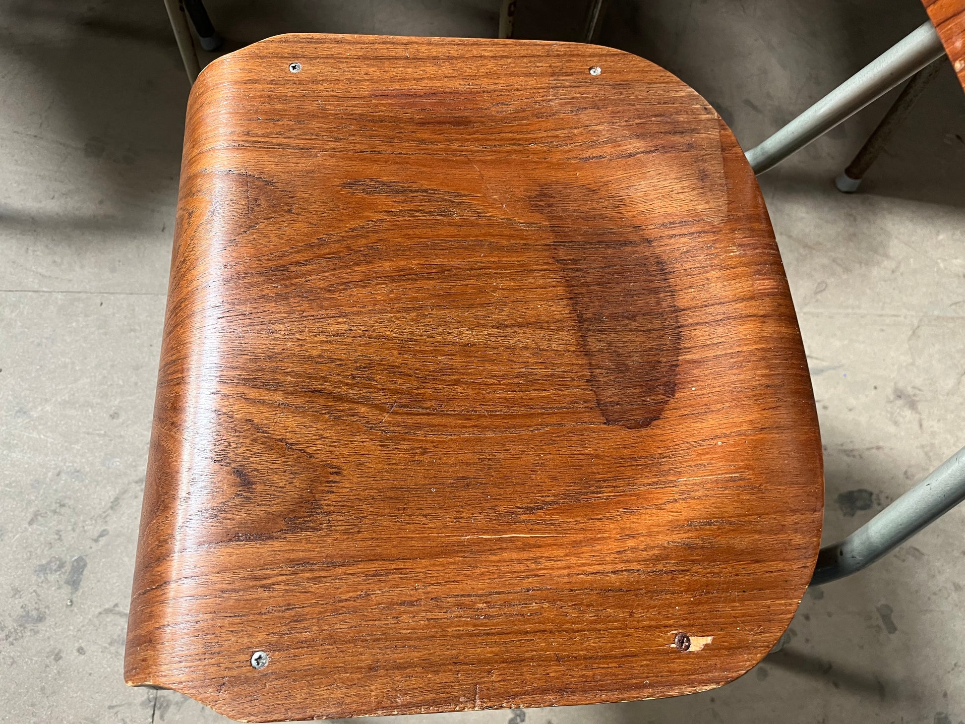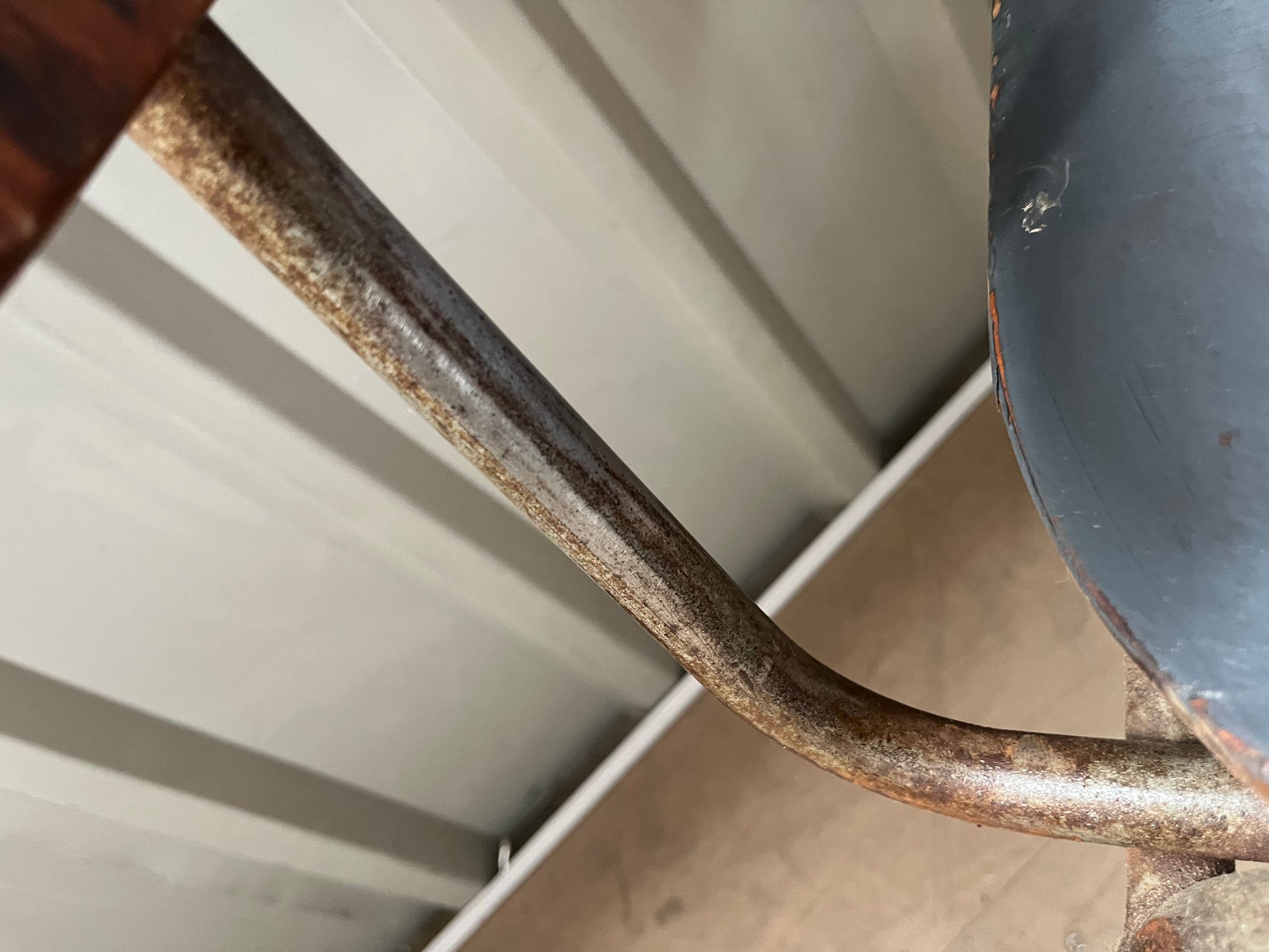 The chairs have been checked, cleaned, painted and waxed. They are otherwise unrestored with paint loss / patination to the metal legs. They are painted in contrasting colours. Please note that these are used items and some will have wear / patination and surface rust although this has been cleaned and waxed