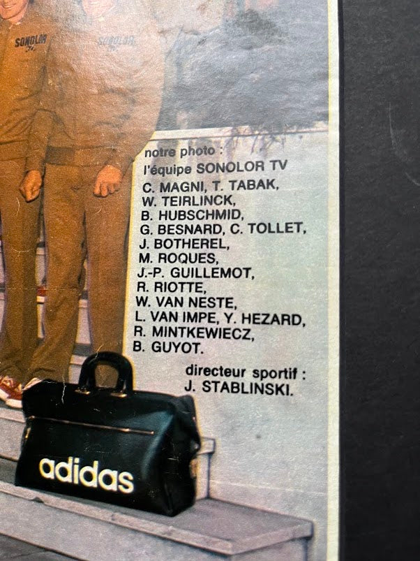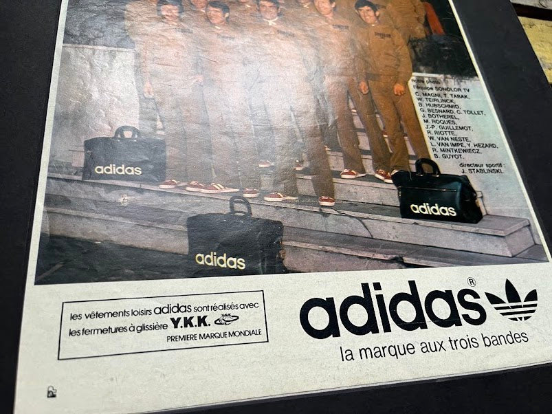 Very rare 1975 Adidas print advertisement featuring the Sonorlor french cycling team in Adidas tracksuits and Gazelle trainers..