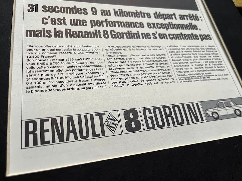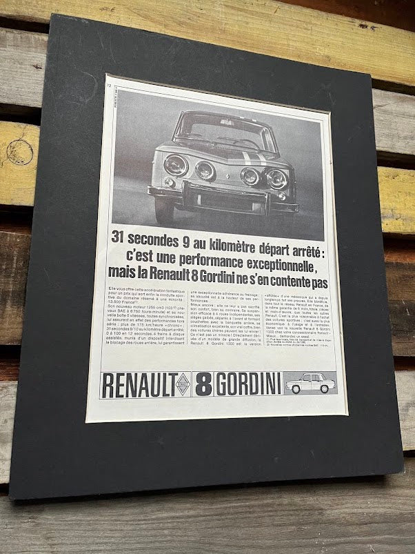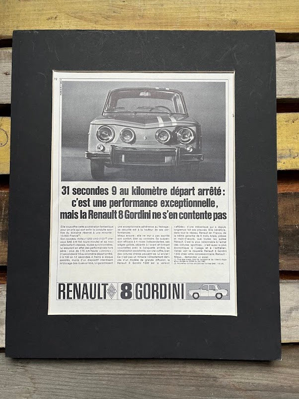 Original Renault 8 Gordini advertisement, in french language mounted and ready for framing. This is an original print and not a scanned copy. A superb piece of artwork.