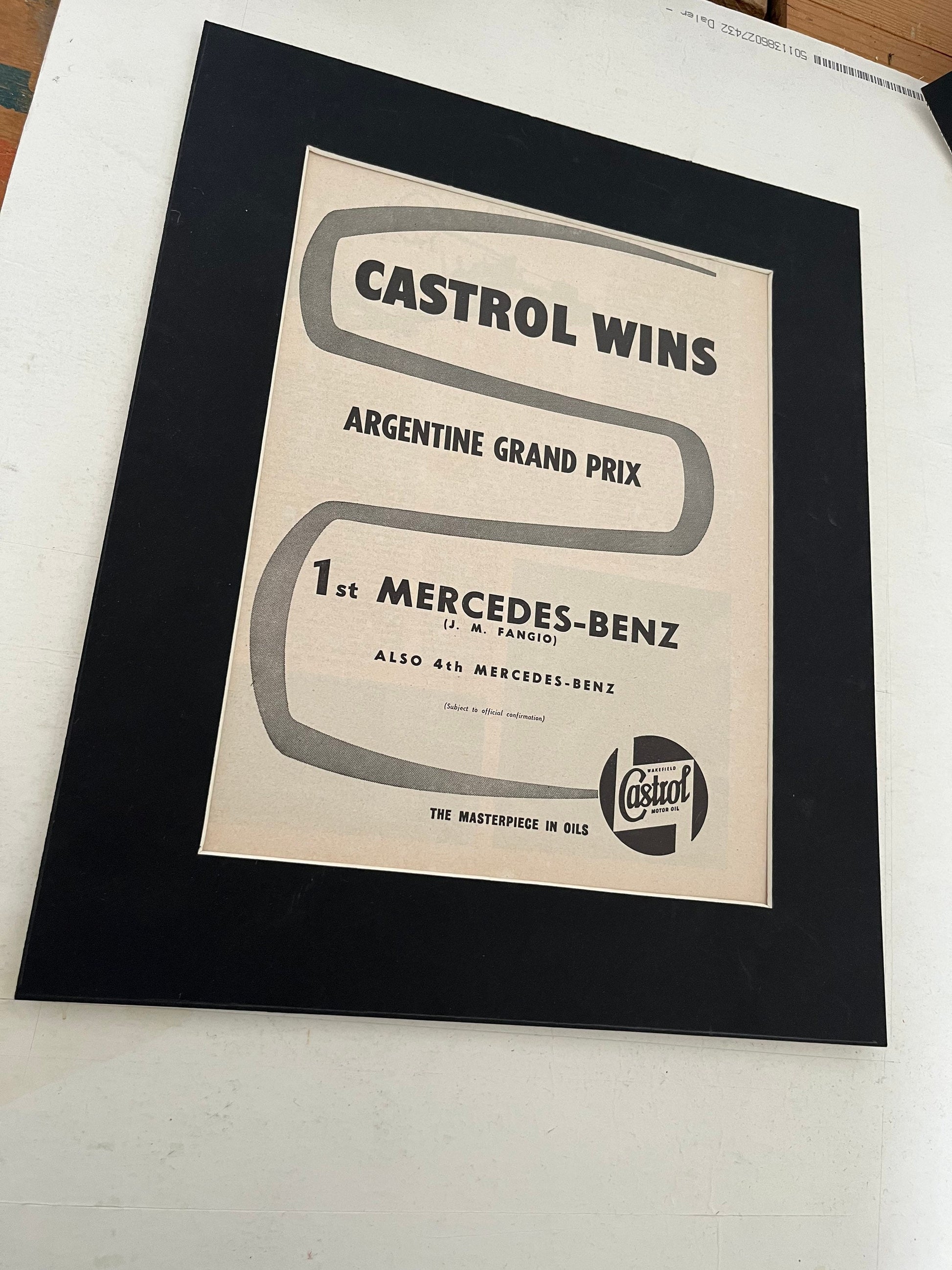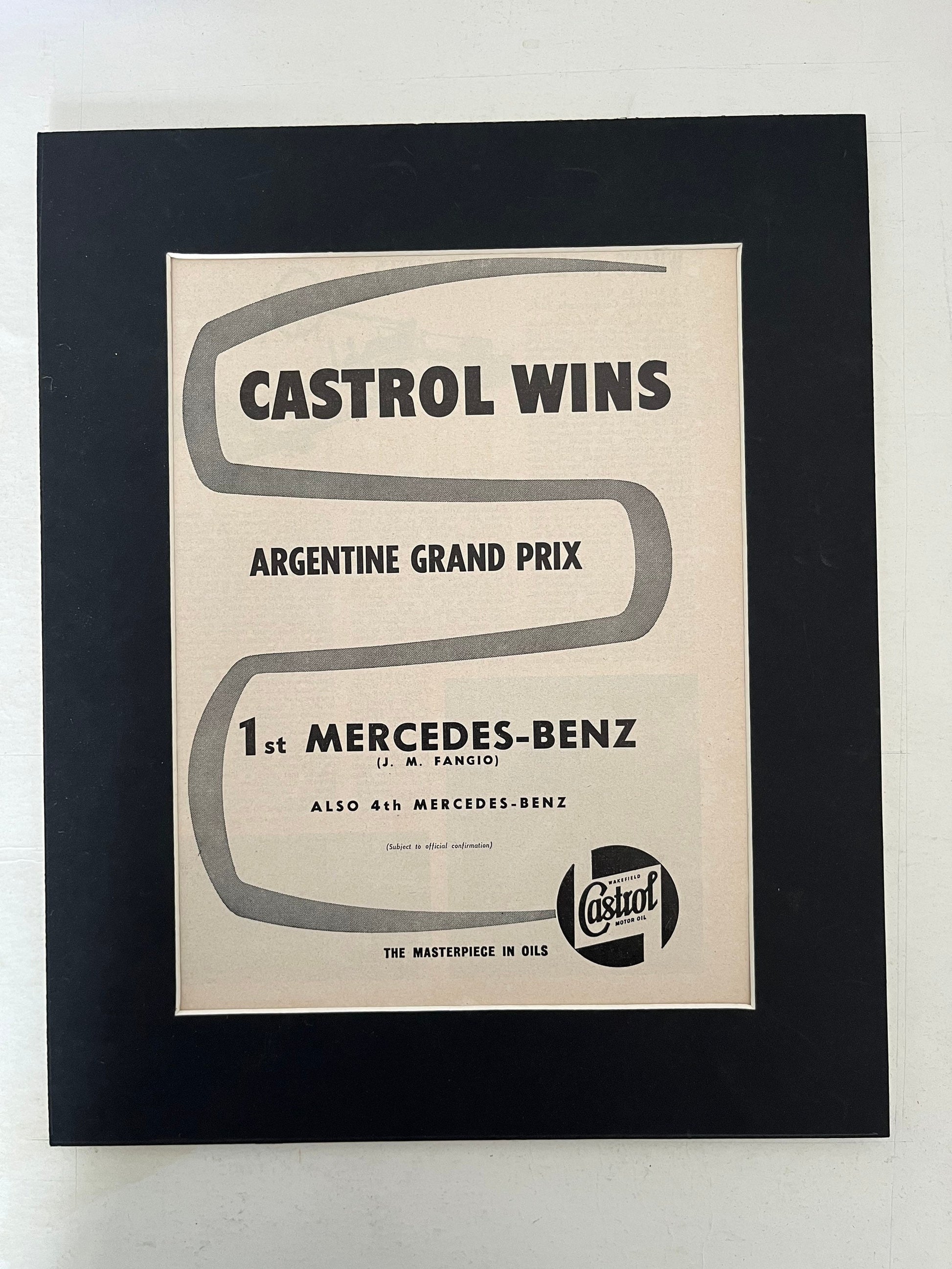 Rare and original 1955 magazine print advertisement for Castrol oil having won the Argentinian Grand Prix prix with Juan Manuel Fangio in his Mercedes. This is an original print and not a scanned copy.. A superb piece of artwork A stylish vintage piece of artwork for the lounge, workshop or study. and an excellent gift for the motoring enthusiast. Please note: Your print will be shipped in cardboard packaging to protect it during transit, minus the card surround.