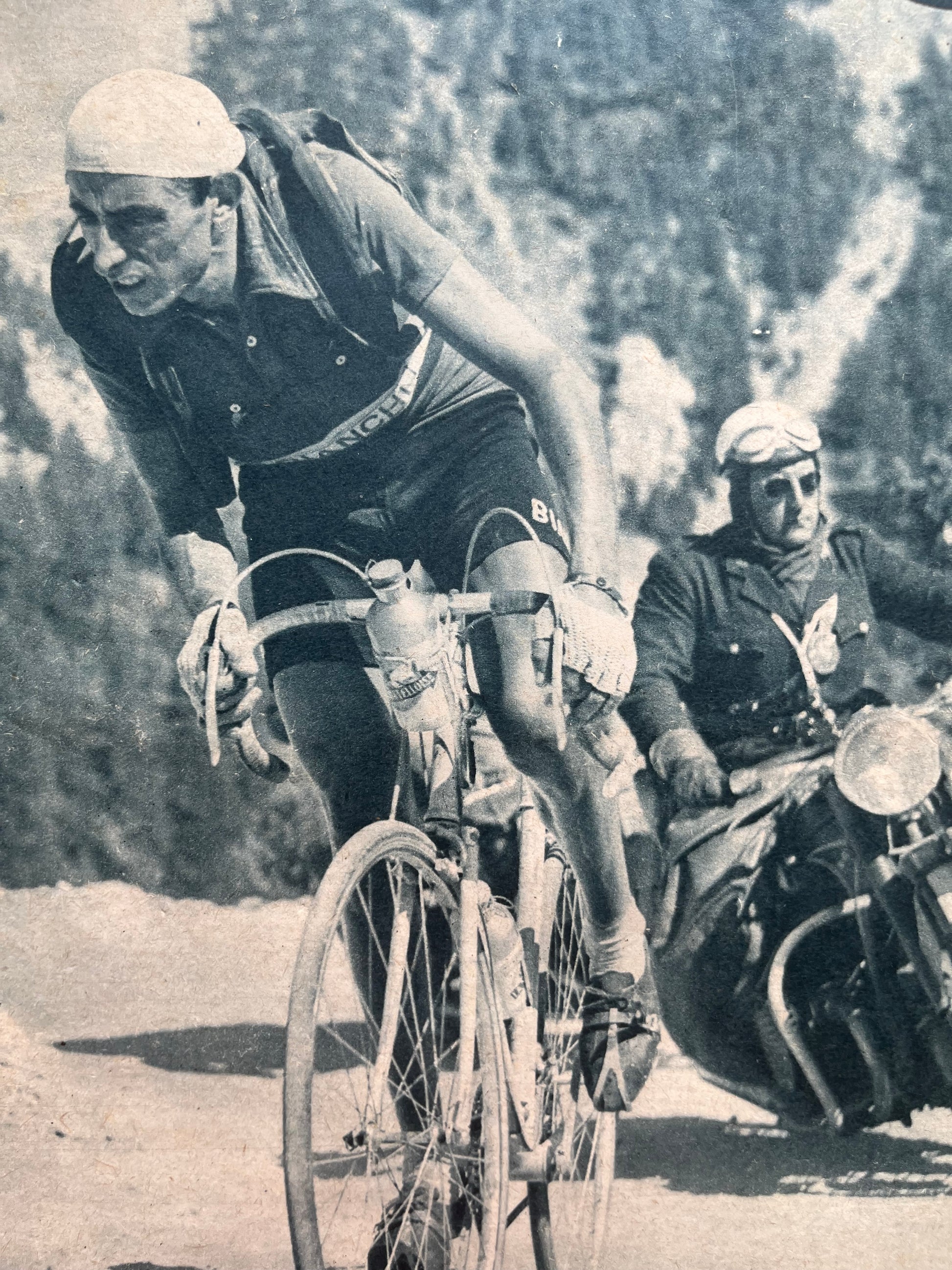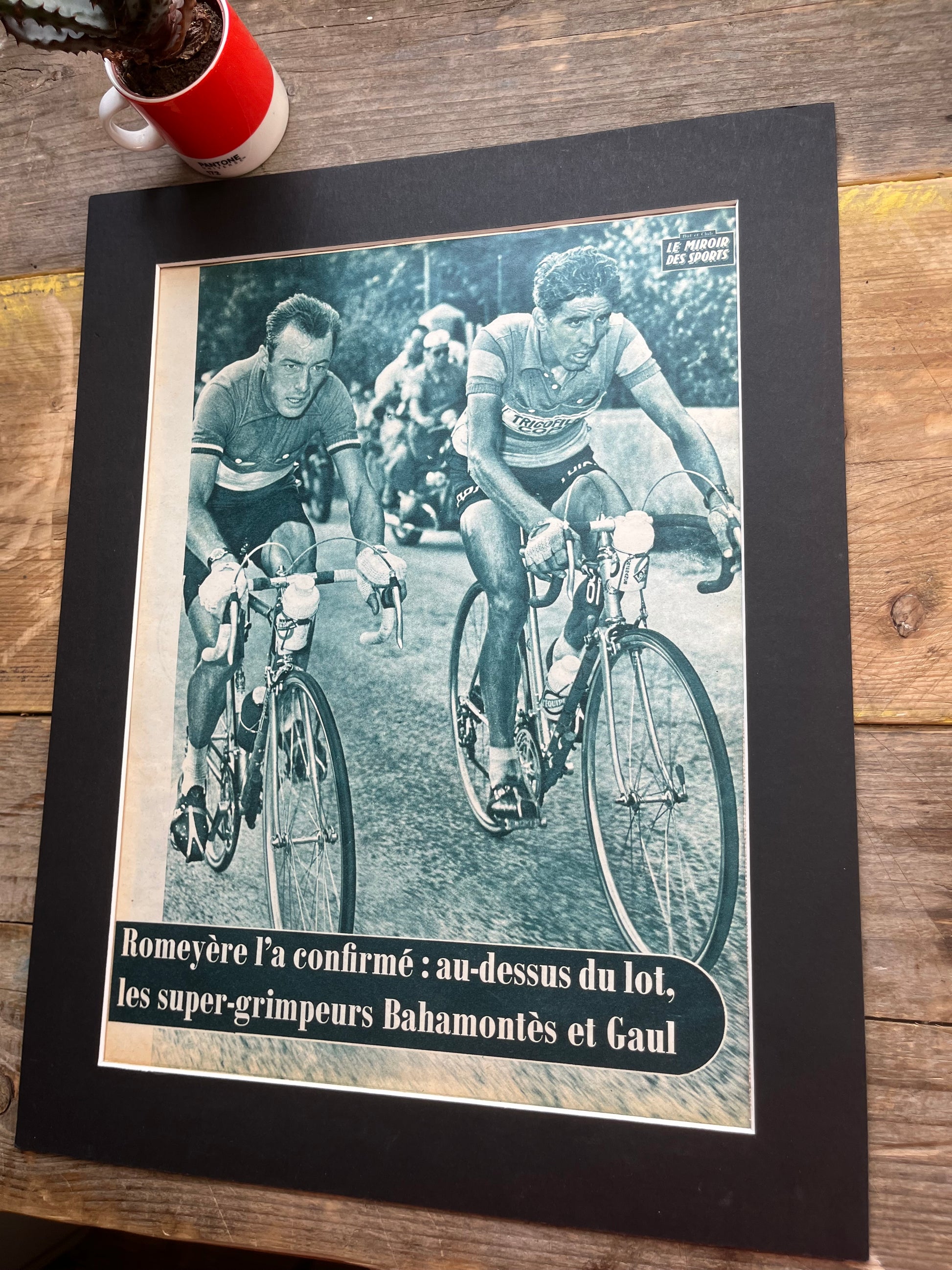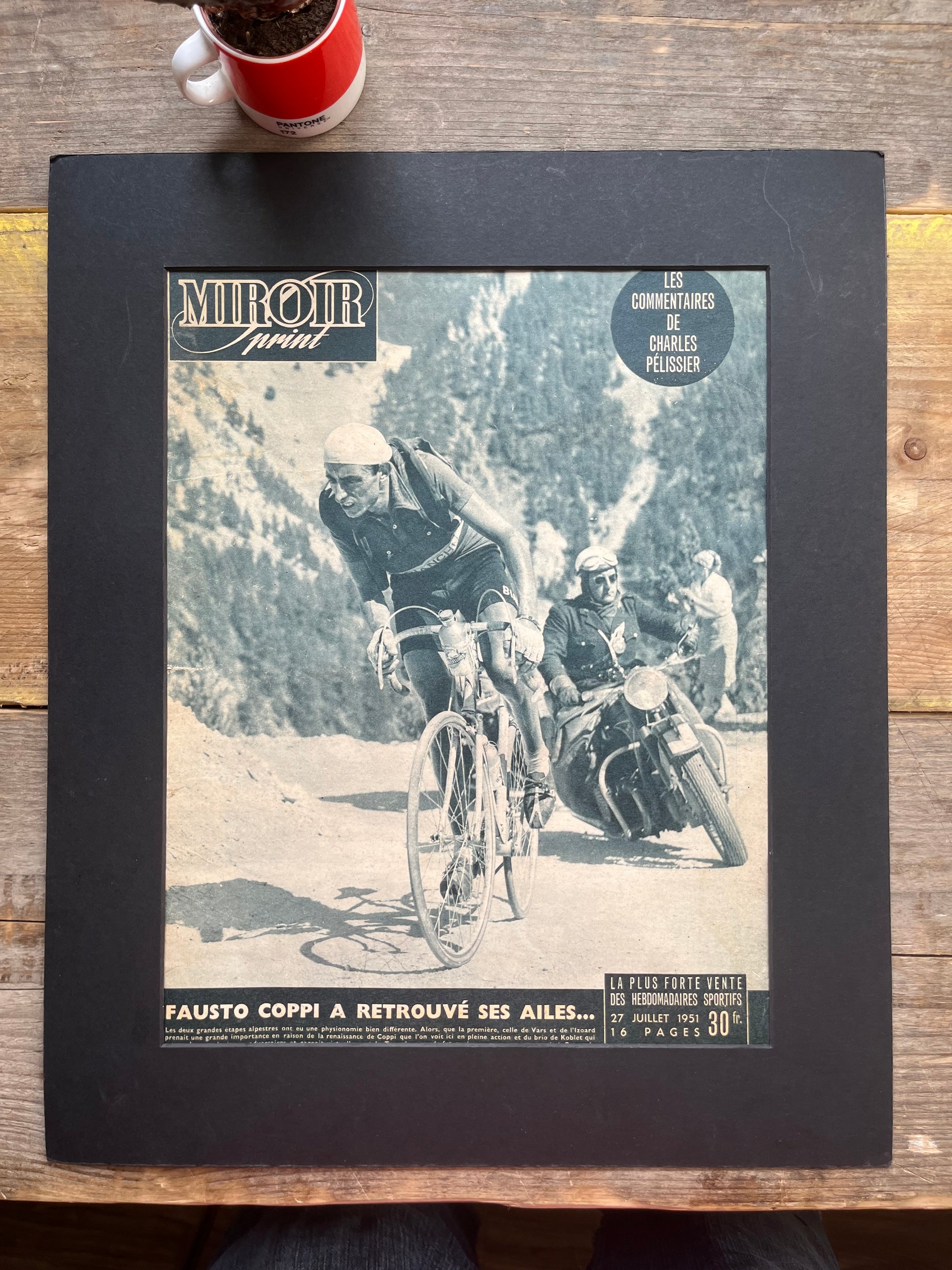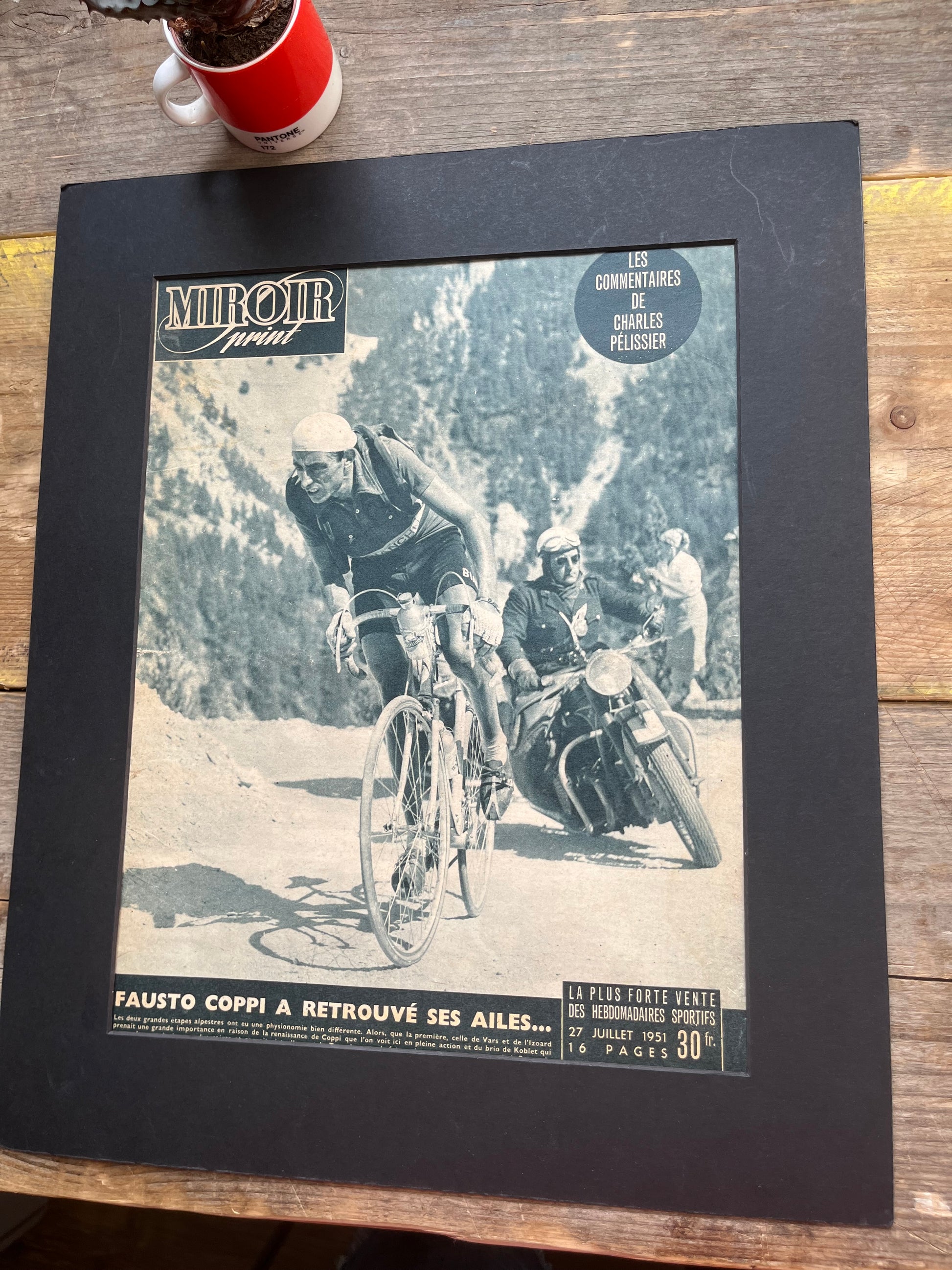 An Iconic and very rare Original I1949 french cycling magazine print featuring 'Il campionissimo' Fausto Coppi in Bianchi team kit in the alps stages of the Tour de France that year. A fantastic action shot with a stunning backdrop of the alps.